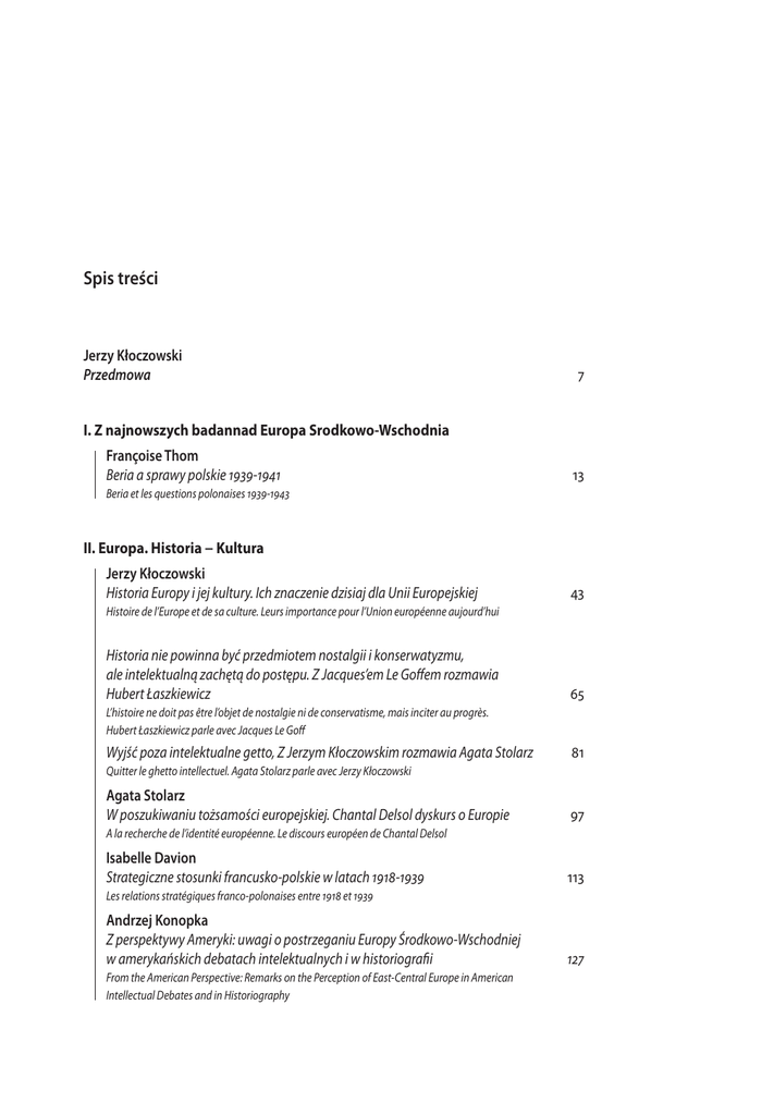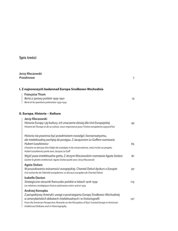 Spis treści Jerzy Kłoczowski Przedmowa 7 I. Z najnowszych badannad Europa Srodkowo-Wschodnia Françoise Thom Beria a sprawy polskie 1939-1941 13 Beria et les questions polonaises 1939-1943 II. Europa. Historia − Kultura Jerzy Kłoczowski Historia Europy i jej kultury. Ich znaczenie dzisiaj dla Unii Europejskiej 43 Histoire de l’Europe et de sa culture. Leurs importance pour l’Union européenne aujourd’hui Historia nie powinna być przedmiotem nostalgii i konserwatyzmu, ale intelektualną zachętą do postępu. Z Jacques’em Le Goffem rozmawia Hubert Łaszkiewicz 65 L’histoire ne doit pas être l’objet de nostalgie ni de conservatisme, mais inciter au progrès. Hubert Łaszkiewicz parle avec Jacques Le Goff Wyjść poza intelektualne getto, Z Jerzym Kłoczowskim rozmawia Agata Stolarz 81 Quitter le ghetto intellectuel. Agata Stolarz parle avec Jerzy Kłoczowski Agata Stolarz W poszukiwaniu tożsamości europejskiej. Chantal Delsol dyskurs o Europie 97 A la recherche de l’identité européenne. Le discours européen de Chantal Delsol Isabelle Davion Strategiczne stosunki francusko‑polskie w latach 1918-1939 113 Les relations stratégiques franco-polonaises entre 1918 et 1939 Andrzej Konopka Z perspektywy Ameryki: uwagi o postrzeganiu Europy Środkowo-Wschodniej w amerykańskich debatach intelektualnych i w historiografii From the American Perspective: Remarks on the Perception of East-Central Europe in American Intellectual Debates and in Historiography 127 Recenzje Tomasz Siewierski Gerard Labuda, O historykach. Kto jest kim w dziejopisarstwie polskim?, Wydawnictwo Poznańskie, Poznań 2010 157 Tomasz Siewierski Wybitni historycy wielkopolscy, red. J. Strzelczyk, wyd. 2, Wydawnictwo Poznańskie, Poznań 2010 163 Hanna Bazhenova Joanna Schiller, Universitas Rossica. Koncepcja rosyjskiego uniwersytetu 1863-1917, Warszawa 2008, Wydawnictwo Retro-Art, Monografie z Dziejów Oświaty, pod red. Józefa Miąso, tom XLI 169 Mirosław Filipowicz Patryk Pleskot, Intelektualni sąsiedzi. Kontakty historyków polskich ze środowiskiem „Annales” 1945-1989, Warszawa 2010, Monografie Instytutu Pamięci Narodowej, t. 64 Marcin Kula, Mimo wszystko bliżej Paryża niż Moskwy. Książka o Francji, PRL i o nas, historykach, Warszawa 2010, Wydawnictwa Uniwersytetu Warszawskiego 179 Mirosław Filipowicz Antony Polonsky, The Jews in Poland and Russia, t. 1: 1350 to 1881, Oxford–Portland 2010, t. 2: 1881 to 1914, Oxford–Portland 2010 187 Kronika Kronika Instytutu Europy Środkowo‑wschodniej Towarzystwo Instytutu Europy Środkowo-Wschodniejw latach 2010-2011 193 205 Sprawozdania 215 In Memoriam 227