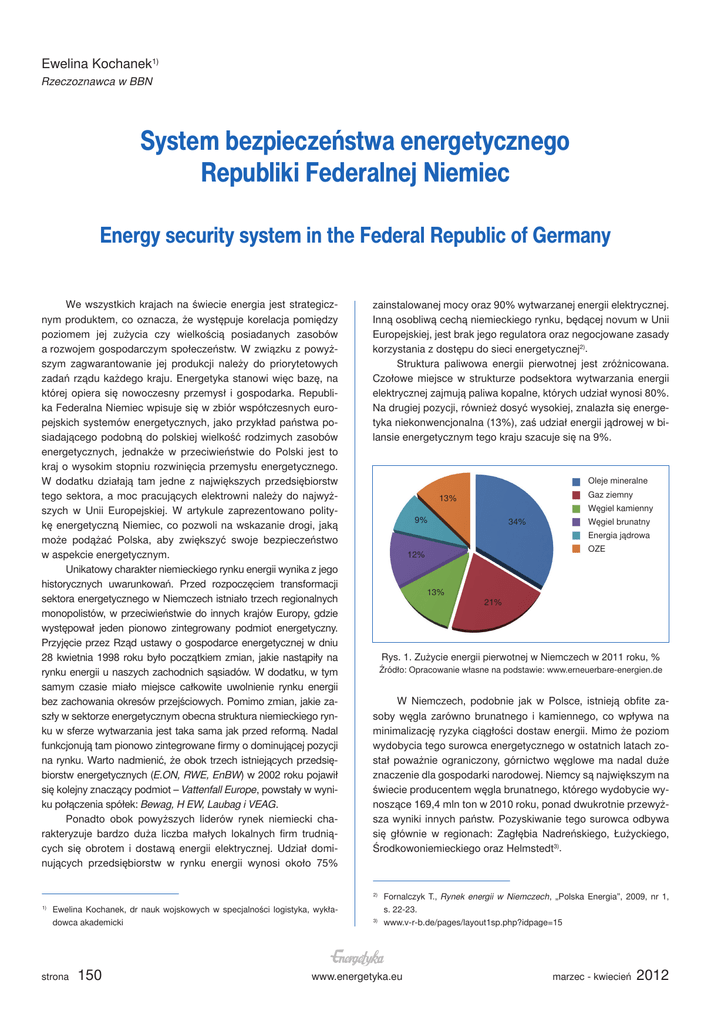 Ewelina Kochanek1) Rzeczoznawca w BBN System bezpieczeństwa energetycznego Republiki Federalnej Niemiec Energy security system in the Federal Republic of Germany We wszystkich krajach na świecie energia jest strategicznym produktem, co oznacza, że występuje korelacja pomiędzy poziomem jej zużycia czy wielkością posiadanych zasobów a rozwojem gospodarczym społeczeństw. W związku z powyższym zagwarantowanie jej produkcji należy do priorytetowych zadań rządu każdego kraju. Energetyka stanowi więc bazę, na której opiera się nowoczesny przemysł i gospodarka. Republika Federalna Niemiec wpisuje się w zbiór współczesnych europejskich systemów energetycznych, jako przykład państwa posiadającego podobną do polskiej wielkość rodzimych zasobów energetycznych, jednakże w przeciwieństwie do Polski jest to kraj o wysokim stopniu rozwinięcia przemysłu energetycznego. W dodatku działają tam jedne z największych przedsiębiorstw tego sektora, a moc pracujących elektrowni należy do najwyższych w Unii Europejskiej. W artykule zaprezentowano politykę energetyczną Niemiec, co pozwoli na wskazanie drogi, jaką może podążać Polska, aby zwiększyć swoje bezpieczeństwo w aspekcie energetycznym. Unikatowy charakter niemieckiego rynku energii wynika z jego historycznych uwarunkowań. Przed rozpoczęciem transformacji sektora energetycznego w Niemczech istniało trzech regionalnych monopolistów, w przeciwieństwie do innych krajów Europy, gdzie występował jeden pionowo zintegrowany podmiot energetyczny. Przyjęcie przez Rząd ustawy o gospodarce energetycznej w dniu 28 kwietnia 1998 roku było początkiem zmian, jakie nastąpiły na rynku energii u naszych zachodnich sąsiadów. W dodatku, w tym samym czasie miało miejsce całkowite uwolnienie rynku energii bez zachowania okresów przejściowych. Pomimo zmian, jakie zaszły w sektorze energetycznym obecna struktura niemieckiego rynku w sferze wytwarzania jest taka sama jak przed reformą. Nadal funkcjonują tam pionowo zintegrowane firmy o dominującej pozycji na rynku. Warto nadmienić, że obok trzech istniejących przedsiębiorstw energetycznych (E.ON, RWE, EnBW) w 2002 roku pojawił się kolejny znaczący podmiot – Vattenfall Europe, powstały w wyniku połączenia spółek: Bewag, H EW, Laubag i VEAG. Ponadto obok powyższych liderów rynek niemiecki charakteryzuje bardzo duża liczba małych lokalnych firm trudniących się obrotem i dostawą energii elektrycznej. Udział dominujących przedsiębiorstw w rynku energii wynosi około 75% z ainstalowanej mocy oraz 90% wytwarzanej energii elektrycznej. Inną osobliwą cechą niemieckiego rynku, będącej novum w Unii Europejskiej, jest brak jego regulatora oraz negocjowane zasady korzystania z dostępu do sieci energetycznej2). Struktura paliwowa energii pierwotnej jest zróżnicowana. Czołowe miejsce w strukturze podsektora wytwarzania energii elektrycznej zajmują paliwa kopalne, których udział wynosi 80%. Na drugiej pozycji, również dosyć wysokiej, znalazła się energetyka niekonwencjonalna (13%), zaś udział energii jądrowej w bilansie energetycznym tego kraju szacuje się na 9%. Oleje mineralne Węgiel kamienny 9% Ewelina Kochanek, dr nauk wojskowych w specjalności logistyka, wykładowca akademicki strona 150 34% Węgiel brunatny Energia jądrowa OZE 12% 13% 21% Rys. 1. Zużycie energii pierwotnej w Niemczech w 2011 roku, % Źródło: Opracowanie własne na podstawie: www.erneuerbare-energien.de W Niemczech, podobnie jak w Polsce, istnieją obfite zasoby węgla zarówno brunatnego i kamiennego, co wpływa na minimalizację ryzyka ciągłości dostaw energii. Mimo że poziom wydobycia tego surowca energetycznego w ostatnich latach został poważnie ograniczony, górnictwo węglowe ma nadal duże znaczenie dla gospodarki narodowej. Niemcy są największym na świecie producentem węgla brunatnego, którego wydobycie wynoszące 169,4 mln ton w 2010 roku, ponad dwukrotnie przewyższa wyniki innych państw. Pozyskiwanie tego surowca odbywa się głównie w regionach: Zagłębia Nadreńskiego, Łużyckiego, Środkowoniemieckiego oraz Helmstedt3). 2) 1) Gaz ziemny 13% 3) Fornalczyk T., Rynek energii w Niemczech, „Polska Energia”, 2009, nr 1, s. 22-23. www.v-r-b.de/pages/layout1sp.php?idpage=15 www.energetyka.eu marzec - kwiecień 2012 Warto zaznaczyć, iż w 2007 roku rząd Niemiec zatwierdził plan zamknięcia wszystkich kopalni węgla kamiennego do 2018 roku. Jest to wynikiem deficytowości tej branży, której utrzymanie kosztuje skarb państwa 2,5 mln euro rocznie. Obecnie węgiel kamienny wydobywany jest w pięciu kopalniach położonych w Zagłębiu Ruhry i Saary oraz w Ibbenbüren. W latach sześćdziesiątych ubiegłego stulecia pozyskiwanie tego surowca utrzymywało się na poziomie 150 mln ton rocznie, zaś obecnie wynosi ono 14,5 mln ton. Aby zaspokoić krajowy popyt, niezbędny jest import tego paliwa kopalnego, którego głównymi dostawcami są: Rosja, Kolumbia oraz Polska. W okresie ostatnich 20 lat przeprowadzona została modernizacja połowy mocy wytwórczych, co stanowiło dla niemieckiej energetyki poważne wyzwanie w aspekcie nowych wytycznych zawartych w pakiecie klimatyczno–energetycznym Unii Europejskiej. Innym ważnym składnikiem bilansu energetycznego jest gaz ziemny. Niemcy są trzecim po Wielkiej Brytanii i Włoszech europejskim konsumentem tego surowca. Niemiecki rynek gazu jest w dodatku najbardziej dojrzałym w Unii Europejskiej, czego wyrazem jest udział zużycia gazu w bilansie energii pierwotnej sięgający 90 mld m3. Największym producentem tego paliwa jest Dolna Saksonia, gdzie znajdują się najefektywniejsze złoża tego surowca w Niemczech. Niestety kraj ten nie posiada własnych znacznych ilości paliwa gazowego, w 2010 roku z rodzimego wydobycia pochodziło 11% zużycia tego nośnika (2008 r. – 14%). Wobec czego niezbędny jest import gazu ziemnego, który wynosi 89%. Największymi dostawcami tego