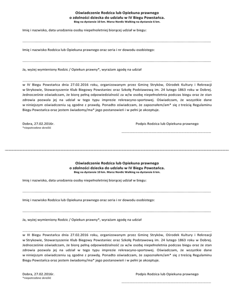 Oświadczenie Rodzica lub Opiekuna prawnego o zdolności dziecka do udziału w IV Biegu Powstańca. Bieg na dystansie 10 km. Marsz Nordic Walking na dystansie 6 km. Imię i nazwisko, data urodzenia osoby niepełnoletniej biorącej udział w biegu: .............................................................................................................................................................................................. Imię i nazwisko Rodzica lub Opiekuna prawnego oraz seria i nr dowodu osobistego: .............................................................................................................................................................................................. Ja, wyżej wymieniony Rodzic / Opiekun prawny*, wyrażam zgodę na udział ……………………………………………………………………………………………………………………………………………………………………………………….. w IV Biegu Powstańca dnia 27.02.2016 roku, organizowanym przez Gminę Stryków, Ośrodek Kultury i Rekreacji w Strykowie, Stowarzyszenie Klub Biegowy Powstaniec oraz Szkołę Podstawową im. 24 lutego 1863 roku w Dobrej. Jednocześnie oświadczam, że biorę pełną odpowiedzialność za w/w osobę niepełnoletnia podczas biegu oraz że stan zdrowia pozwala jej na udział w tego typu imprezie rekreacyno-‐sportowej. Oświadczam, że wszystkie dane w niniejszym oświadczeniu są zgodne z prawdą. Ponadto oświadczam, że zapoznałem/am* się z treścią Regulaminu Biegu Powstańca oraz jestem świadomy/ma* jego postanowień i w pełni je akceptuje. Dobra, 27.02.2016r. Podpis Rodzica lub Opiekuna prawnego *niepotrzebne skreślić ……………………………………………………………………………………… Oświadczenie Rodzica lub Opiekuna prawnego o zdolności dziecka do udziału w IV Biegu Powstańca. Bieg na dystansie 10 km. Marsz Nordic Walking na dystansie 6 km. Imię i nazwisko, data urodzenia osoby niepełnoletniej biorącej udział w biegu: .............................................................................................................................................................................................. Imię i nazwisko Rodzica lub Opiekuna prawnego oraz seria i nr dowodu osobistego: .............................................................................................................................................................................................. Ja, wyżej wymieniony Rodzic / Opiekun prawny*, wyrażam zgodę na udział ……………………………………………………………………………………………………………………………………………………………………………………….. w III Biegu Powstańca dnia 27.02.2016 roku, organizowanym przez Gminę Stryków, Ośrodek Kultury i Rekreacji w Strykowie, Stowarzyszenie Klub Biegowy Powstaniec oraz Szkołę Podstawową im. 24 lutego 1863 roku w Dobrej. Jednocześnie oświadczam, że biorę pełną odpowiedzialność za w/w osobę niepełnoletnia podczas biegu oraz że stan zdrowia pozwala jej na udział w tego typu imprezie rekreacyno-‐sportowej. Oświadczam, że wszystkie dane w niniejszym oświadczeniu są zgodne z prawdą. Ponadto oświadczam, że zapoznałem/am* się z treścią Regulaminu Biegu Powstańca oraz jestem świadomy/ma* jego postanowień i w pełni je akceptuje. Dobra, 27.02.2016r. Podpis Rodzica lub Opiekuna prawnego *niepotrzebne skreślić ………………………………………………………………………………………