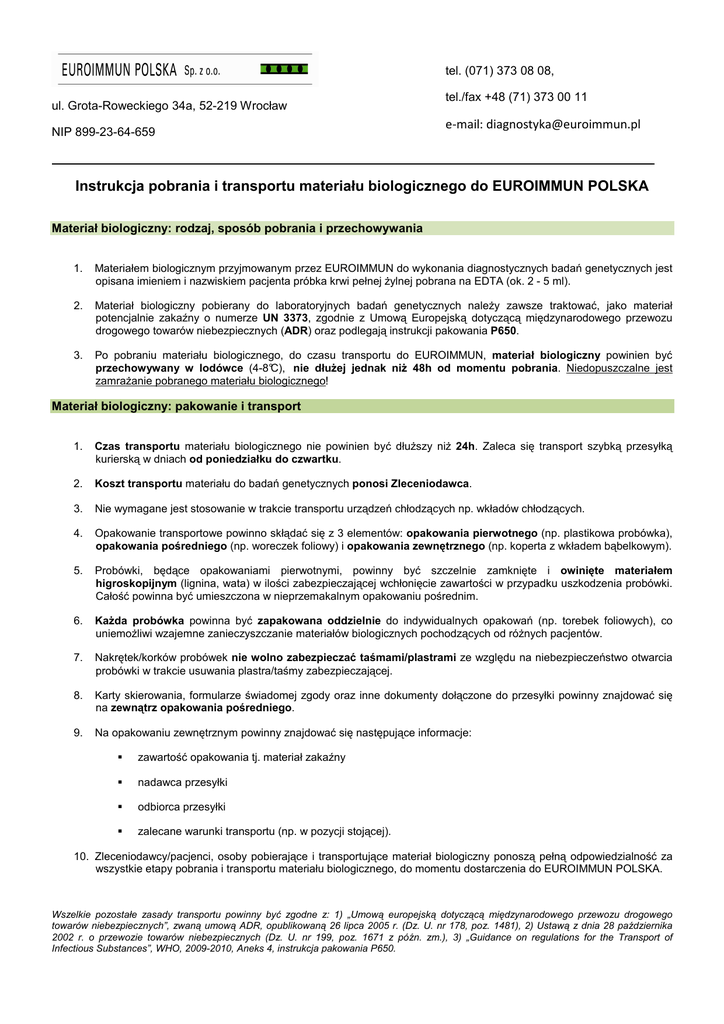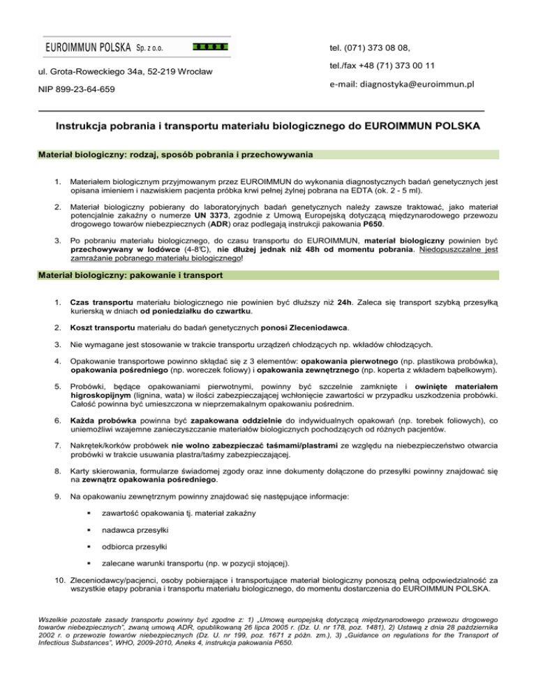 tel. (071) 373 08 08, ul. Grota-Roweckiego 34a, 52-219 Wrocław NIP 899-23-64-659 tel./fax +48 (71) 373 00 11 e-mail: [email protected] Instrukcja pobrania i transportu materiału biologicznego do EUROIMMUN POLSKA Materiał biologiczny: rodzaj, sposób pobrania i przechowywania 1. Materiałem biologicznym przyjmowanym przez EUROIMMUN do wykonania diagnostycznych badań genetycznych jest opisana imieniem i nazwiskiem pacjenta próbka krwi pełnej Ŝylnej pobrana na EDTA (ok. 2 - 5 ml). 2. Materiał biologiczny pobierany do laboratoryjnych badań genetycznych naleŜy zawsze traktować, jako materiał potencjalnie zakaźny o numerze UN 3373, zgodnie z Umową Europejską dotyczącą międzynarodowego przewozu drogowego towarów niebezpiecznych (ADR) oraz podlegają instrukcji pakowania P650. 3. Po pobraniu materiału biologicznego, do czasu transportu do EUROIMMUN, materiał biologiczny powinien być przechowywany w lodówce (4-8°C), nie dłuŜej jednak niŜ 48h od momentu pobrania. Niedopuszczalne jest zamraŜanie pobranego materiału biologicznego! Materiał biologiczny: pakowanie i transport 1. Czas transportu materiału biologicznego nie powinien być dłuŜszy niŜ 24h. Zaleca się transport szybką przesyłką kurierską w dniach od poniedziałku do czwartku. 2. Koszt transportu materiału do badań genetycznych ponosi Zleceniodawca. 3. Nie wymagane jest stosowanie w trakcie transportu urządzeń chłodzących np. wkładów chłodzących. 4. Opakowanie transportowe powinno skłądać się z 3 elementów: opakowania pierwotnego (np. plastikowa probówka), opakowania pośredniego (np. woreczek foliowy) i opakowania zewnętrznego (np. koperta z wkładem bąbelkowym). 5. Probówki, będące opakowaniami pierwotnymi, powinny być szczelnie zamknięte i owinięte materiałem higroskopijnym (lignina, wata) w ilości zabezpieczającej wchłonięcie zawartości w przypadku uszkodzenia probówki. Całość powinna być umieszczona w nieprzemakalnym opakowaniu pośrednim. 6. KaŜda probówka powinna być zapakowana oddzielnie do indywidualnych opakowań (np. torebek foliowych), co uniemoŜliwi wzajemne zanieczyszczanie materiałów biologicznych pochodzących od róŜnych pacjentów. 7. Nakrętek/korków probówek nie wolno zabezpieczać taśmami/plastrami ze względu na niebezpieczeństwo otwarcia probówki w trakcie usuwania plastra/taśmy zabezpieczającej. 8. Karty skierowania, formularze świadomej zgody oraz inne dokumenty dołączone do przesyłki powinny znajdować się na zewnątrz opakowania pośredniego. 9. Na opakowaniu zewnętrznym powinny znajdować się następujące informacje: zawartość opakowania tj. materiał zakaźny nadawca przesyłki odbiorca przesyłki zalecane warunki transportu (np. w pozycji stojącej). 10. Zleceniodawcy/pacjenci, osoby pobierające i transportujące materiał biologiczny ponoszą pełną odpowiedzialność za wszystkie etapy pobrania i transportu materiału biologicznego, do momentu dostarczenia do EUROIMMUN POLSKA. Wszelkie pozostałe zasady transportu powinny być zgodne z: 1) „Umową europejską dotyczącą międzynarodowego przewozu drogowego towarów niebezpiecznych”, zwaną umową ADR, opublikowaną 26 lipca 2005 r. (Dz. U. nr 178, poz. 1481), 2) Ustawą z dnia 28 października 2002 r. o przewozie towarów niebezpiecznych (Dz. U. nr 199, poz. 1671 z późn. zm.), 3) „Guidance on regulations for the Transport of Infectious Substances”, WHO, 2009-2010, Aneks 4, instrukcja pakowania P650.