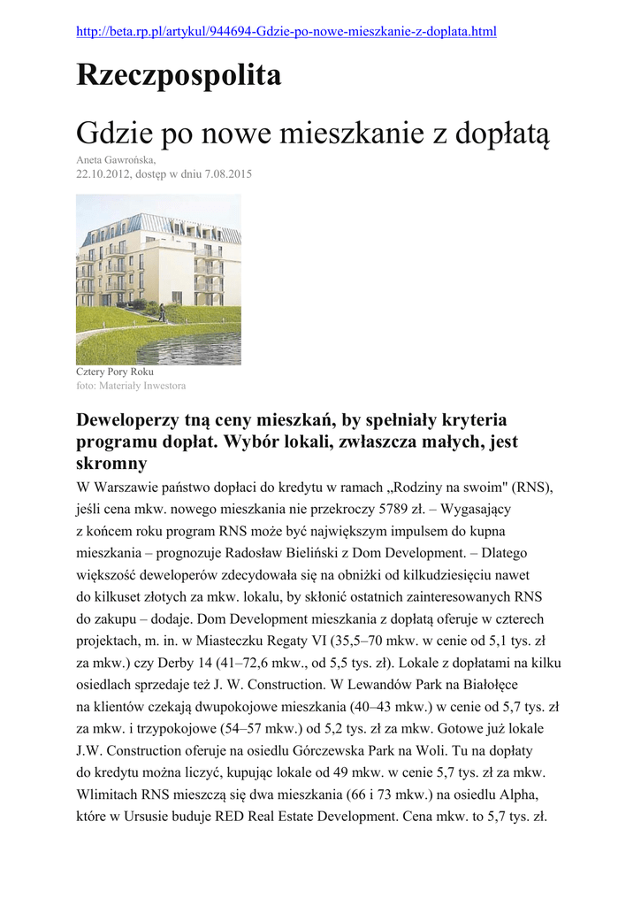 http://beta.rp.pl/artykul/944694-Gdzie-po-nowe-mieszkanie-z-doplata.html Rzeczpospolita Gdzie po nowe mieszkanie z dopłatą Aneta Gawrońska, 22.10.2012, dostęp w dniu 7.08.2015 Cztery Pory Roku foto: Materiały Inwestora Deweloperzy tną ceny mieszkań, by spełniały kryteria programu dopłat. Wybór lokali, zwłaszcza małych, jest skromny W Warszawie państwo dopłaci do kredytu w ramach „Rodziny na swoim" (RNS), jeśli cena mkw. nowego mieszkania nie przekroczy 5789 zł. – Wygasający z końcem roku program RNS może być największym impulsem do kupna mieszkania – prognozuje Radosław Bieliński z Dom Development. – Dlatego większość deweloperów zdecydowała się na obniżki od kilkudziesięciu nawet do kilkuset złotych za mkw. lokalu, by skłonić ostatnich zainteresowanych RNS do zakupu – dodaje. Dom Development mieszkania z dopłatą oferuje w czterech projektach, m. in. w Miasteczku Regaty VI (35,5–70 mkw. w cenie od 5,1 tys. zł za mkw.) czy Derby 14 (41–72,6 mkw., od 5,5 tys. zł). Lokale z dopłatami na kilku osiedlach sprzedaje też J. W. Construction. W Lewandów Park na Białołęce na klientów czekają dwupokojowe mieszkania (40–43 mkw.) w cenie od 5,7 tys. zł za mkw. i trzypokojowe (54–57 mkw.) od 5,2 tys. zł za mkw. Gotowe już lokale J.W. Construction oferuje na osiedlu Górczewska Park na Woli. Tu na dopłaty do kredytu można liczyć, kupując lokale od 49 mkw. w cenie 5,7 tys. zł za mkw. Wlimitach RNS mieszczą się dwa mieszkania (66 i 73 mkw.) na osiedlu Alpha, które w Ursusie buduje RED Real Estate Development. Cena mkw. to 5,7 tys. zł. Mieszkania z dopłatą – od 34 do 70 mkw. – można też znaleźć na białołęckim osiedlu Cztery Pory Roku firmy Murapol. 5789 zł Cena metra nowego mieszkania w stolicy nie może przekroczyć tej kwoty, jeśli chcemy kupić lokal na kredyt z dopłatą. Spółka Neocity mieszkania o powierzchni 50–71 mkw. w cenie 5,7 tys. zł za mkw. oferuje na ursuskim osiedlu NeoVillage. Trzypokojowe lokale na preferencyjny kredyt można kupić na trzech osiedlach firmy Bouygues Immobilier Polska: Carré Arte na Woli (55–64 mkw.), Patio Avenir na Bemowie (60–62 mkw.) i La Cascade na Bielanach (55–61 mkw.). W cenie od 4,4 tys. zł można z kolei kupić mkw. mieszkania na osiedlu Zielona Italia, budowanym we Włochach przez Marvipol. Małgorzata Ostrowska z J. W. Construction Holding zauważa, że część klientów czekała na obniżki cen mieszkań, które miały towarzyszyć ostatniej zmianie limitów w RNS. – Widać duży wzrost zainteresowania lokalami, które klienci chcą kupić z dopłatą – mówi Małgorzata Ostrowska. Także Teresa Witkowska z Red Real Estate Development ocenia, że popyt na mieszkania, zwłaszcza małe, które można kupić na preferencyjny kredyt, jest wciąż duży. - Ofert na rynku nie ma jednak wiele – mówi Teresa Witkowska. Jej zdaniem deweloperzy będą wprowadzać promocyjne ceny w projektach, w których różnice między nowym limitem RNS a ceną ofertową są niewielkie. Opinię podziela Marta Ulbrych ze spółki Neocity. – Firmy obniżają ceny tylko tych lokali, których stawki są zbliżone do limitów RNS – mówi Marta Ulbrych. – A chętnych do skorzystania z ostatniej szansy nie brakuje. Klienci szybko podejmują decyzje. Atrakcyjne lokale spełniające kryteria RNS sprzedają się nadzwyczaj dobrze – podkreśla. Krzysztof Foder z Bouygues Immobilier Polska dodaje, że klienci są zainteresowani lokalami z dopłatą także dlatego, że dziś trudno o uzyskanie kredytu walutowego. – RNS może być jedyną szansą na tanie źródło finansowania zakupu – mówi Krzysztof Foder. Zdaniem Michała Sapoty sytuacja na rynku rzeczywiście zmusza wielu deweloperów do obniżki cen mieszkań. – Dotyczy to przede wszystkim inwestycji gorzej zlokalizowanych, zrealizowanych na zbyt drogo zakupionych gruntach, oferujących lokale odbiegające od potrzeb dzisiejszego rynku – ocenia Michał Sapota. Wiceprezes Murapolu podziela opinię, że kończący się program RNS wpływa na wzrost popytu. – Klienci, którzy planują zakup mieszkania, chcą to zrobić do końca roku. Wolą skorzystać z RNS niż nowego programu, którego zasady nie są do końca znane – ocenia Michał Sapota.Według Teresy Witkowskiej nowy program dopłat się nie sprawdzi, jeśli utrzyma dzisiejszy limit RNS. – To mało prawdopodobne, by deweloperzy wprowadzili na rynek tak tanie mieszkania – prognozuje. Zdaniem Małgorzaty Ostrowskiej dziś trudno prognozować, jak zmieni się warszawski rynek pierwotny po likwidacji RNS. – Wygasający program zapewniał rodzinom płacenie rat kredytu nawet niższych od kosztów wynajmu mieszkania. Różnicę w opłatach mogły one wykorzystać np. na urządzenie lokalu. Program „Mieszkanie dla młodych", nie pozwoli na takie odciążenie domowego budżetu – ocenia Małgorzata Ostrowska, która zwraca też uwagę, że na nowy program dopłat trzeba będzie poczekać nawet do 2014 roku.Z kolei Krzysztof Foder ocenia, że wygaszenie programu RNS nie powinno znacząco zmienić popytu na nowe mieszkania, bo już dziś w limitach dopłat mieści się tylko część z nich. – Pozostaną droższe kredyty w rodzimej walucie, co wyznaczy na rynku deweloperskim trend budowy tzw. mieszkań kompaktowych –prognozuje Krzysztof Foder. – Zapowiadany program „Mieszkanie dla młodych" to dobry sygnał, który wpłynie na podtrzymanie popytu – ocenia. Sławomir Horbaczewski, wiceprezes spółki Marvipol, stwierdza, że nowy program dopłat nie jest alternatywą czy kontynuacją RNS, ale raczej próbą odniesienia się rządu do wyzwań demograficznych i makroekonomicznych stojących przed Polską. – Program ma promować wielodzietność – przypomina Sławomir Horbaczewski. Dodaje, że objęcie nowym programem tylko rynku pierwotnego pobudzi branżę budowlaną. – Kluczowy jest jednak termin wejścia nowego programu w życie. Największym z
