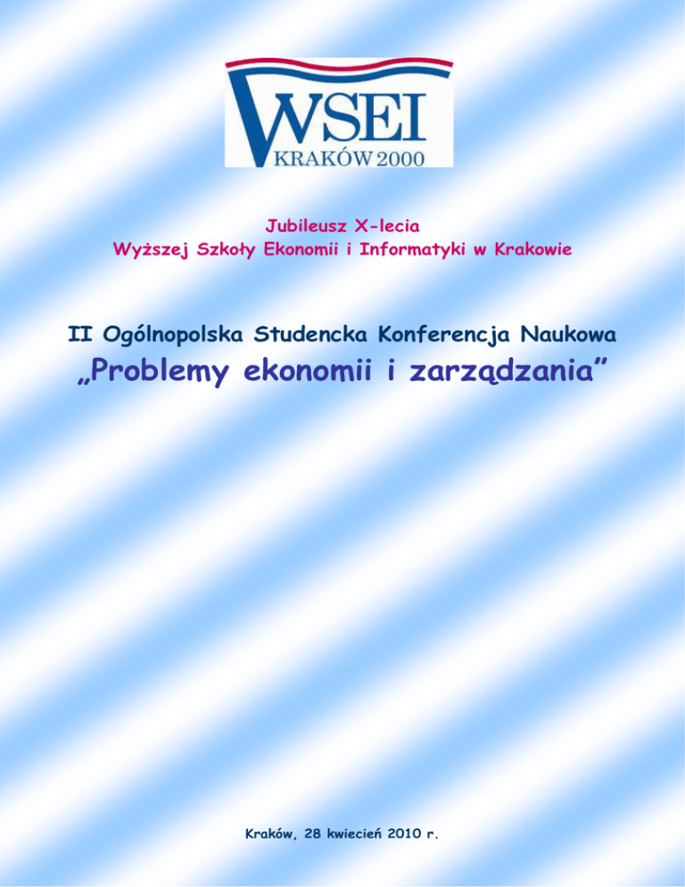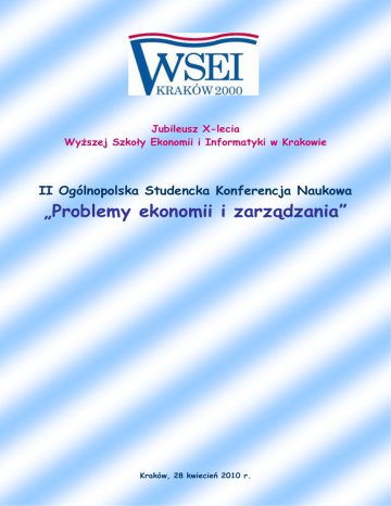 Jubileusz X-lecia WyŜszej Szkoły Ekonomii i Informatyki w Krakowie II Ogólnopolska Studencka Konferencja Naukowa „Problemy ekonomii i zarządzania” Kraków, 28 kwiecień 2010 r. Zakład Inwestycji i Nieruchomości Koło Naukowe Ekonomiki Budownictwa i Nieruchomości II Ogólnopolska Studencka Konferencja Naukowa „Problemy ekonomii i zarządzania” 9.00 - Otwarcie konferencji – Rektor WSEI doc. dr Aleksander Kowalski 9.10 - Przywitanie gości – Prezes KN Ekonomiki Budownictwa i Nieruchomości 2008/2009 - lic. Paweł Augustyn 9.20 - Sesja plenarna I sala SW-1 1. Grzegorz Kaczorowski, Bogumiła Stobińska, Hanna Teleon - Zawód pośrednika w obrocie nieruchomości w kontekście projektu Ustawy o Ograniczaniu Barier Administracyjnych dla Obywateli i Przedsiębiorców 2. 3. 4. 5. Opiekun naukowy: mgr Magdalena Gostkowska - Drzewicka Sopocka Szkoła WyŜsza Michał GłaŜewski – Zarządzanie nieruchomościami naraŜonymi na działanie czynników katastroficznych Opiekun naukowy: dr inŜ. Zbigniew Sujkowski Uniwersytet Warmińsko-Mazurski w Olsztynie Dariusz Rogotowicz - Zmienność warunków otoczenia – dynamiczne podejście do wyceny wartości przedsiębiorstwa Opiekun naukowy: prof. Zofia Wilimowska Politechnika Wrocławska Katarzyna Pilarczyk, Piotr Bartoszewicz – Analiza krakowskiego rynku nieruchomości budynkowych Opiekun naukowy: mgr Małgorzata Terlikowska WyŜsza Szkoła Ekonomii i Informatyki w Krakowie Marcin Reichel, Katarzyna Stawowiak, Michał Palczewski, Mateusz Bednarczuk – Nieruchomości jako przedmiot inwestowania Opiekun naukowy: mgr Małgorzata Terlikowska WyŜsza Szkoła Ekonomii i Informatyki w Krakowie 6. Monika Warda, Lucyna Grabowska, Joanna Trzecińska, Zbigniew Aszyk – Walory Parku Narodowego Bory Tucholskie jako czynnik rozwoju Ziemi Chojnickiej Opiekun naukowy: mgr Magdalena Gostkowska - Drzewicka Sopocka Szkoła WyŜsza Wydział Zamiejscowy w Chojnicach 7. Roman Matusz, Jacek Strojny - Numizmatyka – hobby czy alternatywny sposób inwestowania pieniędzy? Opiekun naukowy: dr Jacek Strojny Politechnika Rzeszowska 8. Marta Czarnecka - Polskie inwestycje w Brazylii- od importera do eksportera BIZ? Opiekun naukowy: prof. Kazimierz Starzyk, dr Maciej Piklikiewicz Szkoła Główna Handlowa w Warszawie 9. Joanna Piechocka, Olga Budnik, Aleksandra Kachniarz - Cykl Ŝycia portalu społecznościowego nasza-klasa, Opiekun naukowy: dr Ewa Więcek - Janka Państwowa WyŜsza Szkoła Zawodowa w Gnieźnie 10. Jadwiga Gorączkowska - Koncepcja klastra i jej realizacja w województwie lubuskim Opiekun naukowy: dr Sławomir Kotylak Uniwersytet Zielonogórski 11. Anna Wermińska i Beata Bronszkiewicz - Agroturystyka jako forma przedsiębiorczości na obszarach wiejskich , Opiekun naukowy: mgr Beata Ujda - Dyńka Państwowa WyŜsza Szkoła Zawodowa im. prof. Stanisława Tarnowskiego w Tarnobrzegu 12. Anna Kurzak - Innowacyjność reklam koniecznością uzyskania przewagi konkurencyjnej na wymagającym rynku XXI wieku Akademia im. Jana Długosza w Częstochowie 13. Katarzyna Kiliańska, Katarzyna Tatar – Ocena pracownicza źródłem informacji o organizacji. Narzędzia oceny personelu. Opiekun naukowy: mgr Joanna Rogalska Uniwersytet Humanistyczno – Przyrodniczy Jana Kochanowskiego w Kielcach 12.00 – Dyskusja i podsumowanie sesji plenarnej 12.30 – 13.00 – Przerwa na poczęstunek 13.00 – Sesja plenarna II sala SW-1 1. Katarzyna śołdak, Izabela Krawczyk-Sokołowska - Analiza wybranych wskaźników zrównowaŜonego rozwoju w Polsce w układzie regionalnym w latach 2006 – 2008 Opiekun naukowy: dr Izabela Krawczyk - Sokołowska Politechnika Częstochowska 2. Przybyłowski Tomasz - Metoda 5S jako element eliminacji marnotrawstwa w przedsiębiorstwie Opiekun naukowy: dr inŜ. Piotr Bernat Państwowa WyŜsza Szkoła Zawodowa w Nysie 3. Agnieszka Walat, Jacek Strojny - Rachunkowość zarządcza i controlling operacyjny jako instrument zarządzania projektami 4. 5. 6. 7. 8. Opiekun naukowy: dr Jacek Strojny Politechnika Rzeszowska Łukasz Pietrzak - Wpływ wymiany danych CAD/CAM na funkcjonowanie przedsiębiorstwa Opiekun naukowy: dr inŜ. Piotr Bernat Państwowa WyŜsza Szkoła Zawodowa w Nysie Beata Wróbel - Determinanty młodych przedsiębiorców Opiekun naukowy: dr Kazimierz Mrozowicz Małopolska WyŜsza Szkoła Ekonomiczna w Tarnowie Beata Przepióra - Wpływ globalizacji na problemy ekonomii i zarządzania Opiekun naukowy: dr Sławomir Kotylak Uniwersytet Zielonogórski Justyna Bogołębska - Polityka dywidend w spółkach giełdowych z indeksu WIG20 i WIG40 Opiekun naukowy: prof. Wiesław Dębski Uniwersytet Łódzki Paulina Bąkowska - E – commerce jako przykład nowej ekonomii i jedna z form działalności handlowej w sklepów i aukcji on – line internecie – perspektywy rozwoju i bariery wzrostu na przykładzie Opiekun naukowy: dr Nina Stępnicka Uniwersytet Humanistyczno – Przyrodniczy Jana Kochanowskiego W Kielcach, Filia w Piotrkowie Trybunalskim 9. Krzysztof Kocurek - Karta podatkowa a opodatkowanie na zasadach ogólnych Uniwersytet Ekonomiczny w Krakowie 10. Katarzyna Hełpa-Liszkowska - Kulturowy wymiar rozwoju gospodarczego Opiekun naukowy: prof. dr hab. GraŜyna Bartkowiak Uniwersytet Ekonomiczny w Poznaniu 11. ElŜbieta Nosal-Szczygiel - Progresja podatkowa w odniesieniu do dochodów osób fizycznych osiąganych z pracy jako narzędzie niwelowania nierówności dochodowych w społeczeństwie Opiekun naukowy: prof. zw. dr hab. Stanisław Owsiak Uniwersytet Ekonomiczny W Krakowie 12. Ewelina Orłowska - Negocjacje jako klucz do sukcesu w biznesie Opiekun naukowy: dr Wiesław Ciechomski WyŜsza Szkoła Marketingu i Zarządzania w Lesznie 13. Justyna Walczak - Rozwój cywilizacyjny a jakość Ŝycia i bezpieczeństwo publiczne Opiekun naukowy: dr Wiesław Ciechomski WyŜsza Szkoła Marketingu i Zarządzania w Lesznie 15.00 – Dyskusja i zakończenie obrad 15.30 – Zakończenie konferencji