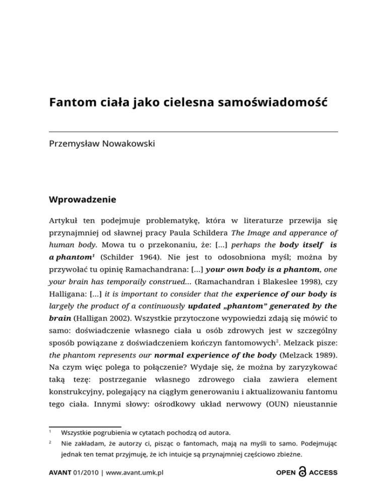 Fantom ciała jako cielesna samoświadomość Przemysław Nowakowski Wprowadzenie Artykuł ten podejmuje problematykę, która w literaturze przewija się przynajmniej od sławnej pracy Paula Schildera The Image and apperance of human body. Mowa tu o przekonaniu, że: […] perhaps the body itself is a phantom1 (Schilder 1964). Nie jest to odosobniona myśl; można by przywołać tu opinię Ramachandrana: […] your own body is a phantom, one your brain has temporaily construed… (Ramachandran i Blakeslee 1998), czy Halligana: […] it is important to consider that the experience of our body is largely the product of a continuously updated „phantom” generated by the brain (Halligan 2002). Wszystkie przytoczone wypowiedzi zdają się mówić to samo: doświadczenie własnego ciała u osób zdrowych jest w szczególny sposób powiązane z doświadczeniem kończyn fantomowych2. Melzack pisze: the phantom represents our normal experience of the body (Melzack 1989). Na czym więc polega to połączenie? Wydaje się, że można by zaryzykować taką tezę: postrzeganie własnego zdrowego ciała zawiera element konstrukcyjny, polegający na ciągłym generowaniu i aktualizowaniu fantomu tego ciała. Innymi słowy: ośrodkowy układ nerwowy (OUN) nieustannie 1 Wszystkie pogrubienia w cytatach pochodzą od autora. 2 Nie zakładam, że autorzy ci, pisząc o fantomach, mają na myśli to samo. Podejmując jednak ten temat przyjmuję, że ich intuicje są przynajmniej częściowo zbieżne. AVANT 01/2010 | www.avant.umk.pl OPEN ACCESS 226 Fantom ciała jako cielesna samoświadomość konstruuje fenomenalno-funkcjonalny model własnego ciała 3, który – z powodu czasowych parametrów aktualizacji tegoż modelu – nie ulega od razu zmianie, pomimo utraty kończyny. Niniejszy tekst poświęcony jest tej właśnie tezie, a także koncepcji mówiącej, że wspomniany model – a dokładniej: jego fenomenalny aspekt – jest podstawową formą samoświadomości cielesnej. Pełna samoświadomość i samowiedza dotycząca własnego ciała jest oczywiście złożonym zjawiskiem, omawiany tu model stanowi jedynie pewien jego aspekt. Myśl przewodnia tej pracy tożsama jest z przekonaniem wspomnianego już Halligana (2002), że doświadczenie kończyny fantomowej nie jest doświadczeniem patologicznym. Co to oznacza? W odróżnieniu od urojeń i halucynacji, powstałych w wyniku rozmaitych uszkodzeń ośrodkowego układu nerwowego, w przypadku poamputacyjnych kończyn fantomowych mamy do czynienia z poprawnym funkcjonowaniem OUN. Występuje tu natomiast fizyczne uszkodzeniem ciała, utrata kończyny bądź jej części. Halligan pisze: I will argue (not with standing pathology to the physical body) that the prevalent common sense assumption of phantom experience as pathological is wrongheaded and largely based on a long-standing and pernicious folk assumption that the physical body is necessary for experience of a body (Halligan 2002: 252). 3 Idea ta jest zbieżna z badaniami Thomasa Metzingera (2003), nie jest jednak – jak się wydaje – tożsama z nimi. Wskazanie podobieństw i rozbieżności pomiędzy tymi koncepcjami wymagałoby napisania osobnego artykułu. Jedną z różnic jest na pewno rola informacji wzrokowej (tu jedynie funkcjonalna, nieuzupełniona komponentem funkcjonalnym, a u Metzingera zarówno funkcjonalna, jak i fenomenalna). W koncepcji Metzingera informacja wzrokowa, uczestnicząca w tworzeniu pełnego fenomenalnego modelu własnego ciała, stanowiąc część treści tego modelu, nie jest tożsama z cielesną samoświadomością, o której traktuje ten artykuł. Fantom ciała jako cielesna samoświadomość 227 Zgodnie z interpretacją Halligana możemy tu mówić o niezgodności pomiędzy ciałem fizycznym a doświadczeniem ciała. Dzięki tej niezgodności, o ile interpretacja ta jest poprawna, istnienie (uprzednio ukrytego) fantomu ciała staje się na pewien czas jawne. W pracy tej zostanie przyjęta mniej radykalna koncepcja, zgodnie z którą własności widzianego ciała nie pozostają bez znaczenia dla własności fantomu. Na zakończenie spróbujemy zaproponować taką interpretacją zjawiska fantomu ciała, która czyniłaby je podstawową formą cielesnej świadomości, a dokładniej: podstawową (cielesną) samoświadomością. W artykule nie odróżniamy fantomu całego ciała od fantomowej kończyny. Przyjmujemy, że kończyna fantomowa jest przejawem czy też elementem fantomu całego ciała. Nie można mylić tych założeń z ustaleniami dotyczącymi autoskopii (odnośnie autoskopii patrz: Blanke i Mohr 2005; Brugger 2006). W doświadczeniach autoskopowych kluczową rolę odgrywa informacja wzrokowa, minimalizowana w podejmowanych tu 4 rozważaniach . Klasyfikacja fantomów W artykule tym zajmujemy się, jak już powiedziano, fantomami powstałymi poamputacyjnie, a w zasadzie tylko pewnymi ich aspektami. Decyzja ta ma kilka przyczyn. Po pierwsze: pomimo interesujących prób (Brugger 2006) wskazania na istotne związki wszelkiego rodzaju fantomów (patrz: tabela w tym rozdziale), istnieją przesłanki za tym, by odróżniać od siebie kilka ich klas. Po drugie: w kontekście tym – zgodnie z ideą Halligana (2002) – uzasadnione jest przyznanie fantomom poamputacyjnym wyjątkowego statusu. Mówiąc dokładniej: jedynie fantomy poamputacyjne nie są związane z dysfunkcją układu nerwowego. Po trzecie: fantomy poamputacyjne wydają 4 Brugger (2006) podjął w swojej pracy próbę przedstawienia doświadczeń autoskopowych, jako ciał fantomowych, czyli rozszerzeń fantomowych kończyn. Jednak i on uważał, że w większości – poza poczuciem obecności – są to fantomy wzrokowe. 228 Fantom ciała jako cielesna samoświadomość się ze swoją proprioceptywno/somatosensoryczną naturą (patrz poniżej) szczególnie związane z cielesnym wymiarem samoświadomości. Wyróżnić można dziewięć rodzajów „fantomów”, wyłączając tak zwane fantomy niec