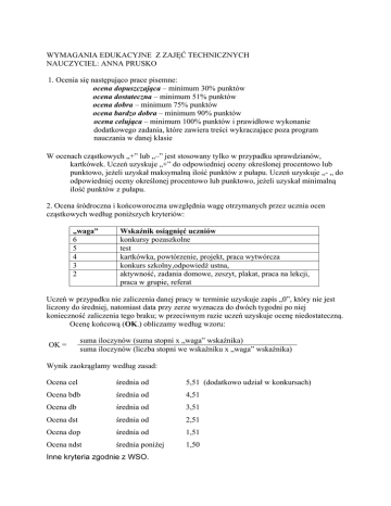 WYMAGANIA EDUKACYJNE Z ZAJĘĆ TECHNICZNYCH NAUCZYCIEL: ANNA PRUSKO 1. Ocenia się następująco prace pisemne: ocena dopuszczająca – minimum 30% punktów ocena dostateczna – minimum 51% punktów ocena dobra – minimum 75% punktów ocena bardzo dobra – minimum 90% punktów ocena celująca – minimum 100% punktów i prawidłowe wykonanie dodatkowego zadania, które zawiera treści wykraczające poza program nauczania w danej klasie W ocenach cząstkowych „+” lub „–” jest stosowany tylko w przypadku sprawdzianów, kartkówek. Uczeń uzyskuje „+” do odpowiedniej oceny określonej procentowo lub punktowo, jeżeli uzyskał maksymalną ilość punktów z pułapu. Uczeń uzyskuje „- „ do odpowiedniej oceny określonej procentowo lub punktowo, jeżeli uzyskał minimalną ilość punktów z pułapu. 2. Ocena śródroczna i końcoworoczna uwzględnia wagę otrzymanych przez ucznia ocen cząstkowych według poniższych kryteriów: „waga” 6 5 4 3 2 Wskaźnik osiągnięć uczniów konkursy pozaszkolne test kartkówka, powtórzenie, projekt, praca wytwórcza konkurs szkolny,odpowiedź ustna, aktywność, zadania domowe, zeszyt, plakat, praca na lekcji, praca w grupie, referat Uczeń w przypadku nie zaliczenia danej pracy w terminie uzyskuje zapis „0”, który nie jest liczony do średniej, natomiast data przy zerze wyznacza do dwóch tygodni po niej konieczność zaliczenia tego braku; w przeciwnym razie uczeń uzyskuje ocenę niedostateczną. Ocenę końcową (OK.) obliczamy według wzoru: OK = suma iloczynów (suma stopni x „waga” wskaźnika) suma iloczynów (liczba stopni we wskaźniku x „waga” wskaźnika) Wynik zaokrąglamy według zasad: Ocena cel średnia od 5,51 (dodatkowo udział w konkursach) Ocena bdb średnia od 4,51 Ocena db średnia od 3,51 Ocena dst średnia od 2,51 Ocena dop średnia od 1,51 Ocena ndst średnia poniżej 1,50 Inne kryteria zgodnie z WSO. WYMAGANIA EDUKACYJNE Z ZAJĘĆ TECHNICZNYCH DLA KLAS II NAUCZYCIEL: ANNA PRUSKO M O D U Ł Ocena dopuszczająca Ocena dostateczna Ocena dobra Ocena bardzo dobra Ocena celująca Uczeń: Uczeń: Uczeń: Uczeń: Uczeń: W Y C H O W A N I E zna historię rozwoju motocykli zna definicję motoroweru rozumie znaczenie wprowadzenia przepisów ruchu drogowego potrafi bezpiecznie korzystać ze środków komunikacji publicznej zna zasady bezpiecznego poruszania się pieszych rozumie konieczność posiadania karty motorowerowej rozumie pojęcie „kodeks drogowy rozumie pojęcie „manewr na drodze" rozumie znaczenie znaków drogowych rozumie pojęcie „skrzyżowanie drogowe" rozumie pojęcie „bezpieczna prędkość" potrafi prawidłowo zachować się w miejscu wypadku rozumie konieczność przestrzegania przepisów ruchu drogowego zna budowę motoroweru zna podstawowe pojęcia z kodeksu drogowego wie z jakich elementów składa się droga zna zasady bezpiecznego poruszania się rowerzystów i motorowerzystó w po drodze indywidualnie zna obowiązkowe wyposażenie motoroweru rozumie pojęcia: „ruch prawostronny", „szczególna ostrożność", „ograniczenie zaufania” rozróżnia poszczególne manewry na drodze zna poszczególne grupy znaków drogowych zna zasady zna obowiązkowe wyposażenie motoroweru potrafi odczytać ze zrozumieniem instrukcję obsługi motoroweru zna skutki nieprawidłoweg o zachowania się na drodze zna zasady bezpiecznego poruszania się rowerzystów i motorowerzystó w po drodze w grupie zna zasady prawidłowego poruszania się indywidualnie i w kolumnie motorowerowej zna hierarchię ważności norm, znaków i sygnałów oraz poleceń potrafi prawidłowo omówić rozumie zasady działania poszczególnych układów motoroweru rozumie międzynarodowe znaczenie oznakowania dróg zna wszystkie znaki dotyczące pieszego i rowerzysty w ruchu drogowym zna przyczyny zatrzymania dowodu rejestracyjnego motoroweru zna zasady przewożenia osób i bagażu motorowerem zna znaczenie wszystkich znaków drogowych wie jak zachować się wobec pojazdów uprzywilejowanyh uczeń spełnia kryteria na ocenę bardzo dobrą oraz bierze on udział w pozaszkolny m konkursie przedmiotowym. K O M U N I K A C Y J N E P A P I E R O P L A S T Y K A omawia znaczenie papieru w codziennym życiu zna surowce do produkcji papieru omawia etapy produkcji papieru na podstawie schematu charakteryzuje podstawowe właściwości papieru omawia podstawowe gatunki obowiązujące na skrzyżowaniach oznaczonych zna czynniki wpływające na zatrzymanie pojazdu zna numery alarmowe potrafi wymienić przyczyny powstawania wypadków drogowych poszczególne manewry zna znaczenie znaków drogowych dotyczące pieszych, rowerzystów i motorowerzystó w zna zasady obowiązujące na skrzyżowaniach oznaczonych i nieoznaczonych zna czynniki mające wpływ na czas reakcji potrafi prawidłowo powiadomić służby ratunkowe o miejscu wypadku i stanie poszkodowanyc h zna obowiązujące prędkości poruszania się pojazdów potrafi zmierzyć swój czas reakcji potrafi udzielić pierwszej pomocy potrafi odczytać informację z opakowania leków dotyczące prowadzenia pojazdów po ich zażyciu rozróżnia podstawowe gatunki papieru wykonuje formy techniką orgiami, kirigami i papiermache podaje przykłady ozdób z papieru bezpiecznie posługuje się narzędziami i zna sposoby uszlachetniania papieru omawia historię papieroplastyki i wymienia jej gatunki zna sposoby wykorzystania surowców wtórnych określa gatunek danego papieru potrafi dobrać odpowiednią grubość papieru do stosowanej techniki omawia sposoby wykorzystywani a surowców wtórnych uczeń spełnia kryteria na ocenę bardzo dobrą oraz bierze on udział w pozaszkolny m konkursie przedmiotowym. papieru opisuje i określa jakość papierowych produktów omawia sposoby wykonania orgiami i kirigami zna papier-mache i wykonuje ozdoby tą techniką zna ozdoby charakterystyczne dla swojego regionu zna i stosuje narzędzia i materiały do obróbki papieru materiałami do obróbki p
