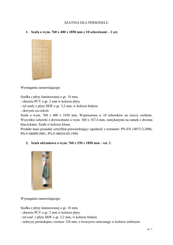 SZATNIA DLA PERSONELU 1. Szafa o wym. 760 x 400 x 1850 mm z 10 schowkami – 2 szt. Wymagania zamawiającego: Szafka z płyty laminowanej o gr. 18 mm, - obrzeże PCV o gr. 2 mm w kolorze płyty - tył szafy z płyty HDF o gr. 3,2 mm, w kolorze białym - skrzynie na cokole Szafa o wym. 760 x 400 x 1850 mm. Wyposażona w 10 schowków na rzeczy osobiste. Wszystkie schowki z drzwiczkami o wym. 368 x 347,4 mm, zamykanymi na zamek z dwoma kluczykami. Szafa w kolorze klonu. Produkt musi posiadać certyfikat potwierdzający zgodność z normami: PN-EN 14073-2:2006, PN-F-06009:2001, PN-F-06010-05:1990. 2. Szafa ubraniowa o wym. 760 x 530 x 1850 mm – szt. 2 Wymagania zamawiającego: Szafka z płyty laminowanej o gr. 18 mm, - obrzeże PCV o gr. 2 mm w kolorze płyty - tył szaf z płyty HDF o gr. 3,2 mm, w kolorze białym - uchwyty prostokątne, rozstaw 128 mm, z tworzywa sztucznego w kolorze srebrnym str. 1 - skrzynie na cokole Szafa ubraniowa głęboka o wym. 760 x 530 x 1850 mm. W górnej części półka na kapelusze, pod nią zamocowany metalowy drążek na wieszaki ubraniowe. Dwuskrzydłowe drzwi wyposażone w uchwyty oraz zamek z dwoma kluczykami. Szafa w kolorze klonu. Produkt musi posiadać certyfikat potwierdzający zgodność z normami: PN-EN 14073-2:2006, PN-F-06009:2001, PN-F-06010-05:1990. 3. Metalowa szafa gospodarcza o wym. 60 x 49 x 180 cm – szt. 6 Wymagania zamawiającego: Szafa BHP o stabilnej konstrukcji wykonana z blachy stalowej malowanej proszkowo. Drzwi dwuskrzydłowe, wyposażone w wywietrzniki oraz miejsce na identyfikator, zamykane zamkiem kluczowym z trzypunktowym ryglowaniem. W lewej części należy wykonać 4 półki, w prawej drążek na ubrania oraz uchwyt na narzędzia do sprzątania. Szafa gospodarcza ma mieć wydzieloną komorę w kształcie litery L i jedną komorę skrytkową o wymiarach 26 x 29 x 49 i trzy komory skrytkową o wymiarach 33 x 29 x 49 cm. - wym. 60 x 49 x 180 cm. 4. Ławka korytarzowa sosnowa z oparciem 1600 x 320 x 445 mm – czarny – sosna – szt. 1 Wymagania zamawiającego: Siedzisko i oparcie z desek sosnowych. Konstrukcja metalowa w kolorze czarnym. - wym. 160 x 32 x 44,5 cm str. 2 5. Kosz pedałowy – szt. 20 Wymagania zamawiającego: Pojemność kosza 16 l. Wymiary 31,9 x 30,2 x 38 cm. Kolor – biały. str. 3