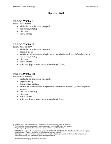 MENU 2012 / 2013 Willa Wilga www.willawilga.pl ______________________________________________________________________________________________________ Ognisko i Grill PROPOZYCJA I koszt 15 zł / osoba* kiełbaska do upieczenia na ognisku musztarda, ketchup pieczywo kawa, herbata PROPOZYCJA II koszt 30 zł / osoba** kiełbaska do upieczenia na ognisku bigos domowy sałatka np. ziemniaczana lub pieczone ziemniaki z masłem – jedno do wyboru musztarda, ketchup pieczywo kawa, herbata soki, napoje gazowane, woda mineralna (1 litr/os.) PROPOZYCJA III koszt 40 zł / osoba** kiełbaska do upieczenia na ognisku bigos domowy żurek z białą kiełbasą sałatka np. ziemniaczana lub pieczone ziemniaki z masłem – jedno do wyboru surówka musztarda, ketchup pieczywo kawa, herbata soki, napoje gazowane, woda mineralna (1 litr/os.) * Podana kwota jest ceną brutto za 1 osobę przy grupie minimum 5 osób do 2 godzin; ** Podana kwota jest ceną brutto za 1 osobę przy grupie minimum 25 osób do 5 godzin; Przy mniejszej grupie i dłuższej zabawie – ceny ustalane są indywidualnie; KIEŁBASKI podajemy do upieczenia na ognisku; KARKÓWKA, SKRZYDEŁKA, ZIEMNIAKI grillowanie są w piecu; WARZYWA, KASZANKĘ grillujemy na grillu zewnętrznym lub w piecu; Na miejscu do kupienia piwo w puszkach, na zamówienie – beczka; pozostały alkohol we własnym zakresie. Na imprezy obowiązuje zakaz wnoszenia własnego jedzenia. Podane ceny obowiązują do czerwca 2013 roku. MENU 2012 / 2013 Willa Wilga www.willawilga.pl ______________________________________________________________________________________________________ Ognisko i Grill PROPOZYCJA IV koszt 45 zł / osoba** kiełbaska do upieczenia na ognisku bigos domowy żurek z białą kiełbasą warzywa grillowanie pieczone ziemniaki z masłem sałatka surówka musztarda, ketchup pieczywo kawa, herbata soki, napoje gazowane, woda mineralna (1 litr/os.) PROPOZYCJA V koszt 50 zł / osoba** kiełbaska do upieczenia na ognisku karkówka grillowania bigos domowy pieczone ziemniaki z masłem sałatka surówka musztarda, ketchup pieczywo kawa, herbata soki, napoje gazowane, woda mineralna (1 litr/os.) PROPOZYCJA VI koszt 55 zł / osoba** kiełbaska do upieczenia na ognisku karkówka grillowania bigos domowy żurek z białą kiełbasą lub grochówka wojskowa sałatka np. ziemniaczana lub pieczone ziemniaki z masłem – jedno do wyboru surówka sosy do mięs musztarda, ketchup pieczywo kawa, herbata soki, napoje gazowane, woda mineralna (1 litr/os.) * Podana kwota jest ceną brutto za 1 osobę przy grupie minimum 5 osób do 2 godzin; ** Podana kwota jest ceną brutto za 1 osobę przy grupie minimum 25 osób do 5 godzin; Przy mniejszej grupie i dłuższej zabawie – ceny ustalane są indywidualnie; KIEŁBASKI podajemy do upieczenia na ognisku; KARKÓWKA, SKRZYDEŁKA, ZIEMNIAKI grillowanie są w piecu; WARZYWA, KASZANKĘ grillujemy na grillu zewnętrznym lub w piecu; Na miejscu do kupienia piwo w puszkach, na zamówienie – beczka; pozostały alkohol we własnym zakresie. Na imprezy obowiązuje zakaz wnoszenia własnego jedzenia. Podane ceny obowiązują do czerwca 2013 roku. MENU 2012 / 2013 Willa Wilga www.willawilga.pl ______________________________________________________________________________________________________ Ognisko i Grill PROPOZYCJA VII koszt 65 zł / osoba** kiełbaska do upieczenia na ognisku karkówka grillowana skrzydełka grillowane kaszanka grillowania bigos domowy żurek z białą kiełbasą lub grochówka wojskowa pieczone ziemniaki z masłem warzywa grillowane sałatka surówka sosy do mięs musztarda, ketchup pieczywo kawa, herbata soki, napoje gazowane, woda mineralna (1 litr/os.) * Podana kwota jest ceną brutto za 1 osobę przy grupie minimum 5 osób do 2 godzin; ** Podana kwota jest ceną brutto za 1 osobę przy grupie minimum 25 osób do 5 godzin; Przy mniejszej grupie i dłuższej zabawie – ceny ustalane są indywidualnie; KIEŁBASKI podajemy do upieczenia na ognisku; KARKÓWKA, SKRZYDEŁKA, ZIEMNIAKI grillowanie są w piecu; WARZYWA, KASZANKĘ grillujemy na grillu zewnętrznym lub w piecu; Na miejscu do kupienia piwo w puszkach, na zamówienie – beczka; pozostały alkohol we własnym zakresie. Na imprezy obowiązuje zakaz wnoszenia własnego jedzenia. Podane ceny obowiązują do czerwca 2013 roku.