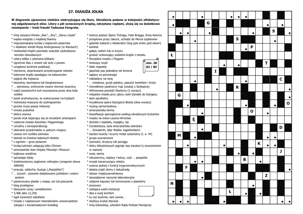 27. DUUUŻA JOLKA W diagramie ujawniono niektóre niekrzyżujące się litery. Określenia podano w kolejności alfabetycznej odgadywanych słów. Litery z pól oznaczonych kropką, odczytane rzędami, złożą się na dodatkowe rozwiązanie – treść fraszki Tadeusza Fangrata. * * * * * * * * * * * * * * * * * * * * * * * * * * * * * * * * * * * * * * * imię reżysera filmów „Ran”, „Sny”, „Dersu Uzała” wąska wstążka z miękkiej tkaniny nieprzemakalna kurtka z kapturem polarnika z Adakiem wśród Wysp Andrejanowa (w Aleutach) niedowład mięśni powstały wskutek uszkodzenia nerwów obwodowych cztery kółka z czterema kółkami ogromne fasy z winem lub kufy z piwem urzędowa kontrola publikacji nierówne, stopniowane przystrzyganie włosów kolorowe krążki opadające na balowiczów zajęcie dla trębacza bezsolna, bezmięsna lub bezglutenowa … piersiowa, schorzenie zwane również dusznicą część powierzchni kuli wyznaczona przez dwa koła wielkie jeżeli arytmetyczne, to wykonywane na liczbach niemiecka maszyna do szyfrogramów grecka muza poezji miłosnej mnisia pustelnia dobra nowina perski liryk kojarzący się ze smukłymi antylopami rodzinne miasto Kolumba i Paganiniego umyślny z korespondencją zbieranie przedmiotów w jednym miejscu usiana nim ściółka sośniaka domek ze śnieżno-lodowych bloków z ogniem – grozi pożarem liczbą ludności ustępują tylko Chinom amerykański stan między Missisipi i Missouri bajkowa wiedźma sprzedaje bilety średniowieczny żaglowiec wikingów (anagram słowa ARKAN) pracuje, oddycha, buduje („Republika”) … życzeń - piosenki dedykowane jubilatom i solenizantom panierowany plaster z mięsa, soi lub pieczarek bieg przełajowy otaczanie czcią i uwielbieniem 3,40€ albo 12,25$ ogół świeckich katolików miasto z najstarszym holenderskim uniwersytetem (skojarz z kondensatorem-butelką) * * * * * * * * * * * * * * * * * * * * * * * * * * * * * * * * * * * * * * * * * * * twórca postaci Iljona Tichego, Hala Bregga, Krisa Kelvina przepływa przez Jakuck, uchodzi do Morza Łaptiewów gdański kabaret z Abelardem Gizą (jak siniec pod okiem) kanibal gałęzi, kołem lub w krzyżu grawer wykonujący ozdobne krążki z metalu florydzkie miasto z Flagami świecący szyld min. 28 lekki niepokój 82 / 85 japoński pas jedwabny do kimona żądany za porwanego nakładany na ranę … miodowa, grzyb jadalny, pasożyt świerków i brzóz chorobliwie zazdrosny mąż (szukaj u Szekspira) sfilmowana powieść Deotymy (3 wyrazy) indyjskie miasto przy ujściu rzeki Gandak do Gangesu dom parafialny trzyaktowa opera Georges’a Bizeta (dwa wyrazy) wyścig samochodowy amerykańska farma klasyfikacja sporządzona według określonych kryteriów miasto na trasie Leszno-Wrocław dochód z kapitału, majątku, itp. Condoleezza, była amerykańska sekretarz … Schuberth, lider Wałów Jagiellońskich bardzo twardy i kruchy metal szlachetny (l. a. 44) grupa wyznaniowa żywności, drużyny lub pociągu skóry kilkudniowych jagniąt rasy karakuł (z owocówkami w nazwie) zwał, sterta nikczemnicy, łajdacy i łotrzy, czyli … pospolite orszak towarzyszący władcy wykres jednej z funkcji trygonometrycznych płaska część domu z balustradą obszar międzyzwrotnikowy żaroodporne naczynie laboratoryjne ubijanie kapusty lub formowanie z plasteliny przywara zastępca szefa instytucji dba o swój komfort tu coś buchnie, tam zwinie… złośliwy krytyk literacki imię Gilowskiej, członkini Rady Polityki Pieniężnej ● ● ● ● ● G ● ● ● ● ● S ● S ● ● ● ● ● P Ł ● T ● I ● C ● R ● ● G ● ● ● O ● O ● ● Ę D ● M ● ● K ● ● ● ● ● ● J ● B ● ● ● F ● Z ● N ● Ł ● ● ● ● ● ● ● ●