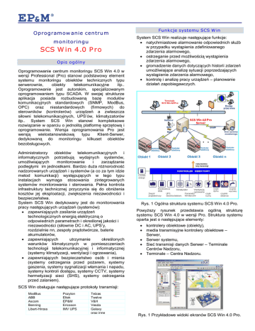 Oprogramow anie centrum monitoringu SCS W in 4.0 P ro Opis ogólny Oprogramowanie centrum monitoringu SCS Win 4.0 w wersji Professional (Pro) stanowi podstawowy element systemu monitoringu obiektów technicznych typu serwerownie, obiekty telekomunikacyjne itp.. Oprogramowanie jest autorskim, specjalizowanym oprogramowaniem typu SCADA. W swojej strukturze aplikacja posiada rozbudowaną bazę modułów komunikacyjnych standardowych (SNMP, ModBus, OPC) oraz niestandardowych (firmowych) do sterowników (kontrolerów) urządzeń a zwłaszcza siłowni telekomunikacyjnych, UPS’ów, klimatyzatorów itp.. System SCS Win stanowi kompleksowe rozwiązanie w oparciu o jednolitą platformę sprzętową i oprogramowanie. Wersja oprogramowania Pro jest wersją wielostanowiskową typu KlientSerwer, dedykowaną do monitoringu kilkuset obiektów bezobsługowych. Administratorzy obiektów telekomunikacyjnych i informatycznych potrzebują wydajnych systemów, umożliwiających monitorowanie i zarządzanie podległymi im jednostkami. Bardzo duża różnorodność nadzorowanych urządzeń i systemów (a co za tym idzie metod komunikacji) występujących w tego typu instalacjach wymaga stosowania zintegrowanych systemów monitorowania i sterowania. Pełna kontrola infrastruktury technicznej przyczynia się do obniżenia kosztów jej eksploatacji, zwiększenia niezawodności i bezpieczeństwa. System SCS Win dedykowany jest do monitorowania pracy następujących urządzeń (systemów): · zapewniających zasilanie urządzeń technologicznych energią elektryczną o odpowiednich parametrach i określonej jakości i niezawodności (siłownie DC i AC, UPS’y, rozdzielnie nn, zespoły prądotwórcze, baterie akumulatorów, · zapewniających utrzymanie określonych warunków klimatycznych w pomieszczeniach technologii telekomunikacyjnej i informatycznej (systemy klimatyzacji, wentylacji i ogrzewania), · zapewniających bezpieczeństwo osób i mienia (systemy ostrzegania przed pożarem, systemy gaszenia, systemy sygnalizacji włamania i napadu, systemy kontroli dostępu, systemy CCTV, systemy hermetyzacji sieci (SHS), systemy ostrzegania przed zalaniem). Funkcje systemu SCS W in System SCS Win realizuje następujące funkcje: · natychmiastowe alarmowanie odpowiednich służb w przypadku wystąpienia zdefiniowanego zdarzenia alarmowego, · ostrzeganie przed możliwością wystąpienia zdarzenia alarmowego, · gromadzenie danych dotyczących historii zdarzeń umożliwiające analizę sytuacji poprzedzających wystąpienie zdarzenia alarmowego, · kontrolę i analizę pracy urządzeń – planowanie działań zapobiegawczych. Rys. 1 Ogólna struktura systemu SCS Win 4.0 Pro. Powyższy rysunek przedstawia ogólną strukturę systemu SCS Win 4.0 w wersji Pro. Struktura systemu oparta jest o następujące elementy: · kontrolery obiektowe (obiekty), · media transmisyjne kontrolery obiektowe – Serwer, · Serwer systemu, · Sieć transmisji danych Serwer – Terminale Centrów Nadzoru, · Terminale – Centra Nadzoru. SCS Win obsługuje następujące protokoły transmisji: ModBus ABB Ascom Benning LibertHiross Pozyton Eltek EP&M Ericsson IMV UPS Telzas Twelve V&H Vesda Galaxy oraz inne Rys. 1 Przykładowe widoki ekranów SCS Win 4.0 Pro. A plikacja SCS W in 4.0 P ro zapew nia: · ergonomiczną pracę operatora przejrzyste obrazowanie danych aktualnych i historycznych z obiektów (systemów), · logowanie użytkowników z odpowiednimi prawami dostępu, · kontrolę potwierdzeń odbieranych alarmów przez operatorów, · tworzenie ekranów synoptycznych monitorowanych obiektów, · nadawanie priorytetów dla obiektów, tworzenie grup obiektów, · tworzenie notatek dla obiektów, wprowadzanie danych stałych informacyjnych dla obiektów (urządzeń), · tworzenie raportów i zestawień, histogramów – zapis raportów w postaci: xls, txt, html, · filtrowanie danych, · zabezpieczenie kryptograficzne przesyłanych danych: SCS Win – kontroler, · przeprowadzenie korelacji zdarzeń, · autodiagnostykę systemu, · współpracę z systemami SWiN, SSP, SKD, CCTV, · komunikację z kontrolerami obiektowymi i sterownikami urządzeń różnych producentów – obsługa standardowych i firmowych protokołów transmisji danych, · gromadzenie danych z obiektów (systemów) i ich archiwizowanie, · gromadzenie danych dodatkowych – notatki operatora, · wysyłanie komunikatów alarmowych: SMS, email, NetSend, · utworzenie serwera zapasowego. Aplikacja charakteryzuje się wysoką stabilnością potwierdzoną wieloma opiniami z eksploatacji. Obsługiwane media transmisyjne: · TCP/IP Ethernet · GSM · GSM/GPRS · V24 · PSTN · E1 G.703/G.704 · Łącza radiowe P odstaw ow e parametry SCS W in 4.0 P ro Typ architektury Zasady licencjonowania Możliwość rozszerzenia licencji Serwer baz danych KlientSerwer Licencja na serwer, centra nadzoru i obiekty TAK MS SQL Express bezpłatnie MS SQL Serwer 2005 Std – za opłatą Rozmiar bazy danych Mirroring baz danych Klastrowanie Kopia zapasowa Szyfrowanie danych Raporty Serwer www Współpraca z systemami nadrzędnymi Powiadamianie o alarmach Sterowanie urządzeniami Możliwość utworzenia ekranów synoptycznych Mapa cyfrowa Maksymalna liczba obiektów online Komunikacja przez SCS GG Baza wiedzy o sygnałach Automatyczne cykliczne pobieranie danych z kontrolerów obiektowych Analiza zaników zasilania Wykresy graficzne Notatki do obiektów Liczba obsługiwanych portów szeregowych Maksymalna liczba użytkowników Aktualizacja oprogramowania Integracja z domeną MS SQL Express 4 GB MS SQL Serwer 2005 Std – bez ograniczeń TAK TAK TAK TAK standardowe wbudowane w oprogramowanie opcja dodatkowa (10 użytkowników online SNMP SMS/mail/NetSend TAK TAK opcja dodatkowa 10 TAK TAK TAK TAK TAK TAK 10 COM 100 online domena automatyczna W ymagania na serw er System operacyjny Procesor RAM HDD CDROM Windows 2003 Serwer Min. Core duo 2.5 2 GB min. 4GB dowolny Firma Electronic Power and Market