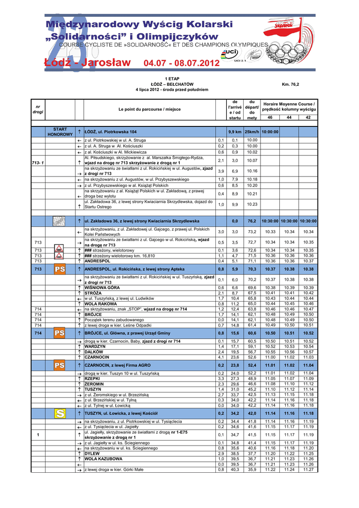 1 ETAP ŁÓDŹ – BEŁCHATÓW 4 lipca 2012 - środa przed południem nr drogi de du Horaire Moyenne Course / l'arrivé départ/ prędkość kolumny wyścigu e / od do 46 44 42 startu mety Le point du parcourse / miejsce START HONOROWY ŁÓDŹ, ul. Piotrkowska 104 z ul. Piotrkowskiej w ul. A. Struga 9,9 km 25km/h 10:00:00 0,1 0,2 0,6 0,1 0,3 0,9 10.00 10.00 10.02 2,1 3,0 10.07 3,9 6,9 10.16 1,0 0,6 7,9 8,5 10.18 10.20 0,4 8,9 10.21 1,0 9,9 10.23 0,0 76,2 3,0 3,0 73,2 10.33 10.34 10.34 0,5 3,5 72,7 10.34 10.34 10.35 0,1 1,1 0,4 3,6 4,7 5,1 72,6 71,5 71,1 10.34 10.36 10.36 10.34 10.36 10.36 10.35 10.36 10.37 0,8 5,9 70,3 10.37 10.38 10.38 6,0 70,2 10.37 10.38 10.38 6,6 8,7 10,4 11,2 12,4 14,1 14,1 14,8 69,6 67,5 65,8 65,0 63,8 62,1 62,1 61,4 10.38 10.41 10.43 10.44 10.46 10.48 10.48 10.49 10.39 10.41 10.44 10.45 10.46 10.49 10.49 10.50 10.39 10.42 10.44 10.46 10.47 10.50 10.50 10.51 15,6 60,6 10.50 10.51 10.52 0,1 1,4 2,4 4,1 15,7 17,1 19,5 23,6 60,5 59,1 56,7 52,6 10.50 10.52 10.55 11.00 10.51 10.53 10.56 11.02 10.52 10.54 10.57 11.03 CZARNOCIN, z lewej Firma AGRO 0,2 23,8 52,4 11.01 11.02 11.04 0,2 3,3 2,3 1,4 2,7 0,3 0,0 24,0 27,3 29,6 31,0 33,7 34,0 34,0 52,2 48,9 46,6 45,2 42,5 42,2 42,2 11.01 11.05 11.08 11.10 11.13 11.14 11.14 11.02 11.07 11.10 11.12 11.15 11.16 11.16 11.04 11.09 11.12 11.14 11.18 11.18 11.18 TUSZYN, ul. Łowicka, z lewej Kościół 0,2 34,2 42,0 11.14 11.16 11.18 na skrzyżowaniu, z ul. Piotrkowskiej w ul. Tysiąclecia z ul. Tysiąclecia w ul. Jagiełły ul. Jagiełły, skrzyżowanie ze światłami z drogą nr 1-E75 skrzyżowanie z drogą nr 1 z ul. Jagiełły w ul. ks. Ściegiennego na skrzyżowaniu w ul. ks. Ściegiennego DYLEW WOLA KAZUBOWA z lewej droga w kier. Górki Małe 0,2 0,2 34,4 34,6 41,8 41,6 11.14 11.15 11.16 11.17 11.19 11.19 0,1 34,7 41,5 11.15 11.17 11.19 0,1 0,8 2,9 1,0 0,0 0,8 34,8 35,6 38,5 39,5 39,5 40,3 41,4 40,6 37,7 36,7 36,7 35,9 11.15 11.16 11.20 11.21 11.21 11.22 11.17 11.18 11.22 11.23 11.23 11.24 11.19 11.20 11.25 11.26 11.26 11.27 z ul. A. Struga w Al. Kościuszki z al. Kościuszki w Al. Mickiewicza 713- 1 Km. 76,2 Al. Piłsudskiego, skrzyżowanie z al. Marszałka Śmigłego-Rydza, wjazd na drogę nr 713 skrzyżowanie z drogą nr 1 na skrzyżowaniu ze światłami z ul. Rokicińskiej w ul. Augustów, zjazd z drogi nr 713 na skrzyżowaniu z ul. Augustów, w ul. Przybyszewskiego z ul. Przybyszewskiego w al. Książąt Polskich na skrzyżowaniu z al. Książąt Polskich w ul. Zakładową, z prawej droga bez wylotu ul. Zakładowa 36, z lewej strony Kwiaciarnia Skrzydlewska, dojazd do Startu Ostrego ul. Zakładowa 36, z lewej strony Kwiaciarnia Skrzydlewska na skrzyżowaniu, z ul. Zakładowej ul. Gajcego, z prawej ul. Polskich Kolei Państwowych na skrzyżowaniu ze światłami z ul. Gajcego w ul. Rokicińską, wjazd na drogę nr 713 ### strzeżony, wielotorowy ### strzeżony wielotorowy km. 16,810 ANDRESPOL 713 713 713 713 713 ANDRESPOL, ul. Rokicińska, z lewej strony Apteka na skrzyżowaniu ze światłami z ul. Rokicińskiej w ul. Tuszyńską, zjazd 0,1 z drogi nr 713 WIŚNIOWA GÓRA 0,6 STRÓŻA 2,1 w ul. Tuszyńską, z lewej ul. Ludwików 1,7 WOLA RAKOWA 0,8 na skrzyżowaniu, znak „STOP”, wjazd na drogę nr 714 1,2 BRÓJCE 1,7 Początek terenu zabudowanego 0,0 z lewej droga w kier. Leśne Odpadki 0,7 714 714 714 714 714 BRÓJCE, ul. Główna, z prawej Urząd Gminy 1 drogą w kier. Czarnocin, Baby, zjazd z drogi nr 714 WARDZYN DALKÓW CZARNOCIN drogą w kier. Tuszyn 10 w ul. Tuszyńską RZEPKI ŻEROMIN TUSZYN z ul. Żeromskiego w ul. Brzezińską z ul. Brzezińskiej w ul. Tylną z ul. Tylnej w ul. Łowicką 0,8 10:30:00 10:30:00 10:30:00 LESZCZYNY DUŻE kierunek Dłutów 2 na „stopie” drogą w kier. Bełchatów, wjazd na drogę nr 485 PODSTOŁA WADLEW rondo, wysepka, drogą w kier. Bełchatów skrzyżowanie z drogą nr 12 DRUŻBICE – KOLONIA 2,5 2,0 2,2 0,3 3,8 1,8 42,8 44,8 47,0 47,3 51,1 52,9 33,4 31,4 29,2 28,9 25,1 23,3 11.25 11.28 11.31 11.31 11.36 11.39 11.28 11.31 11.34 11.34 11.39 11.42 11.31 11.34 11.37 11.37 11.43 11.45 0,1 53,0 23,2 11.39 11.42 11.45 4,7 57,7 18,5 11.45 11.48 11.52 485 DRUŻBICE – KOLONIA, przed przejściem dla pieszych 0,1 57,8 18,4 11.45 11.48 11.52 485 485 KĄCIK z prawej droga skrzyżowanie dróg, z lewej droga w kier. , z prawej droga w kier. Widawa KM RASY ZAWADY BEŁCHATÓW ul. Pabianicka, rondo, drogą w kier. Centrum, skrzyżowanie z drogą nr 8 z ul. Tadeusza Kościuszki w ul. 1-go Maja BEŁCHATÓW, ul. 1-go Maja, Przejazd przez linię mety (2 okrążenia do mety) z ul. 1- go Maja, w ul. Staszica, znak „STOP” z ul. Staszica w ul. Okrzei na skrzyżowaniu z ul. Okrzei w ul. 1-go Maja BEŁCHATÓW, ul. 1-go Maja, Przejazd przez linię mety (1 okrążenia do mety) z ul. 1- go Maja, w ul. Staszica, znak „STOP” z ul. Staszica w ul. Okrzei na skrzyżowaniu z ul. Okrzei w ul. 1-go Maja 3,9 0,2 61,7 61,9 14,5 14,3 11.50 11.50 11.54 11.54 11.58 11.58 0,2 62,1 14,1 11.51 11.54 11.58 0,2 3,4 1,3 62,3 65,7 67,0 13,9 10,5 9,2 11.51 11.55 11.57 11.54 11.59 12.01 11.59 12.03 12.05 1,7 68,7 7,5 11.59 12.03 12.08 0,9 69,6 6,6 12.00 12.04 12.09 0,8 70,4 5,8 12.01 12.06 12.10 0,2 1,0 1,2 70,6 71,6 72,8 5,6 4,6 3,4 12.02 12.03 12.04 12.06 12.07 12.09 12.10 12.12 12.14 0,5 73,3 2,9 12.05 12.09 12.14 0,2 1,0 1,2 73,5 74,5 75,7 2,7 1,7 0,5 12.05 12.07 12.08 12.10 12.11 12.13 12.15 12.16 12.18 BEŁCHATÓW, ul. 1-go Maja 0,5 76,2 0,0 12.09 12.13 12.18 485 485 485 48512 485 485 485 485 485 485-8 Start / Dépar Bufet początek / Bufet début PG / GPM Bufet koniec / Bufet fin LF / Sprint Meta / Arrivée PS / Prime Spécial Przejazd kolejowy / Passage ferroviaire