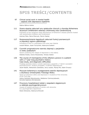 I PSYCHOGERIATRIA POLSKA 2009;6(3) SPIS TREŚCI/CONTENTS 97 Clinical social work in mental health – aspects with depressive inpatients D???????????????????????????????????? Sabine Bährer-Kohler 111 Ocena stopnia zaburzeń snu opiekunów chorych z chorobą Alzheimera leczonych inhibitorami esterazy cholinowej oraz Cerebrolizyną Evaluation of the caregivers sleep disturbances of Alzheimer’s disease patients treated with acetylcholine inhibitors and Cerebrolysin Andrzej Fidor, Maria Pilarczyk, Marcin Nastaj 117 Rozpowszechnienie łagodnych zaburzeń funkcji poznawczych w populacji regionu gdańskiego Prevalence of MCI in a population from area near Gdańsk Leszek Bidzan, Jacek Turczyński, Katarzyna Szabert 123 Czynniki prognostyczne nawrotu depresji u pacjentów w wieku podeszłym Factors predicting the relapse of depression in the elderly Elżbieta Kisiela, Iwona Kłoszewska, Tomasz Sobów 135 The course of meningioma of the olfactory groove in a patient with a 7-year long psychiatric history: Case study, and diagnostic difficulties Przebieg oponiaka okolicy rynienki węchowej u pacjentki z 7-letnim wywiadem psychiatrycznym: studium przypadku i trudności diagnostyczne Jacek Radzik, Aleksandra Zawadzka, Jerzy Leszek, Maciej Miś, Adam Druszcz 141 Poczucie koherencji a występowanie stanów depresyjnych u słuchaczy Uniwersytetu Trzeciego Wieku Sense of coherence (SOC) and depression in students of the University of the Third Age Halina Zielińska-Więczkowska, Waldemar Ciemnoczołowski, Kornelia Kędziora-Kornatowska 147 Przyczyny hospitalizacji kobiet z zespołami otępiennymi w oddziale psychogeriatrycznym Causes of hospital admission of women with dementia to a psychogeriatric department Edyta Głowacka, Katarzyna Broczek II Redaktor Naczelny/Editor-in-Chief Andrzej Kiejna (Wrocław, Poland) Redaktor Międzynarodowy/International Editor Ralf Ihl (Düsseldorf, Germany) Rada Naukowa/Editorial Board Aleksander Araszkiewicz (Bydgoszcz, Poland) Stavros Baloyannis (Thessaloniki, Greece) Leszek Bidzan (Gdańsk, Poland) Jason Brown (New York, USA) Pasquale Calabrese (Bochum, Germany) Salvatore DiMauro (New York, USA) Knut Engedal (Oslo, Norway) Tomasz Gabryelewicz (Warszawa, Poland) Andrzej Górski (Wrocław, Poland) George T. Grossberg (Saint Louis, USA) Lars Gustafson (Lund, Sweden) Khalid Iqbal (New York, USA) Marek Jarema (Warszawa, Poland) Marek Jutel (Wrocław, Poland) Thomas Kallert (Dresden, Germany) Siegfried Kanowski (Berlin, Germany) Cornelius Katona (London, Great Britain) Iwona Kłoszewska (Łódź, Poland) Amos Korczyn (Tel-Aviv, Israel) Raimundo Mateos (Santiago de Compostela, Spain) Konrad Maurer (Frankfurt/Main, Germany) Carlos Augusto de Mendonça Lima (Rio de Janeiro, Brasil) Bruce Duncan MacQueen (Bydgoszcz, Poland) Janusz Moryś (Gdańsk, Poland) Grzegorz Opala (Katowice, Poland) Tadeusz Parnowski (Warszawa, Poland) Maria Pąchalska (Kraków, Poland) Michael Philpot (London, Great Britain) Ryszard Podemski (Wrocław, Poland) Martin Prince (London, Great Britain) Stanisław Pużyński (Warszawa, Poland) Jiři Raboch (Prague, Czech Republic) Barry Reisberg (New York, USA) Jarl Risberg (Lund, Sweden) Joanna Rymaszewska (Wrocław, Poland) Johannes Schröder (Heidelberg, Germany) Andrzej Szczudlik (Kraków, Poland) Nicoleta Tataru (Oradea, Romania) Jerzy Vetulani (Kraków, Poland) Kolegium Redakcyjne/Executive Board Andrzej Kiejna, Jerzy Leszek, Ralf Ihl, Joanna Rymaszewska, Aleksandra Zawadzka, Tomasz Adamowski, Patryk Piotrowski Sekretarz Redakcyjny/Editorial Secretary Aleksandra Zawadzka, Patryk Piotrowski e-mail: [email protected] Adres Korespondencyjny Redakcji/Correspondence Address PSYCHOGERIATRIA POLSKA 50-119 Wrocław, ul. Nożownicza 4/8, Poland tel. (+48) (71) 343 21 52; faks (+48) (71) 343 21 55 Dział Reklamy i Marketingu/Advertising and Marketing Section Tomasz Adamowski e-mail: [email protected] Redakcja nie odpowiada za treść zamieszczonych reklam Projekt graficzny/design: Paweł Jaszczuk Skład i druk/press: Mediacom sp. z o.o., www.mediacom.com.pl Wydawca/Publisher FUNDACJA OCHRONY ZDROWIA PSYCHICZNEGO FOUNDATION OF MENTAL HEALTH 50-119 Wrocław, ul. Nożownicza 4/8, Poland http://www.fozp.org.pl nakład 500 egz. Copyright ©2004 Fundacja Ochrony Zdrowia Psychicznego III PSYCHOGERIATRIA POLSKA 2009;6(3) Od Redakcji Szanowni Czytelnicy „ Psychogeriatrii Polskiej”, Bogactwo badań nad zaburzeniami psychicznymi występującymi u osób w wieku podeszłym pozwala nam przygotowywać i wybierać do druku artykuły o zróżnicowanej tematyce. Dzięki temu, kolejny numer czasopisma dotyka zarówno aspektów społecznych, psychologicznych, jak i biologicznych procesu starzenia się. Pragniemy, aby lektura „ Psychogeriatrii Polskiej” pozwoliła nie tylko na doskonalenie warsztatu praktyka i klinicysty, ale również motywowała do własnych obserwacji oraz kreowania nowych, ciekawych badań naukowych. Zachęcamy zatem Wszystkich Czytelników do dzielenia się swymi spostrzeżeniami; do współpracy i współtworzenia kwartalnika „ Psychogeriatria Polska”, poprzez nadsyłanie autorskich, szczególnie oryginalnych artykułów. Mamy nadzieję, że ten numer spełni Państwa oczekiwania i będzie stanowił inspirację w pracy. Redaktor Naczelny Prof. Andrzej Kiejna IV PSYCHOGERIATRIA POLSKA 2009;6(3) From the Editor LIPIEC | WRZESIEŃ 2009 VOL 6 NO 3 Organ naukowy Polskiego Towarzystwa Psychogeriatrycznego oraz Sekcji Psychogeriatrii i Choroby Alzheimera Polskiego Towarzystwa Psychiatrycznego An official journal of the Polish Association of Geriatric Psychiatry and of the Old Age Psychiatry and Alzheimer’s Section of the Polish Psychiatric Association Indexed in EMBASE / Excerpta Medica INDEX COPERNICUS ICV 4,98 pkt PsycINFO KBN 4,0