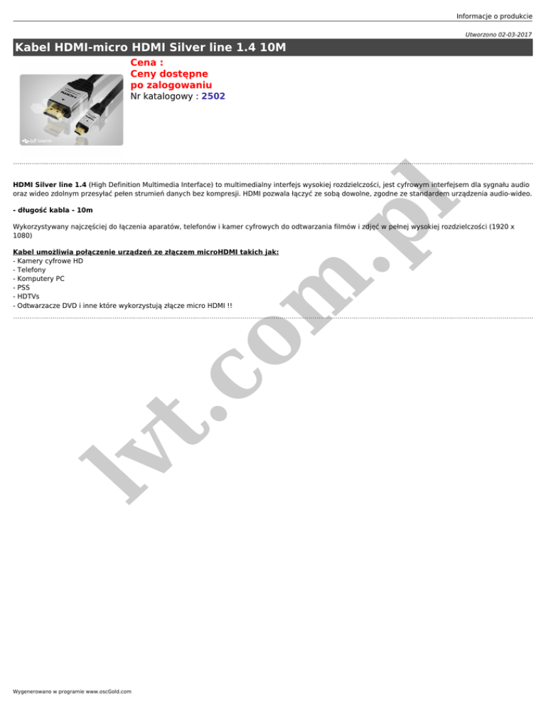 Informacje o produkcie Utworzono 02-03-2017 Kabel HDMI-micro HDMI Silver line 1.4 10M Cena : Ceny dostępne po zalogowaniu Nr katalogowy : 2502 l HDMI Silver line 1.4 (High Definition Multimedia Interface) to multimedialny interfejs wysokiej rozdzielczości, jest cyfrowym interfejsem dla sygnału audio oraz wideo zdolnym przesyłać pełen strumień danych bez kompresji. HDMI pozwala łączyć ze sobą dowolne, zgodne ze standardem urządzenia audio-wideo. m .p - długość kabla - 10m Wykorzystywany najczęściej do łączenia aparatów, telefonów i kamer cyfrowych do odtwarzania filmów i zdjęć w pełnej wysokiej rozdzielczości (1920 x 1080) lv t. co Kabel umożliwia połączenie urządzeń ze złączem microHDMI takich jak: - Kamery cyfrowe HD - Telefony - Komputery PC - PSS - HDTVs - Odtwarzacze DVD i inne które wykorzystują złącze micro HDMI !! Wygenerowano w programie www.oscGold.com