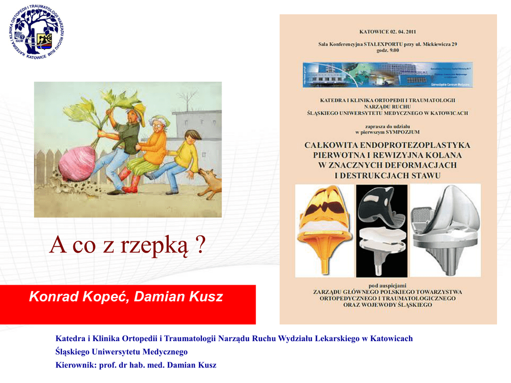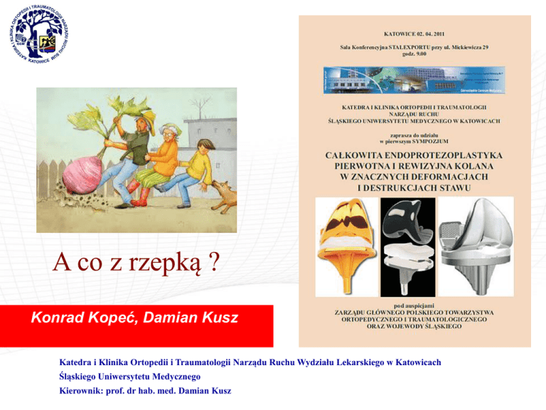A co z rzepką ? Konrad Kopeć, Damian Kusz Katedra i Klinika Ortopedii i Traumatologii Narządu Ruchu Wydziału Lekarskiego w Katowicach Śląskiego Uniwersytetu Medycznego Kierownik: prof. dr hab. med. Damian Kusz Pytania • Czy w pierwotnej endoprotezoplastyce kolana implantować endoprotezę rzepki? • Czy w rewizyjnej endoprotezoplastyce kolana implantować endoprotezę rzepki? • Jak uniknąć zaburzeń toru rzepki i wynikających z tego dolegliwości? • Czy wtórna endoprotezoplastyka rzepki jest jest receptą na dolegliwości przedziału przedniego kolana po endoprotezoplastyce dwuprzedziałowej? Statystyka • Pierwotna implantacja endoprotezy rzepki wciąż pozostaje kontrowersyjna. • Nie wykazano różnic w wynikach klinicznych, funkcjonalnych i dolegliwościach bólowych w pierwotnej endoprotezoplastyce kolana z implantacją rzepki (RS – resurfacing of the patella) i bez implantacji rzepki (NRS – non resurfacing of the patella). S. H. L. Lygre, B. Espehaug, L. I. Havelin, S. E. Vollset, O. Furnes.: Does patella resurfacing really matter? Pain and function in 972 patients after primary total knee arthroplasty. An observational study from the Norwegian Arthroplasty Register. Acta Orthopaedica, 2010; 81(1): 97-107. Statystyka • Wczesne wyniki RS względem NRS są porównywalne, jednak ilość rewizji z powodu dolegliwości przedziału przedniego kolana jest większa w endoprotezoplastyce dwuprzedziałowej. W. J. Clements, L. Miller, S. H. Whitehouse, S. E. Graves, P. Ryan, R. W. Crawford.: Early outcomes of patella resurfacing in total knee arthroplasty. A report from the Australian Orthopaedic Association National Joint Replacement Registry. Acta Orthopaedica, 2010; 81(1): 108-113. Statystyka • Wyniki wtórnej endoprotezoplastyki rzepki są gorsze w stosunku do pierwotnej endoprotezoplastyki trójprzedziałowej. Muoneke, HE; Khan, AM; Giannikas, KA, et al.: Secondary resurfacing of the patella for persistent anterior knee pain after primary knee arthroplasty. JBJS BVJUL 2003 •W przypadku obustronnej endoprotezoplastyki kolana z endoprotezą dwuprzedziałową po jednej stronie i trójprzedziałową po drugiej ocena subiektywna pacjentów wskazuje na przewagę pierwotnej endoprotezoplastyki stawu rzepkowo – udowego. Statystyka • Nie wykazano różnic w wynikach pierwotnej endoprotezoplastyki kolana z implantacją rzepki (RS) i bez implantacji rzepki (NRS) u pacjentów z RZS po 2,7 latach. Shoji,H; Yoshino,S; Kajino.: Patellar replacement in billeateral TKA - a study of patients who had rheumatoid arthtritis and no gross deformity of the patella. JBJS 1989. • Po 6.6 latach w badaniu tych samych grup pacjentów z RZS wykazano w grupie NRS wzrost dolegliwości bólowych przy chodzeniu po schodach, wstawaniu i wzrost kompresji rzepki. •Kajino, A; Yoshino, S; Kameyama, S, et al. Comparison of the results of bilateral total knee arthroplasty with and without patellar replacement for rheumatoid arthritis - A follow-up note JBJS 1997. Statystyka Badanie prospektywne dwóch grup: 50 pacjentów TKA RS – 50 pacjentów TKA NRS • Obserwacja krótkoterminowa 2 lata: • Obserwacja długoterminowa 8-10 lat: • Mniejszy ból w NRS (p<0.03) • Brak różnic po 4 latach • Brak różnic w wynikach klinicznych • W obserwacji 8-10 letniej lepsze wyniki w grupie RS • 2 rewizje w grupie NRS z powodu uporczywego bólu przedziału przedniego Mayman, D; Bourne, RB; Rorabeck, CH, et al.: Resurfacing versus not resurfacing the patella in TKA - 8-to 10-year results. J. Arthroplasty 2003. Bourne, RB; Rorabeck, CH; VAZ, M, et al.: Resurfacing vs not resurfacing the patella during TKR.. CORR 1995. Pooperacyjne problemy przedziału przedniego – 10% endoprotezoplastyk • Dolegliwości bólowe przedziału przedniego u pacjentów po endoprotezoplastyce stawu kolanowego • • • • • Soudry, Insal, CORR 1986 – 18% Picetti JBJS 1990 – 29% Levitsky, Scott CORR 1993 – 19% Boyd, Ewald JBJS 1993 – 10% Waters, Bentley 2003 – 25,1% • Niestabilność rzepki. • Złamanie rzepki. • Konflikt tkanek miękkich. • Uszkodzenie aparatu wyprostnego. • Zużycie polietylenu. • Obluzowanie implantu. Czy śródoperacyjnie można ocenić potrzebę wymiany rzepki • Nie ma korelacji między głębokością, rozmiarem i lokalizacją uszkodzeń chrząstki rzepki, a pooperacyjnym bólem przedziału przedniego, czy wynikiem funkcjonalnym endoprotezoplastyki. • Radiologiczny i śródoperacyjny obraz rzepki nie pozwala kwalifikować pacjenta do określonej procedury operacyjnej RS lub NRS. Han, I; Chang, CB; Lee, S, et al.: Correlation of the condition of the patellar articular cartilage and patellofemoral symptoms and function in osteoarthritic patients undergoing TKA. JBJS 2005. Jak uniknąć problemów z rzepką • Kluczem do sukcesu pozostaje właściwa technika operacyjna i tor rzepki, który uzyskujemy wyłącznie przez odpowiednie przycięcie i implantację elementu udowego i piszczelowego endoprotezy oraz odpowiednie zbalansowanie tkanek miękkich. Jak uniknąć problemów z rzepką • Najczęstszym błędem są zaburzenia rotacyjne elementów endoprotezy: • Niewłaściwa rotacja zewnętrzna elementu udowego i brak osiowości względem linii nadkłykciowej. • Niewłaściwa rotacja elementu piszczelowego i brak osiowości względem guzowatości piszczeli. • Nadmierne przyparcie przedziału przedniego. • Zwiększone napięcie troczków bocznych. Technika operacyjna • Pierwotna czy wtórna endoprotezoplastyka rzepki musi być wykonana dobrze. • Planowanie przedoperacyjne: • RTG kolana AP na długiej kliszy ze stawem biodrowym i skokowym na stojąco. • RTG boczne kolana. • RTG osiowe rzepki. Technika operacyjna • Uwolnienie rzepki z tkanek miękkich będących przyczyną potencjalnego konfliktu. • Oznaczenie granicy powierzchni stawowych - wierzchołka rzepki. Technika operacyjna • Oznaczenie środka wierzchołka rzepki. Technika operacyjna • 