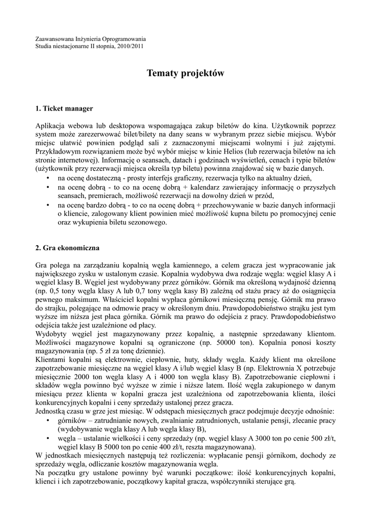 Zaawansowana Inżynieria Oprogramowania Studia niestacjonarne II stopnia, 2010/2011 Tematy projektów 1. Ticket manager Aplikacja webowa lub desktopowa wspomagająca zakup biletów do kina. Użytkownik poprzez system może zarezerwować bilet/bilety na dany seans w wybranym przez siebie miejscu. Wybór miejsc ułatwić powinien podgląd sali z zaznaczonymi miejscami wolnymi i już zajętymi. Przykładowym rozwiązaniem może być wybór miejsc w kinie Helios (lub rezerwacja biletów na ich stronie internetowej). Informację o seansach, datach i godzinach wyświetleń, cenach i typie biletów (użytkownik przy rezerwacji miejsca określa typ biletu) powinna znajdować się w bazie danych. • na ocenę dostateczną - prosty interfejs graficzny, rezerwacja tylko na aktualny dzień, • na ocenę dobrą - to co na ocenę dobrą + kalendarz zawierający informację o przyszłych seansach, premierach, możliwość rezerwacji na dowolny dzień w przód, • na ocenę bardzo dobrą - to co na ocenę dobrą + przechowywanie w bazie danych informacji o kliencie, zalogowany klient powinien mieć możliwość kupna biletu po promocyjnej cenie oraz wykupienia biletu sezonowego. 2. Gra ekonomiczna Gra polega na zarządzaniu kopalnią węgla kamiennego, a celem gracza jest wypracowanie jak największego zysku w ustalonym czasie. Kopalnia wydobywa dwa rodzaje węgla: węgiel klasy A i węgiel klasy B. Węgiel jest wydobywany przez górników. Górnik ma określoną wydajność dzienną (np. 0,5 tony węgla klasy A lub 0,7 tony węgla kasy B) zależną od stażu pracy aż do osiągnięcia pewnego maksimum. Właściciel kopalni wypłaca górnikowi miesięczną pensję. Górnik ma prawo do strajku, polegające na odmowie pracy w określonym dniu. Prawdopodobieństwo strajku jest tym wyższe im niższa jest płaca górnika. Górnik ma prawo do odejścia z pracy. Prawdopodobieństwo odejścia także jest uzależnione od płacy. Wydobyty węgiel jest magazynowany przez kopalnię, a następnie sprzedawany klientom. Możliwości magazynowe kopalni są ograniczone (np. 50000 ton). Kopalnia ponosi koszty magazynowania (np. 5 zł za tonę dziennie). Klientami kopalni są elektrownie, ciepłownie, huty, składy węgla. Każdy klient ma określone zapotrzebowanie miesięczne na węgiel klasy A i/lub węgiel klasy B (np. Elektrownia X potrzebuje miesięcznie 2000 ton węgla klasy A i 4000 ton węgla klasy B). Zapotrzebowanie ciepłowni i składów węgla powinno być wyższe w zimie i niższe latem. Ilość węgla zakupionego w danym miesiącu przez klienta w kopalni gracza jest uzależniona od zapotrzebowania klienta, ilości konkurencyjnych kopalni i ceny sprzedaży ustalonej przez gracza. Jednostką czasu w grze jest miesiąc. W odstępach miesięcznych gracz podejmuje decyzje odnośnie: • górników – zatrudnianie nowych, zwalnianie zatrudnionych, ustalanie pensji, zlecanie pracy (wydobywanie węgla klasy A lub węgla klasy B), • węgla – ustalanie wielkości i ceny sprzedaży (np. węgiel klasy A 3000 ton po cenie 500 zł/t, węgiel klasy B 5000 ton po cenie 400 zł/t, reszta magazynowana). W jednostkach miesięcznych następują też rozliczenia: wypłacanie pensji górnikom, dochody ze sprzedaży węgla, odliczanie kosztów magazynowania węgla. Na początku gry ustalone powinny być warunki początkowe: ilość konkurencyjnych kopalni, klienci i ich zapotrzebowanie, początkowy kapitał gracza, współczynniki sterujące grą. Gra kończy się po określonej liczbie miesięcy lub bankructwie kopalni. • na ocenę dostateczną – prosty interfejs graficzny (np. komunikaty tekstowe), • na ocenę dobrą – bardziej zaawansowany interfejs graficzny (wizualne prezentowanie posiadanych przez gracza zasobów), możliwość zapisania stanu gry i wznowienia jej od zapamiętanego stanu, kilka zdefiniowanych warunków początkowych odpowiadających różnym poziomom gry, system punktacji wyników graczy, lista rankingowa graczy, • na ocenę bardzo dobrą – serwis internetowy umożliwiający granie. 3. Pomocnik maklera Aplikacja wspomagająca pracę maklera giełdowego. Jej głównym zadaniem będzie generowanie wykresów oraz tabel zawierających informację o indeksach giełdowych na podstawie danych archiwalnych Giełdy Papierów Wartościowych. Aplikacja powinna mieć możliwość importu rzeczywistych danych (z pliku tekstowego) znajdujących się na stronie http://www.money.pl/gielda/ archiwum/spolki. Po wczytaniu danych użytkownik powinien mieć możliwość wybrania spółki, określenia terminu od/do (lub ostatni okres) oraz generowanie wykresu, tabeli i eksportu do pliku csv. • na ocenę dostateczną - funkcjonalności zbliżone z tymi na wyżej wymienionej stronie. • na ocenę dobrą - to co na ocenę dostateczną + możliwość porównywania kilku wybranych spółek na jednym wykresie / tabeli. System powinien zawierać również algorytm prognozujący ceny akcji dla wybranych spółek. • na ocenę bardzo dobrą - to co na ocenę dobrą + możliwość wirtualnej gry na giełdzie. Użytkownik powinien mieć możliwość założenia konta oraz grę na giełdzie za wirtualne pieniądze. W bazie danych powinny zostać zapisane informacje o użytkowniku, stanie jego konta oraz operacjach na akcjach (kupno/sprzedaż) w danym dniu. Aplikacja powinna dawać możliwość wpisania nowych (aktualnych) danych o akcjach i automatycznie przeliczać ile zarobił/stracił dany użytkownik 4. Fotogaleria Serwis internetowy pozwalający na przechowywanie i udostępnianie zdjęć cyfrowych w postaci albumów fotografii. Użytkownik powinien mieć możliwość przesłania wybranych przez siebie plików graficznych do repozytorium, określenia ich atrybutów (np. opisu), edycji grafiki w pewnym stopniu (np. zmiany rozmiaru, jasności, kontrastu), zarządzania repozytorium (tworzenie folderów, przenoszenie plików), udostępniania określonych obrazów publicznie i/lub w ograniczonym zakresie (np. po wpis
