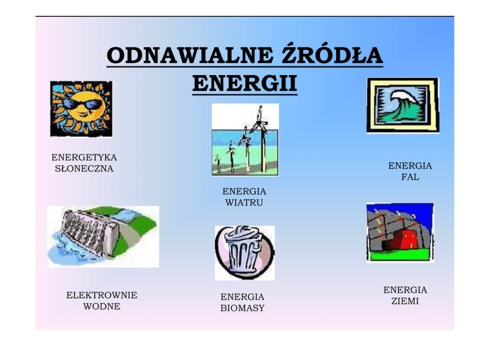 ODNAWIALNE ŹRÓDŁA ENERGII ENERGETYKA SŁONECZNA ENERGIA FAL ENERGIA WIATRU ELEKTROWNIE WODNE ENERGIA BIOMASY ENERGIA ZIEMI ENERGETYKA SŁONECZNA Słońce jest podstawowym źródłem energii dla naszej planety. Przed milionami lat energia słońca docierająca do ziemi została uwięziona w węglu, ropie naftowej, gazie ziemnym itp. RównieŜ słońcu zawdzięczamy energię jaką niesie ze sobą wiatr czy fale morskie. MoŜna takŜe bezpośrednio wykorzystywać energię słoneczną poprzez zastosowanie specjalnych systemów do pozyskiwania i akumulowania energii słonecznej. Promieniowanie słoneczne jest to strumień energii emitowany przez Słońce równomiernie we wszystkich kierunkach… …Miarą wielkości promieniowania słonecznego docierającego ze słońca do ziemi jest tzw. stała słoneczna. Jest ona wartością gęstości strumienia energii promieniowania słonecznego na powierzchni stratosfery i obecnie wynosi 1,4 kW/m2. W promieniowaniu słonecznym docierającym do powierzchni Ziemi wyróŜnia się trzy składowe promieniowania: bezpośrednie pochodzi od widocznej tarczy słonecznej rozproszone powstaje w wyniku wielokrotnego załamania na składnikach atmosfery odbite powstaje w skutek odbić od elementów krajobrazu i otoczenia. Elektrownia "Solar one" w Kalifornii "Solar One" w Kalifornii jest największą na świecie słoneczną "siłownią" o maksymalnej mocy 10 MW. Ponad 1800 zwierciadeł śledzi oddzielnie ruch słońca i odbija jego ciepło do kolektora znajdującego się w centrum urządzenia. Zakrzywione zwierciadła Zakrzywione zwierciadła śledzą ruch słońca i skupiają promienie w celu podgrzania oleju w rurach. Ciepło przenosi się na wodę, która wrze. Para napędza turbiny podłączone do generatorów prądu elektrycznego. Zakrzywione zwierciadła ENERGIA FAL W korzystnych warunkach topograficznych moŜliwe jest wykorzystanie pływów morza. Ujcie rzeki wpływającej do morza i wysokie jej brzegi umoŜliwiają budowę zapory, pozwalającej na wpłynięcie wód morskich w dolinę rzeki podczas przypływu i wypuszczeniu ich poprzez turbiny wodne podczas odpływu. Największa na świecie taka elektrownia znajduje się we Francji. Ma ona 24 turbiny wodne rewersyjne o mocy po 10MW, a więc cała elektrownia ma moc 240MW. Pracuje od 1967 roku. Rząd "kiwających się kaczek" Rząd "kiwających się kaczek" - urządzeń, które absorbują energię fal morskich i umoŜliwiają przetworzenie jej na elektryczność. Jedyna na świecie elektrownia wykorzystująca pływy morskie Jedyna na świecie elektrownia wykorzystująca pływy morskie, zbudowana w ujściu rzeki Rance we Francji. Na zaporze zamontowano turbiny pracujące w czasie przypływu i odpływu. wydajność elektrowni jest stosunkowo niska. ENERGIA WIATRU Energia wiatru jest dziś powszechnie wykorzystywana - w gospodarstwach domowych, jak i na szerszą skalę w elektrowniach wiatrowych. Stosowanie tego typu rozwiązań nie jest bardzo kosztowne, ze względu na niezbyt skomplikowaną budowę urządzeń jak i nieskomplikowaną eksploatację. Energia wiatru w poszczególnych miesiącach roku (wykres powstał na podstawie pomiarów na terenie Danii, ale jest wspólny dla klimatu umiarkowanego). Typowa zmienność prędkości wiatru w ciągu doby. Budowa elektrowni wiatrowej 1) kontroler 2) siłownik mechanizmu przestawiania łopat 3) główny wał 4) chłodnica oleju 5) skrzynia przekładniowa 6) wieloprocesorowy układ sterowania 7) hamulec postojowy 8) dˇwig dla obsługi 9) transformator 10) piasta łopaty 11) łoŜysko łopaty 12) łopata 13) układ hamowania wirnika 14) układ hydrauliczny 15) tarcza hydraulicznego układu hamowania wirnika 16) pierścień układu kierunkowania 17) fundament 18) koła zębate układu kierunkowania 19) generator 20) chłodnica generatora powłok przymocowanych do belki nośnej. Budowa elektrowni wiatrowej ENERGIA ZIEMI Zasoby petrotermiczne są zmagazynowane w warstwach skalnych i mają znaczenie perspektywiczne. Sposób wykorzystania zasobów geotermalnych zaleŜy od temperatury czynnika grzejnego. Przyjęto, Ŝe przy temperaturze powyŜej 120-150° C opłaca się go wykorzystać do produkcji energii elektrycznej. Przy niŜszych temperaturach czynnika grzejnego wchodzi w rachubę wykorzystanie do celów ciepłowniczych, klimatyzacyjnych, wytwarzania ciepłej wody uŜytkowej w systemach miejskich i przemysłowych, do ogrzewania szklarni, hodowli ryb, do celów balneologicznych i rekreacyjnych. Ciepło moŜe być pobierane z : Wodya) powierzchniowej (rzeki, jeziora, sztuczne zbiorniki) b) gruntowej: ma przewaŜnie przez cały rok temperaturę w granicach +8 do +10 C. Konieczne jest budowanie studni do pobierania i odprowadzania oziębionej wody po oddaniu ciepła w pompie. c) ścieków: mają ograniczone zastosowanie ze względu na stopień zanieczyszczenia powietrza z otoczenia. Gruntów jest dobrym akumulatorem ciepła, poniewaŜ na całej powierzchni pochłania energię słoneczną oraz przejmuje energię cieplną za pomocą konwekcji i deszczu.Dopływ ciepła następuje z górnej powierzchni gruntu i w bardzo znikomej części z jego głębi. Następuje więc samoregulacja cieplna gruntu. Pobór energii przez pompę ciepła następuje drogą pośrednią, przez zakopanie w ziemi kolektory gruntowe wykonane najczęściej z rur polietylenowych, wewnątrz przepływa roztwór o obniŜonej temperaturze krzepnięcia, przekazujący ciepło z gruntu do wymiennika płytowego (parownika) gdzie jest ono przejmowane przez parujący czynnik chłodniczy. Budowa pompy do pobierania energii z Ziemi : Energia geotermalna to naturalne ciepło Ziemi skumulowane w gruntach, skałach, wodach i parach wypełniających pory i szczeliny skalne. Występuje pod przykryciem nieprzepuszczalnych skał o niskiej przewodności cieplnej. Na powierzchnię ziemi wydobywa się dzięki przewodzeniu i konwekcji. Przypuszcza się, Ŝe energia ta jest wynikiem rozpadu pierwiastków promieniotwórczych 