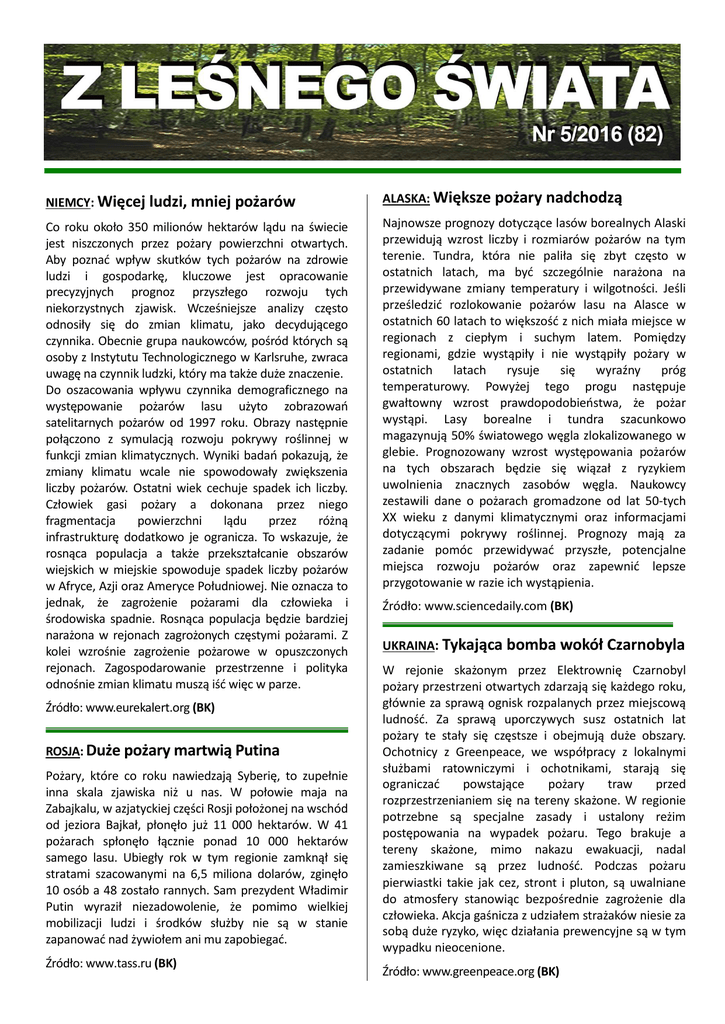 NIEMCY: Więcej ludzi, mniej pożarów ALASKA: Większe pożary nadchodzą Co roku około 350 milionów hektarów lądu na świecie jest niszczonych przez pożary powierzchni otwartych. Aby poznać wpływ skutków tych pożarów na zdrowie ludzi i gospodarkę, kluczowe jest opracowanie precyzyjnych prognoz przyszłego rozwoju tych niekorzystnych zjawisk. Wcześniejsze analizy często odnosiły się do zmian klimatu, jako decydującego czynnika. Obecnie grupa naukowców, pośród których są osoby z Instytutu Technologicznego w Karlsruhe, zwraca uwagę na czynnik ludzki, który ma także duże znaczenie. Do oszacowania wpływu czynnika demograficznego na występowanie pożarów lasu użyto zobrazowań satelitarnych pożarów od 1997 roku. Obrazy następnie połączono z symulacją rozwoju pokrywy roślinnej w funkcji zmian klimatycznych. Wyniki badań pokazują, że zmiany klimatu wcale nie spowodowały zwiększenia liczby pożarów. Ostatni wiek cechuje spadek ich liczby. Człowiek gasi pożary a dokonana przez niego fragmentacja powierzchni lądu przez różną infrastrukturę dodatkowo je ogranicza. To wskazuje, że rosnąca populacja a także przekształcanie obszarów wiejskich w miejskie spowoduje spadek liczby pożarów w Afryce, Azji oraz Ameryce Południowej. Nie oznacza to jednak, że zagrożenie pożarami dla człowieka i środowiska spadnie. Rosnąca populacja będzie bardziej narażona w rejonach zagrożonych częstymi pożarami. Z kolei wzrośnie zagrożenie pożarowe w opuszczonych rejonach. Zagospodarowanie przestrzenne i polityka odnośnie zmian klimatu muszą iść więc w parze. Najnowsze prognozy dotyczące lasów borealnych Alaski przewidują wzrost liczby i rozmiarów pożarów na tym terenie. Tundra, która nie paliła się zbyt często w ostatnich latach, ma być szczególnie narażona na przewidywane zmiany temperatury i wilgotności. Jeśli prześledzić rozlokowanie pożarów lasu na Alasce w ostatnich 60 latach to większość z nich miała miejsce w regionach z ciepłym i suchym latem. Pomiędzy regionami, gdzie wystąpiły i nie wystąpiły pożary w ostatnich latach rysuje się wyraźny próg temperaturowy. Powyżej tego progu następuje gwałtowny wzrost prawdopodobieństwa, że pożar wystąpi. Lasy borealne i tundra szacunkowo magazynują 50% światowego węgla zlokalizowanego w glebie. Prognozowany wzrost występowania pożarów na tych obszarach będzie się wiązał z ryzykiem uwolnienia znacznych zasobów węgla. Naukowcy zestawili dane o pożarach gromadzone od lat 50-tych XX wieku z danymi klimatycznymi oraz informacjami dotyczącymi pokrywy roślinnej. Prognozy mają za zadanie pomóc przewidywać przyszłe, potencjalne miejsca rozwoju pożarów oraz zapewnić lepsze przygotowanie w razie ich wystąpienia. Źródło: www.eurekalert.org (BK) ROSJA: Duże pożary martwią Putina Pożary, które co roku nawiedzają Syberię, to zupełnie inna skala zjawiska niż u nas. W połowie maja na Zabajkalu, w azjatyckiej części Rosji położonej na wschód od jeziora Bajkał, płonęło już 11 000 hektarów. W 41 pożarach spłonęło łącznie ponad 10 000 hektarów samego lasu. Ubiegły rok w tym regionie zamknął się stratami szacowanymi na 6,5 miliona dolarów, zginęło 10 osób a 48 zostało rannych. Sam prezydent Władimir Putin wyraził niezadowolenie, że pomimo wielkiej mobilizacji ludzi i środków służby nie są w stanie zapanować nad żywiołem ani mu zapobiegać. Źródło: www.tass.ru (BK) Źródło: www.sciencedaily.com (BK) UKRAINA: Tykająca bomba wokół Czarnobyla W rejonie skażonym przez Elektrownię Czarnobyl pożary przestrzeni otwartych zdarzają się każdego roku, głównie za sprawą ognisk rozpalanych przez miejscową ludność. Za sprawą uporczywych susz ostatnich lat pożary te stały się częstsze i obejmują duże obszary. Ochotnicy z Greenpeace, we współpracy z lokalnymi służbami ratowniczymi i ochotnikami, starają się ograniczać powstające pożary traw przed rozprzestrzenianiem się na tereny skażone. W regionie potrzebne są specjalne zasady i ustalony reżim postępowania na wypadek pożaru. Tego brakuje a tereny skażone, mimo nakazu ewakuacji, nadal zamieszkiwane są przez ludność. Podczas pożaru pierwiastki takie jak cez, stront i pluton, są uwalniane do atmosfery stanowiąc bezpośrednie zagrożenie dla człowieka. Akcja gaśnicza z udziałem strażaków niesie za sobą duże ryzyko, więc działania prewencyjne są w tym wypadku nieocenione. Źródło: www.greenpeace.org (BK) NIEMCY: Dochody z produkcji drewna USA: Interaktywna mapa historyczna w państwowym gospodarstwie leśnym Produkty Leśne Południa Sieć testowych gospodarstw leśnych w Niemczech (TBN-Forst) obejmuje 350 gospodarstw państwowych, korporacyjnych i prywatnych o powierzchni leśnej wynoszącej co najmniej 200 ha. Gospodarstwa te składają corocznie sprawozdania z działalności. Od 2003 r. obejmują one pięć wyróżnionych w rachunkowości i zdefiniowanych sfer działalności produkcyjnej (Produktbereiche – PB): Dzięki nowej interaktywnej mapie historycznej Produkty Leśne Południa opracowanej przez naukowców z amerykańskiej służby leśnej (US Forest Service) użytkownicy mogą śledzić przepływy produktów leśnych w południowej części Stanów Zjednoczonych – zwizualizowaną opowieść o upadku branży produktów leśnych na południu USA w ciągu ostatnich dziesięcioleci. Dane ośrodka inwentaryzacji i analiz służby leśnej (Inventory Forest Service and Analysis - FIA) wprowadzone do platformy ArcGIS Online (AGOL) instytutu ESRI (Environmental Systems Research Institute) Produkty Leśne Południa - Silnik Gospodarczy, tworzą stale aktualizowany przewodnik. Poszczególne warstwy mapy pozwalają śledzić produkcję drewna okrągłego, liściastego i iglastego, kłód tartacznych, papierówki i forniru na różnych poziomach: lokalnym, regionalnym i krajowym. Jedna z warstw zawiera informacje o pierwotn