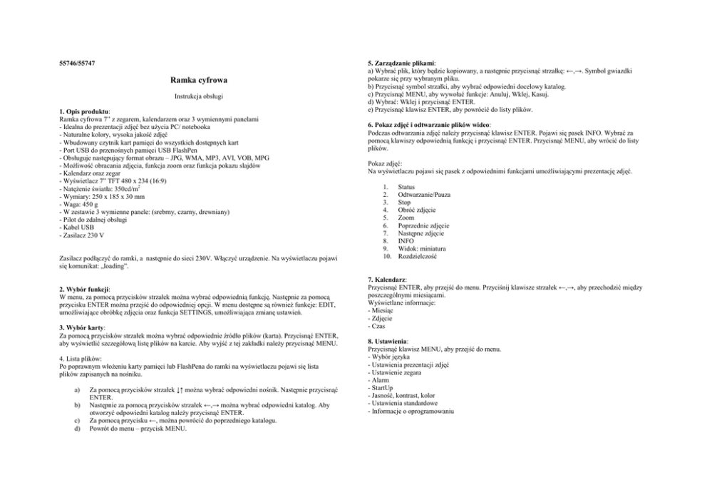 55746/55747 Ramka cyfrowa Instrukcja obsługi 1. Opis produktu: Ramka cyfrowa 7” z zegarem, kalendarzem oraz 3 wymiennymi panelami - Idealna do prezentacji zdjęć bez uŜycia PC/ notebooka - Naturalne kolory, wysoka jakość zdjęć - Wbudowany czytnik kart pamięci do wszystkich dostępnych kart - Port USB do przenośnych pamięci USB FlashPen - Obsługuje następujący format obrazu – JPG, WMA, MP3, AVI, VOB, MPG - MoŜliwość obracania zdjęcia, funkcja zoom oraz funkcja pokazu slajdów - Kalendarz oraz zegar - Wyświetlacz 7” TFT 480 x 234 (16:9) - NatęŜenie światła: 350cd/m2 - Wymiary: 250 x 185 x 30 mm - Waga: 450 g - W zestawie 3 wymienne panele: (srebrny, czarny, drewniany) - Pilot do zdalnej obsługi - Kabel USB - Zasilacz 230 V Zasilacz podłączyć do ramki, a następnie do sieci 230V. Włączyć urządzenie. Na wyświetlaczu pojawi się komunikat: „loading”. 2. Wybór funkcji: W menu, za pomocą przycisków strzałek moŜna wybrać odpowiednią funkcję. Następnie za pomocą przycisku ENTER moŜna przejść do odpowiedniej opcji. W menu dostępne są równieŜ funkcje: EDIT, umoŜliwiające obróbkę zdjęcia oraz funkcja SETTINGS, umoŜliwiająca zmianę ustawień. 3. Wybór karty: Za pomocą przycisków strzałek moŜna wybrać odpowiednie źródło plików (karta). Przycisnąć ENTER, aby wyświetlić szczegółową listę plików na karcie. Aby wyjść z tej zakładki naleŜy przycisnąć MENU. 4. Lista plików: Po poprawnym włoŜeniu karty pamięci lub FlashPena do ramki na wyświetlaczu pojawi się lista plików zapisanych na nośniku. a) b) c) d) Za pomocą przycisków strzałek ↓↑ moŜna wybrać odpowiedni nośnik. Następnie przycisnąć ENTER. Następnie za pomocą przycisków strzałek ←,→ moŜna wybrać odpowiedni katalog. Aby otworzyć odpowiedni katalog naleŜy przycisnąć ENTER. Za pomocą przycisku ←, moŜna powrócić do poprzedniego katalogu. Powrót do menu – przycisk MENU. 5. Zarządzanie plikami: a) Wybrać plik, który będzie kopiowany, a następnie przycisnąć strzałkę: ←,→. Symbol gwiazdki pokarze się przy wybranym pliku. b) Przycisnąć symbol strzałki, aby wybrać odpowiedni docelowy katalog. c) Przycisnąć MENU, aby wywołać funkcje: Anuluj, Wklej, Kasuj. d) Wybrać: Wklej i przycisnąć ENTER. e) Przycisnąć klawisz ENTER, aby powrócić do listy plików. 6. Pokaz zdjęć i odtwarzanie plików wideo: Podczas odtwarzania zdjęć naleŜy przycisnąć klawisz ENTER. Pojawi się pasek INFO. Wybrać za pomocą klawiszy odpowiednią funkcję i przycisnąć ENTER. Przycisnąć MENU, aby wrócić do listy plików. Pokaz zdjęć: Na wyświetlaczu pojawi się pasek z odpowiednimi funkcjami umoŜliwiającymi prezentację zdjęć. 1. 2. 3. 4. 5. 6. 7. 8. 9. 10. Status Odtwarzanie/Pauza Stop Obróć zdjęcie Zoom Poprzednie zdjęcie Następne zdjęcie INFO Widok: miniatura Rozdzielczość 7. Kalendarz: Przycisnąć ENTER, aby przejść do menu. Przyciśnij klawisze strzałek ←,→, aby przechodzić między poszczególnymi miesiącami. Wyświetlane informacje: - Miesiąc - Zdjęcie - Czas 8. Ustawienia: Przycisnąć klawisz MENU, aby przejść do menu. - Wybór języka - Ustawienia prezentacji zdjęć - Ustawienie zegara - Alarm - StartUp - Jasność, kontrast, kolor - Ustawienia standardowe - Informacje o oprogramowaniu