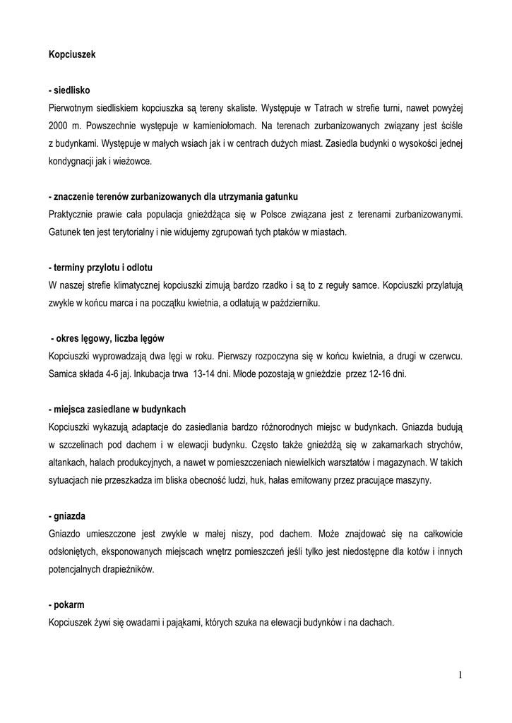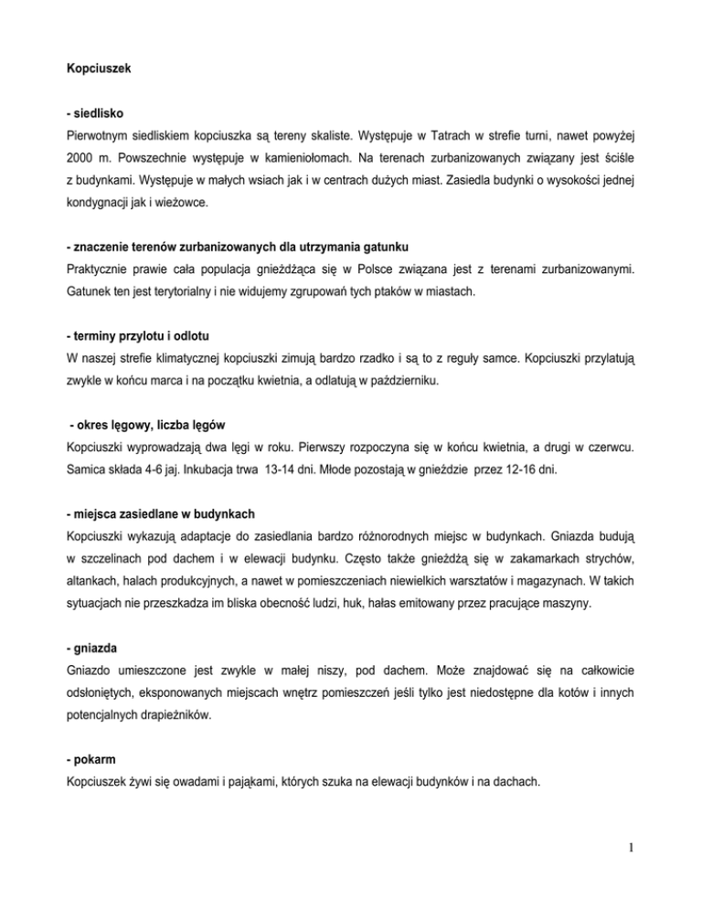 Kopciuszek - siedlisko Pierwotnym siedliskiem kopciuszka są tereny skaliste. Występuje w Tatrach w strefie turni, nawet powyżej 2000 m. Powszechnie występuje w kamieniołomach. Na terenach zurbanizowanych związany jest ściśle z budynkami. Występuje w małych wsiach jak i w centrach dużych miast. Zasiedla budynki o wysokości jednej kondygnacji jak i wieżowce. - znaczenie terenów zurbanizowanych dla utrzymania gatunku Praktycznie prawie cała populacja gnieżdżąca się w Polsce związana jest z terenami zurbanizowanymi. Gatunek ten jest terytorialny i nie widujemy zgrupowań tych ptaków w miastach. - terminy przylotu i odlotu W naszej strefie klimatycznej kopciuszki zimują bardzo rzadko i są to z reguły samce. Kopciuszki przylatują zwykle w końcu marca i na początku kwietnia, a odlatują w październiku. - okres lęgowy, liczba lęgów Kopciuszki wyprowadzają dwa lęgi w roku. Pierwszy rozpoczyna się w końcu kwietnia, a drugi w czerwcu. Samica składa 4-6 jaj. Inkubacja trwa 13-14 dni. Młode pozostają w gnieździe przez 12-16 dni. - miejsca zasiedlane w budynkach Kopciuszki wykazują adaptacje do zasiedlania bardzo różnorodnych miejsc w budynkach. Gniazda budują w szczelinach pod dachem i w elewacji budynku. Często także gnieżdżą się w zakamarkach strychów, altankach, halach produkcyjnych, a nawet w pomieszczeniach niewielkich warsztatów i magazynach. W takich sytuacjach nie przeszkadza im bliska obecność ludzi, huk, hałas emitowany przez pracujące maszyny. - gniazda Gniazdo umieszczone jest zwykle w małej niszy, pod dachem. Może znajdować się na całkowicie odsłoniętych, eksponowanych miejscach wnętrz pomieszczeń jeśli tylko jest niedostępne dla kotów i innych potencjalnych drapieżników. - pokarm Kopciuszek żywi się owadami i pająkami, których szuka na elewacji budynków i na dachach. 1 - jak poznać, że budynek jest zasiedlony przez gatunek Obecność kopciuszka najlepiej ustalić poprzez kontrolę obiektu w okresie lęgowym. Samce śpiewają najintensywniej ok. 1-2 godziny przed świtem. W okresie gdy karmią pisklęta są łatwo zauważalne. Jeśli jest to wysoki budynek, kamienica i kopciuszek gnieździ się gdzieś w partiach szczytowych elewacji lub w szczelinach przybudówek, kominów to gatunek ten może nie być zauważony przez mieszkańców. Wówczas ptak rzadziej pojawia się w niższych partiach budynku gdzie mógłby być spostrzeżony. - uciążliwości ze strony gatunku i jakim zapobiegać W miejscach gdzie kopciuszek jest zauważany przez mieszkańców budzi powszechną sympatie i chęć pomocy. - warunki remontu W przypadku remontu bardzo trudno jest ustalić wszystkie potencjalne miejsca lęgowe w budynku, które należałoby zabezpieczyć przed możliwością zasiedlania, jeśli budynek miałby być remontowany w okresie lęgowym. Niewielkie szczeliny prowadzące do potencjalnych nisz gniazdowych są trudne do lokalizacji. W przypadku gdy dach pokryty jest dachówką jest to szczególnie trudne. Jeżeli gniazdo zostanie wykryte dopiero w czasie remontu, można starać się tak dostosować prace, by maksymalnie skrócić czas ich wykonywania wokół gniazda. Kopciuszki są często bardzo tolerancyjne, odporne na bliską obecność człowieka. - zasiedlanie gniazd przez inne gatunki Konkurentem do nisz gniazdowych kopciuszka jest wróbel i jerzyk, które zwykle wygrywają w takich sytuacjach. - jakie budki i instalacje w budynkach dla gatunku Budki dla kopciuszków umieszczamy na elewacji budynku pod samym dachem. Można je też umieszczać na strychach, w halach, magazynach i innych pomieszczeniach gdzie ptaki mogą mieć dostęp przez całą dobę, nawet w dużej odległości od miejsca gdzie ptaki wchodzą do pomieszczenia. Budki wieszamy na wysokości 2,5 metra lub wyżej. Na niskich strychach mogą być mocowane nawet na wysokości podłogi. 2 Ryc. 1. Budka dla kopciuszka. (rys. z Szokalski M., Wojtatowicz J. Ptaki w ogrodzie. 1989, PWRiL) 3 Ryc. 2. Budka dla kopciuszka. Wymiary desek (rys. z Szokalski M., Wojtatowicz J. Ptaki w ogrodzie. 1989, PWRiL) 4