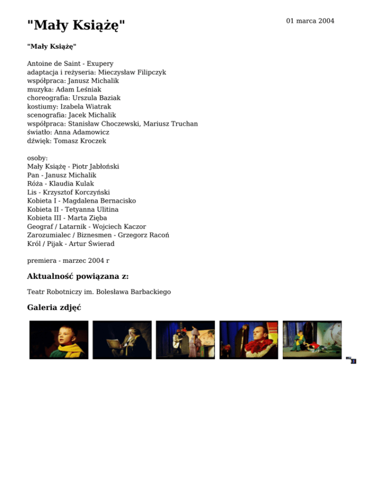 "Mały Książę" "Mały Książę" Antoine de Saint - Exupery adaptacja i reżyseria: Mieczysław Filipczyk współpraca: Janusz Michalik muzyka: Adam Leśniak choreografia: Urszula Baziak kostiumy: Izabela Wiatrak scenografia: Jacek Michalik współpraca: Stanisław Choczewski, Mariusz Truchan światło: Anna Adamowicz dźwięk: Tomasz Kroczek osoby: Mały Książę - Piotr Jabłoński Pan - Janusz Michalik Róża - Klaudia Kulak Lis - Krzysztof Korczyński Kobieta I - Magdalena Bernacisko Kobieta II - Tetyanna Ulitina Kobieta III - Marta Zięba Geograf / Latarnik - Wojciech Kaczor Zarozumialec / Biznesmen - Grzegorz Racoń Król / Pijak - Artur Świerad premiera - marzec 2004 r Aktualność powiązana z: Teatr Robotniczy im. Bolesława Barbackiego Galeria zdjęć 01 marca 2004