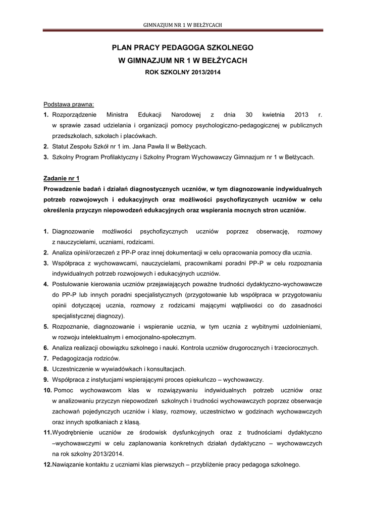 GIMNAZJUM NR 1 W BEŁŻYCACH PLAN PRACY PEDAGOGA SZKOLNEGO W GIMNAZJUM NR 1 W BEŁŻYCACH ROK SZKOLNY 2013/2014 Podstawa prawna: 1. Rozporządzenie Ministra Edukacji Narodowej z dnia 30 kwietnia 2013 r. w sprawie zasad udzielania i organizacji pomocy psychologiczno-pedagogicznej w publicznych przedszkolach, szkołach i placówkach. 2. Statut Zespołu Szkół nr 1 im. Jana Pawła II w Bełżycach. 3. Szkolny Program Profilaktyczny i Szkolny Program Wychowawczy Gimnazjum nr 1 w Bełżycach. Zadanie nr 1 Prowadzenie badań i działań diagnostycznych uczniów, w tym diagnozowanie indywidualnych potrzeb rozwojowych i edukacyjnych oraz możliwości psychofizycznych uczniów w celu określenia przyczyn niepowodzeń edukacyjnych oraz wspierania mocnych stron uczniów. 1. Diagnozowanie możliwości psychofizycznych uczniów poprzez obserwację, rozmowy z nauczycielami, uczniami, rodzicami. 2. Analiza opinii/orzeczeń z PP-P oraz innej dokumentacji w celu opracowania pomocy dla ucznia. 3. Współpraca z wychowawcami, nauczycielami, pracownikami poradni PP-P w celu rozpoznania indywidualnych potrzeb rozwojowych i edukacyjnych uczniów. 4. Postulowanie kierowania uczniów przejawiających poważne trudności dydaktyczno-wychowawcze do PP-P lub innych poradni specjalistycznych (przygotowanie lub współpraca w przygotowaniu opinii dotyczącej ucznia, rozmowy z rodzicami mającymi wątpliwości co do zasadności specjalistycznej diagnozy). 5. Rozpoznanie, diagnozowanie i wspieranie ucznia, w tym ucznia z wybitnymi uzdolnieniami, w rozwoju intelektualnym i emocjonalno-społecznym. 6. Analiza realizacji obowiązku szkolnego i nauki. Kontrola uczniów drugorocznych i trzeciorocznych. 7. Pedagogizacja rodziców. 8. Uczestniczenie w wywiadówkach i konsultacjach. 9. Współpraca z instytucjami wspierającymi proces opiekuńczo – wychowawczy. 10. Pomoc wychowawcom klas w rozwiązywaniu indywidualnych potrzeb uczniów oraz w analizowaniu przyczyn niepowodzeń szkolnych i trudności wychowawczych poprzez obserwacje zachowań pojedynczych uczniów i klasy, rozmowy, uczestnictwo w godzinach wychowawczych oraz innych spotkaniach z klasą. 11. Wyodrębnienie uczniów ze środowisk dysfunkcyjnych oraz z trudnościami dydaktyczno –wychowawczymi w celu zaplanowania konkretnych działań dydaktyczno – wychowawczych na rok szkolny 2013/2014. 12. Nawiązanie kontaktu z uczniami klas pierwszych – przybliżenie pracy pedagoga szkolnego. GIMNAZJUM NR 1 W BEŁŻYCACH 13. Poznanie warunków domowych a w szczególności warunków do nauki uczniów sprawiających trudności w realizacji procesu dydaktyczno-wychowawczego poprzez wizyty w domu i indywidualne rozmowy z uczniami, wychowawcami klas i rodzicami jak również poprzez obserwację. 14. Współdziałanie z organami szkoły, policją i sądami w przypadkach wykroczeń uczniów, nie realizacji obowiązku szkolnego itp. sprawach. 15. Dokonanie okresowej oceny sytuacji wychowawczej w szkole. Zadanie nr 2 Diagnozowanie sytuacji wychowawczych w szkole w celu rozwiązywania problemów wychowawczych oraz wspierania rozwoju uczniów. 1. Prowadzenie i uaktualnianie ewidencji uczniów posiadających trudności w nauce. 2. Podejmowanie działań diagnostycznych i doradczych w stosunku do uczniów, u których wystąpiły trudności dydaktyczne i wychowawcze. 3. Analiza sytuacji klas I – kwestionariusz ankietowy dla rodziców klas I. 4. Rozwiązywanie występujących problemów wychowawczych poprzez rozmowy, lekcje wychowawcze, warsztaty, mediacje rówieśnicze. 5. Organizowanie w szkole punktu konsultacyjnego dla uczniów i rodziców prowadzonego przez psychologa PP-P. 6. Konsultacje i współpraca z PP-P w Bełżycach. 4. Analiza opinii psychologiczno – pedagogicznych uczniów. 5. Współpraca z instytucjami wspierającymi proces dydaktyczno-wychowawczy szkoły m.in. OPS w Bełżycach, Sąd Rodzinny i Nieletnich w Opolu Lubelskim, kuratorzy sądowi, Komisariat Policji w Bełżycach, Poradnia Psychologiczno-Pedagogiczna w Bełżycach, Urząd Miasta w Bełżycach, urząd Miasta w Lublinie – Wydział Zdrowia i Spraw Społecznych, Kuratorium Oświaty w Lublinie, Specjalistyczną Poradnią Psychoprofilaktyki i Terapii Rodzin, Poradnią Leczenia Uzależnień. 6. Prowadzenie dokumentacji (dziennik pedagoga, notatki służbowe, ewidencję uczniów wymagających szczególnej opieki wychowawczej i wymagających wsparcia). Zadanie nr 3 Udzielanie pomocy psychologiczno-pedagogicznej w formach odpowiednich do rozpoznanych potrzeb. 1. Gromadzenie dokumentacji o udzielanych formach pomocy uczniom – indywidualna dokumentacja ucznia, zapisy w dzienniku pedagoga. 2. Czuwanie nad realizacją zaleceń z badań przeprowadzonych u uczniów. Poradni Psychologiczno-Pedagogicznej wynikających GIMNAZJUM NR 1 W BEŁŻYCACH 3. Organizowanie i prowadzenie zajęć specjalistycznych (korekcyjno-kompensacyjnych, rewalidacyjnych, logopedycznych). 4. Organizowanie w szkole punktu konsultacyjnego dla uczniów i rodziców prowadzonego przez psychologa PP-P. 5. Współpraca z Poradnią Psychologiczno - Pedagogiczną w Bełżycach. 6. Organizowanie zajęć warsztatowych dla uczniów, rodziców i grona pedagogicznego. dla uczniów: „Arteterapia – zajęcia warsztatowe”. dla nauczycieli: „Jak rodzice mogą wspierać ucznia w procesie uczenia się?”. dla rodziców: „Jak mówić, żeby dzieci nas słuchały, jak słuchać, żeby dzieci do nas mówiły?”. 7. Umożliwienie uczniom udziału w programie profilaktyki. 8. Gromadzenie i udostępnianie fachowej literatury w zakresie form pomocy psychologiczno – pedagogicznych. 9. Pedagogizacja uczniów, rodziców i nauczycieli. 10. Udzielanie pomocy wychowawcom i nauczycielom w ich pracy z uczniami sprawiającymi trudności wychowawcze. 11. Udzielanie uczniom pomocy w eliminowaniu napięć narastających na tle niepowodzeń szkolnych. 12. Udzielanie rad i wskazówek uczniom i ich najbliższym w rozwiązywaniu konfliktów rodzinnych. Zadanie nr 4 P