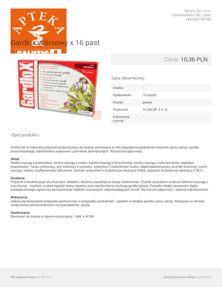 Salutis Sp. z o.o. Trześniowska 59i, Lublin +48 605780782 Gardlox wiśniowy x 16 past Cena: 10,36 PLN Opis słownikowy Dawka - Opakowanie 16 pastyl. Postać pastyl. Producent S-LAB SP. Z O. O. Substancja czynna - Opis produktu GARDLOX to naturalny preparat przeznaczony do ssania, stosowany w celu łagodzenia podrażnień śluzówki jamy ustnej i gardła, przeciwdziałając szkodliwemu wpływowi czynników zewnętrznych. Wzmacnia odporność. Skład: Wodny wyciąg z prawoślazu, wodny wyciąg z szałwi, ksylitol (wyciąg z kory brzozy), wodny wyciąg z ziela tymianku, regulator kwasowości - kwas cytrynowy, sok wiśniowy w proszku, witamina C (askorbinian sodu), olejek eukaliptusowy, aromat wiśniowy, suchy wyciąg z aloesu, bioflawonoidy cytrusowe, izomalt, acesulfam k (substancja słodząca E950), aspartan (substancja słodząca E 951). Działanie: Preparat charakteryzuje się złożonym składem, któremu zawdzięcza swoje właściwości. Przede wszystkim zwalcza bakterie (wyciąg z kory brzozy - ksylitol), a także łagodzi stany zapalne oraz nawilża błonę śluzową gardła (aloes). Ponadto dzięki zawartości olejku eukaliptusowego ogranicza sensytywność włókien czuciowych odpowiadających za ból. Wzmacnia odporność i ułatwia odkrztuszanie. Wskazania: Zaleca się stosowanie preparatu pomocniczo w przypadku podrażnień i zapaleń w obrębie gardła i jamy ustnej. Wskazany w okresie zwiększonej zachorowalności na przeziębienia i grypę. Dawkowanie: Stosować do ssania w dawce wynoszącej 1 tabl. x 4/24h. Plik wygenerowano: 02-03-2017 Powered by TCPDF (www.tcpdf.org) Oprogramowanie sklepu: AptusShop