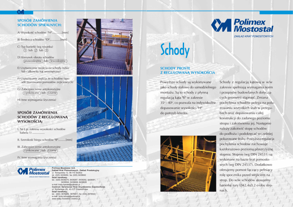 SPOSÓB ZAMÓWIENIA SCHODÓW SPIRALNYCH: A) Wysokoæ schodów "H"............[mm] B) rednica schodów "D".............[mm] C) Typ barierki (wg rysunku) 1 lub 2 lub 3 D) Kierunek obrotu schodów prawoskrêtne lub lewoskrêtne E) Usytuowanie wejcia na schody (szkic lub ca³kowity k¹t wewnêtrzny) SCHODY PROSTE Z REGULOWAN¥ WYSOKOCIA F) Usytuowanie zejcia ze schodów (sposób mocowania pomostów zejciowych) Powy¿sze schody s¹ wykonywane Schody z regulacj¹ k¹tow¹ w w/w G) Zabezpieczenie antykorozyjne cynkowane lub czarne jako schody stalowe do samodzielnego monta¿u. S¹ to schody z p³ynn¹ zakresie spe³niaj¹ wymagania norm H) Inne wymagania (¿yczenia) SPOSÓB ZAMÓWIENIA SCHODÓW Z REGULOWAN¥ WYSOKOCI¥: I. Nr L.p. zakresu wysokoci schodów (tabela 1) ............... II. Szerokoæ biegu schodów "B".........[mm] III. Zabezpieczenie antykorozyjne cynkowane lub czarne IV. Inne wymagania (¿yczenia) Polimex-Mostostal S.A. Zak³ad Krat Pomostowych, Zak³ad Produkcyjny ul. Terespolska 12, 08-110 Siedlce tel. (025) 6439264, fax (025) 6439642 Dzia³ handlowy: tel.: (025) 6439274, 6439287, 6439292, 6439351, 6439544, 6439608, 6439628 e-mail: [email protected] Centrum Serwisowe Krat Ocynkownia Czêstochowa ul. Korfantego 29, 42-217 Czêstochowa Dzia³ handlowy: tel.: (034) 3676020, 3676021, fax (034) 3676022 e-mail: [email protected] www.kraty.mostostal.siedlce.pl regulacj¹ k¹ta "ß" w zakresie 35o - 40o, co pozwala na indywidualne dopasowanie wysokoci "H" do potrzeb klienta. i przepisów budowlanych dotycz¹cych geometrii st¹pniêæ. Zmiana pochylenia schodów polega na poluzowaniu wszystkich rub w przegubach oraz dopasowaniu ca³ej konstrukcji do zadanego poziomu stropu i zakotwieniu jej. Nastêpnie nale¿y zakotwiæ stopê schodów do pod³o¿a i podokrêcaæ wczeniej poluzowane ruby. Powy¿sza regulacja pochylenia schodów zachowuje ka¿dorazowo poziom¹ p³aszczyznê stopnia. Stopnie (wg DIN 24531) s¹ wykonane na bazie krat pomostowych (wg DIN 24537). Dodatkowo oferujemy pomost ³¹cz¹cy pe³ni¹cy rolê spocznika przed wejciem na strop. Do w/w schodów stosujemy barierkê rury Ø42.4x3.2 o obu stronach. Podstawow¹ zalet¹ schodów z regulowan¹ wysokoci¹ jest uniwersalna i lekka konstrukcja oraz prosty monta¿ i mo¿liwoæ dopasowania do istniej¹cych warunków. Zakresy regulacji wysokoci schodów "H" w zale¿noci od iloci stopni i k¹ta "ß" podaje tabela 1. Typowo wykonujemy w/w schody w nastêpuj¹cych szerokociach biegów: "B"[mm]= 800, 1000, 1200 Schody te maj¹ zastosowanie jako schody wejciowe: do piwnic, na strych, w magazynach, wejcia do kana³ów samochodowych i wiele innych zastosowañ zale¿nych od potrzeb klienta. Schody spiralne (z barierk¹ typ 1) Stopieñ schodowy Stopieñ jest wype³niony krat¹ pomostow¹ (wg DIN 24537). Zakotwienie rury nonej Barierka typ 3 Porêcz+s³upki - ruraØ42.4x3.2 Elementy pionowe - ruraØ16x1.5 Rura porednia - ruraØ26.9x2.6 SCHODY SPIRALNE Schody spiralne s¹ wykonywane jako schody stalowe z mo¿liwoci¹ samodzielnego monta¿u. Produkowane przez nasz¹ firmê schody spiralne spe³niaj¹ przepisy: Schody spiralne wykonujemy wg w³asnych obliczeñ statycznych oraz w³asnego projektu ka¿dorazowo dostosowanego od potrzeb klienta. 1) "Rozporz¹dzenia Ministra Gospodarki Przestrzennej i Budownictwa" z dnia 14.12.1994r. 2) "Wejcia i dojcia - wymagania" PN-80/M-49060 Projektujemy zarówno schody zewnêtrzne jak i wewnêtrzne z uwzglêdnieniem odmiennych warunków obci¹¿enia. Aby zachowaæ wszystkie wymagania w/w przepisów musimy przestrzegaæ nastêpuj¹cych wytycznych: a) rednica zewn. schodów D = od 2000 [mm] b) Wysokoæ st¹pniêcia schodów h = od 175 do 200 [mm] c) Iloæ stopni schodowych na pe³en obrót (360o) n = od 16 do 19 (w zale¿noci od rednicy "D") d) Schody musz¹ mieæ mo¿liwoæ podarcia rury nonej (na wysokoci) min. co 3 - 8 mb. Pomost zejciowy Pomost jest wype³niony krat¹ pomostow¹ (wg DIN 24537) Barierka typ 2 Porêcz+s³upki - ruraØ42.4x3.2 Rury porednie - ruraØ26.9x2.6 Wykonujemy tak¿e schody wg wytycznych klienta po dostarczeniu za³o¿eñ projektowych lub gotowego projektu. Schody spiralne maj¹ zastosowanie jako schody wejciowe na pomosty zbiorników i inne pomosty w halach przemys³owych, jako klatki ewakuacyjne, jako wejcia na strych lub do piwnicy oraz inne zastosowania wg potrzeb klienta. Zaletami naszych schodów spiralnych s¹: ma³a przestrzeñ zabudowy w stosunku do schodów prostych, prosty monta¿, mo¿liwoæ dopasowania k¹towego do istniej¹cego elementów (obrót wszystkich stopni na s³upie nonym), ma³y ciê¿ar w stosunku do wysokoci, niska cena w stosunku do schodów tradycyjnych. Barierka typ 1 Porêcz+s³upki - ruraØ42.4x3.2 Rura porednia - ruraØ26.9x2.6