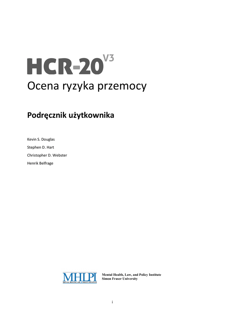 Ocena ryzyka przemocy Podręcznik użytkownika Kevin S. Douglas Stephen D. Hart Christopher D. Webster Henrik Belfrage Mental Health, Law, and Policy Institute Simon Fraser University i Mental Health, Law, and Policy Institute Simon Fraser University © 2013 by the Mental Health, Law, and Policy Institute, Simon Fraser University Kevin S. Douglas, Stephen D. Hart, Christopher D. Webster i Henrik Belfrage zastrzegają sobie prawa autorskie do niniejszej publikacji. Wszelkie prawa zastrzeżone. Żadna część niniejszej publikacji nie może być powielana, przechowywana w żadnym systemie, przekazywana w żadnej postaci ani za pomocą żadnych nośników elektronicznych, mechanicznych, fotokopii, nagrań, ani w żaden inny sposób bez uprzedniej zgody wydawcy. W celu uzyskania informacji dotyczących zgody na wykorzystanie materiałów z niniejszej publikacji lub innych informacji dotyczących niniejszej publikacji lub publikacji powiązanych, prosimy o kontakt z The Mental Health, Law, and Policy Institute: [email protected] lub ProActive ReSolutions: Telefon: +1 604 482-1750 or +1 877 585-9933 Faks: +1 604 669-0145 E-mail: [email protected] Strona internetowa: http://www.proactive-resolutions.com UWAGA Niniejsza publikacja została stworzona w celu przedstawienia dokładnych i wiarygodnych informacji oraz opinii i zaleceń autorów odnośnie do materii, której ona dotyczy. Podczas opracowywania niniejszej publikacji autorzy i wydawca dołożyli należytych starań, ale nie udzielają żadnych wyraźnych ani pośrednich gwarancji odnośnie do ewentualnych błędów i braków. Autorzy i wydawca nie świadczą żadnych usług specjalistycznych związanych ze sprzedażą publikacji. Czytelnicy, którzy zamierzają odwołać się do tej publikacji w trakcie podejmowania decyzji lub określonych działań, powinni najpierw skonsultować się z niezależnymi źródłami w celu weryfikacji, aktualizacji lub potwierdzenia treści zawartych w niniejszej publikacji. Autorzy i wydawca nie ponoszą odpowiedzialności za żadne szkody wynikające z odwołania się czytelnika do fragmentu lub całości tej publikacji. HCR-20v3: ocena ryzyka przemocy: podręcznik użytkownika / Kevin S. Douglas, Stephen D. Hart, Christopher D. Webster, Henrik Belfrage. ISBN kanadyjski: 978-0-86491-344-9 (pbk.) ISBN tłumaczenia polskiego: 978-83-946411-0-8 1. Przemoc—Prognozowanie. 2. Ocena ryzyka. 3. Psychiatria sądowa. I. Douglas, Kevin S. (Kevin Stewart), 1970-, autor II. Hart, Stephen D. (Stephen David), 1962-, autor III. Webster, Christopher D. (Christopher David), 1936-, autor IV. Belfrage, Henrik (Nils Henrik Johannes), 1955-, autor V. Simon Fraser University. Mental Health, Law, and Policy Institute VI. Tytuł. iii Polskie tłumaczenie: Michał Nowopolski, Agnieszka Welento-Nowacka, Leszek Ciszewski, Elmira Kozicka, Janusz Masłowski, Tomasz Wieczorek, Agata Wrzesińska Tłumaczenie zwrotne: Andrzej Axer Korekta językowa: Łukasz Plenikowski Instytucje wspierające proces implementacji HCR-20V3: Szpital dla Nerwowo i Psychicznie Chorych w Starogardzie Gdańskim Regionalny Ośrodek Psychiatrii Sądowej Starogard Gdański Prawa autorskie do polskiego tłumaczenia, wydawca: Michał Nowopolski ul. Chwaszczyńska 11/10, 80-871 Gdańsk e-mail: [email protected] tel: (+48) 606 452 939 strona internetowa: www.ryzykoprzemocy.pl iv Spis treści O autorach.............................................................................................................................. ix O okładce ................................................................................................................................ x Wprowadzenie ....................................................................................................................... xi Przedmowa tłumaczy ............................................................................................................ xiv Przedmowa do wydania polskiego ………………………………………………………………………………………….xvi Rozdział 1. Historia i powstanie HCR-20 .................................................................................... 1 WSTĘP.......................................................................................................................................... 1 CZĘŚĆ 1: KLUCZOWE POJĘCIA ..................................................................................................... 2 Przemoc ................................................................................................................................ 3 Ryzyko ................................................................................................................................... 4 Ocena .................................................................................................................................... 5 Zarządzanie ........................................................................................................................... 5 Oparcie na dowodach ........................................................................................................... 6 Podsumowanie ..................................................................................................................... 7 CZĘŚĆ 2: SPOSOBY PODEJMOWANIA DECYZJI ............................................................................ 8 Procedury dyskrecjonalne (uznaniowe)................................................................................ 9 Procedury niedyskrecjonalne (nieuznaniowe).................................................................... 10 Ewolucja oceny ryzyka przemocy ....................................................................................... 11 C: ROZWÓJ HCR-20 .................................................................................................................... 14 HCR-20V1 ...............................................................................