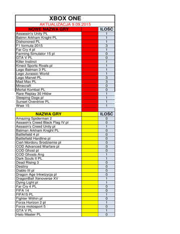XBOX ONE AKTUALIZACJA 9.09.2015 NOWE NAZWA GRY Assassin's Unity PL Batmn Arkham Knight PL Dishonored PL F1 formuła 2015 Far Cry 4 pl Farming Simulator 15 pl GTA V PL Killer Instinct Kinect Sports Rivals pl Lego Batman 3 PL Lego Jurassic World Lego Marvel PL Mad Max PL Minecraft Mortal Kombat PL Rare Replay 30 Hitów Sleeping Dogs pl Sunset Overdrive PL Wwe 15 NAZWA GRY Amazing Spiderman 2 Assasin's Creed Black Flag IV pl Assasin's Creed Unity pl Batman Arkham Knight PL Battlefield 4 pl Battlefield Hardline pl Cień Mordoru Środziemie pl COD Advanced Warfare pl COD Ghost pl COD Ghosts Ang Dark Souls II PL Dead Rising 3 Destiny Diablo III pl Dragon Age Inkwizycja pl DragonBall Xenoverse XV Dying Light pl Far Cry 4 PL FIFA 14 FIFA15 PL Fighter Within pl Forza Horizon 2 pl Forza motosport 5 GTA V PL Halo Master PL ILOŚĆ 1 1 1 3 1 0 0 1 1 1 1 3 3 0 0 1 1 1 1 ILOŚĆ 0 0 1 0 0 0 0 0 0 1 1 0 0 0 0 1 1 0 0 1 0 1 0 1 0 Kinect Just Dance 2014 Kinect Just Dance 2015 Kinect Sports Rivals pl Lego Batman 3 PL Lego Hobbit PL Lego Marvel Lego Movie PL Lord of the Fallen pl Metro Redux pl MINECRAFT Mortal Kombat X PL Murdered soul suspect pl NBA 2k14 NBA 2k15 NFS Rivals NHL 15 Obcy Izolacja pl Pay Day 2 PES 15 Project Cars PL Putty Squad Rayman Legends PL Resident Revelation 2 PL Ryse Son of Rome Saints Row pl Shadow Warrior pl Sherlock Holmes Crimes & Punishment Sleeping Dogs PL Sniper Elite III Afrika pl Sunset Overdrive PL The Crew pl The Evil Within Thief pl Tomb Raider pl Transformers Trial Fusion UFC Watch Dogs pl Wiedźmin 3 Dziki Gon PL Wolfenstein new order pl Worms Battleground WWE 2k15 Zombie Army pl 0 0 0 1 0 0 1 1 1 1 0 0 0 0 0 0 0 0 1 1 0 0 1 2 0 0 0 0 0 0 1 0 0 0 0 0 2 0 1 0 0 1 0