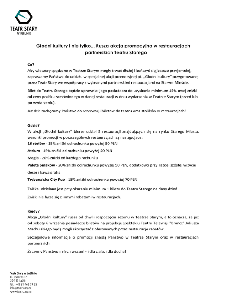 Głodni kultury i nie tylko... Rusza akcja promocyjna w restauracjach partnerskich Teatru Starego Co? Aby wieczory spędzane w Teatrze Starym mogły trwać dłużej i kończyć się jeszcze przyjemniej, zapraszamy Państwa do udziału w specjalnej akcji promocyjnej pt. „Głodni kultury” przygotowanej przez Teatr Stary we współpracy z wybranymi partnerskimi restauracjami na Starym Mieście. Bilet do Teatru Starego będzie uprawniał jego posiadacza do uzyskania minimum 15%-owej zniżki od ceny posiłku zamówionego w danej restauracji w dniu wydarzenia w Teatrze Starym (przed lub po wydarzeniu). Już dziś zachęcamy Państwa do rezerwacji biletów do teatru oraz stolików w restauracjach! Gdzie? W akcji „Głodni kultury” bierze udział 5 restauracji znajdujących się na rynku Starego Miasta, warunki promocji w poszczególnych restauracjach są następujące: 16 stołów - 15% zniżki od rachunku powyżej 50 PLN Atrium - 15% zniżki od rachunku powyżej 50 PLN Magia - 20% zniżki od każdego rachunku Paleta Smaków - 20% zniżki od rachunku powyżej 50 PLN, dodatkowo przy każdej szóstej wizycie deser i kawa gratis Trybunalska City Pub - 15% zniżki od rachunku powyżej 70 PLN Zniżka udzielana jest przy okazaniu minimum 1 biletu do Teatru Starego na dany dzień. Zniżki nie łączą się z innymi rabatami w restauracjach. Kiedy? Akcja „Głodni kultury” rusza od chwili rozpoczęcia sezonu w Teatrze Starym, a to oznacza, że już od soboty 6 września posiadacze biletów na projekcję spektaklu Teatru Telewizji "Brancz" Juliusza Machulskiego będą mogli skorzystać z oferowanych przez restauracje rabatów. Szczegółowe informacje o promocji znajdą Państwo w Teatrze Starym oraz w restauracjach partnerskich. Życzymy Państwu miłych wrażeń - i dla ciała, i dla ducha!