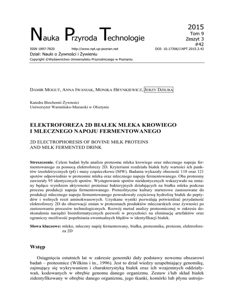 N auka ISSN 1897-7820 P rzyroda T 2015 echnologie http://www.npt.up-poznan.net Tom 9 Zeszyt 3 #42 DOI: 10.17306/J.NPT.2015.3.42 Dział: Nauki o Żywności i Żywieniu Copyright ©Wydawnictwo Uniwersytetu Przyrodniczego w Poznaniu DAMIR MOGUT, ANNA IWANIAK, MONIKA HRYNKIEWICZ, JERZY DZIUBA Katedra Biochemii Żywności Uniwersytet Warmińsko-Mazurski w Olsztynie ELEKTROFOREZA 2D BIAŁEK MLEKA KROWIEGO I MLECZNEGO NAPOJU FERMENTOWANEGO 2D ELECTROPHORESIS OF BOVINE MILK PROTEINS AND MILK FERMENTED DRINK Streszczenie. Celem badań była analiza proteomu mleka krowiego oraz mlecznego napoju fermentowanego za pomocą elektroforezy 2D. Kryteriami rozdziału białek były wartości ich punktów izoelektrycznych (pI) i masy cząsteczkowe (MW). Badania wykazały obecność 118 oraz 121 spotów odpowiednio w proteomie mleka oraz mlecznego napoju fermentowanego. Oba proteomy zawierały 95 identycznych spotów. Występowanie spotów nieidentycznych wskazywało na zmiany będące wynikiem aktywności proteinaz bakteryjnych działających na białka mleka podczas procesu produkcji napoju fermentowanego. Proteolityczne kultury starterowe zastosowane do produkcji mlecznego napoju fermentowanego powodowały częściową hydrolizę białek do peptydów i wolnych reszt aminokwasowych. Uzyskane wyniki pozwalają potwierdzać przydatność elektroforezy 2D do obserwacji zmian w proteomach produktów mleczarskich oraz żywności po zastosowaniu procesów technologicznych. Rozwój metod analizy proteomicznej w zakresie doskonalenia narzędzi bioinformatycznych pozwoli w przyszłości na eliminację artefaktów oraz ograniczy możliwość popełniania ewentualnych błędów w identyfikacji białek. Słowa kluczowe: mleko, mleczny napój fermentowany, białka, proteomika, proteom, elektroforeza 2D Wstęp Osiągnięcia ostatnich lat w zakresie genomiki dały podstawy nowemu obszarowi badań – proteomice (Wilkins i in., 1996). Jest to dział wiedzy uzupełniający genomikę, zajmujący się wykrywaniem i charakterystyką białek oraz ich wzajemnych oddziaływań, kodowanych w obrębie genomu danego organizmu. Zestaw i/lub skład białek zidentyfikowany w obrębie danego organizmu, jego tkanki, komórki lub płynu ustrojo- 2 Mogut, D., Iwaniak, A., Hrynkiewicz, M., Dziuba, J. (2015). Elektroforeza 2D białek mleka krowiego i mlecznego napoju fermentowanego. Nauka Przyr. Technol., 9, 3, #42. DOI: 10.17306/J.NPT.2015.3.42 wego jest określany mianem proteomu (Lewandowicz i in., 2009). Według Lewandowicza i in. (2009) analiza proteomiczna znajduje zastosowanie w diagnostyce medycznej, ale wykorzystanie narzędzi proteomicznych nie byłoby w pełni możliwe, gdyby nie ciągły rozwój bioinformatyki – nauki pozwalającej na analizę dużej ilości danych o skomplikowanej strukturze. Poza medycyną po analizę proteomiczną coraz częściej sięgają naukowcy zajmujący się m.in. badaniem żywności (Bouwman i in., 2011). Do powszechnie stosowanych metod analizy proteomu należy elektroforeza dwuwymiarowa (elektroforeza 2D). Metoda ta pozwala na rozdział nawet do kilkunastu tysięcy białek jednocześnie. Ponadto elektroforeza 2D umożliwia wykrywanie białek w szerokim zakresie stężeń oraz pozwala na śledzenie między nimi różnic w obrębie badanych proteomów (Kossowska i in., 2009). Mleko to pierwszy i podstawowy pokarm ludzi oraz zwierząt. Jest ono bogatym źródłem m.in. łatwo przyswajalnego białka, na które składa się kazeina, białka serwatkowe (α-laktoalbumina, β-laktoglobulina, immunoglobuliny) oraz inne niskocząsteczkowe białka i enzymy (Szwajkowska i in., 2011). Białka mleka są źródłem peptydów o różnych aktywnościach biologicznych (Nagpal i in., 2011). Proces otrzymywania mlecznych napojów fermentowanych przyczynia się do zmian właściwości mleka. Są to m.in.: częściowy rozkład laktozy, a także: uwolnienie kwasów tłuszczowych, wzrost przyswajalności wapnia i innych pierwiastków oraz zwiększenie strawności białka poprzez wzrost liczby wolnych reszt aminokwasowych (Mojka, 2013). Procesy technologiczne stosowane w produkcji produktów mleczarskich mogą wywierać wpływ na zawarte w nich białka. Wynika to z obecności w systemach proteolitycznych kultur bakteryjnych różnego rodzaju proteinaz stosowanych w procesach otrzymywania mlecznych napojów fermentowanych. W wyniku działania zewnątrzkomórkowych proteinaz oraz wewnątrzkomórkowych peptydaz zachodzą m.in. hydrolityczne przemiany białek (Hayes i in., 2007). Postawiono zatem hipotezę o wpływie wymienionych przemian białek mleka na obraz mapy proteomicznej mlecznych napojów fermentowanych. W związku z tym podjęto pracę, której celem była analiza proteomiczna mleka oraz mlecznego napoju fermentowanego za pomocą elektroforezy dwuwymiarowej oraz ustalenie, czy zastosowane warunki produkcji mlecznego napoju fermentowanego przyczyniały się do zmian w obrazie obu proteomów. Materiał i metody Mleko i mleczny napój fermentowany Świeże mleko pobrano od indywidualnego dostawcy z rejonu Olsztyna, a następnie odtłuszczono poprzez odwirowanie z prędkością 3000·g w czasie 15 min. Z odtłuszczonego mleka pochodzącego z tej samej partii wyprodukowano mleczny napój fermentowany według metody Paszczyk i in. (2014) z następującymi modyfikacjami własnymi: 1) do produkcji napoju fermentowanego zastosowano szczepionkę YO-MIX firmy Danisco zawierającą kultury bakterii fermentacji mlekowej Streptococcus thermophilus oraz Lactobacillus delbrueckii subsp. bulgaricus; 2) nie dodawano proszku mlecznego. Mleko oraz napój fermentowany przeznaczony do analizy proteomicznej poddawano homogenizacji ciśnieniowej (mleko: homogenizacja dwustopniowa, 18/5 MPa, napój 3 Mogut, D., Iwaniak, A., Hrynkiewicz, M., Dziuba, J. (2015). Elektroforeza 2D białek mleka krowiego i mlecznego napoju fermentowanego. Nauka Przyr. Technol., 9, 3, #42. DOI: 10.17306/J.NPT.2015.3.42 fermentowany: 70 MPa) (Paszczyk i in., 2014;