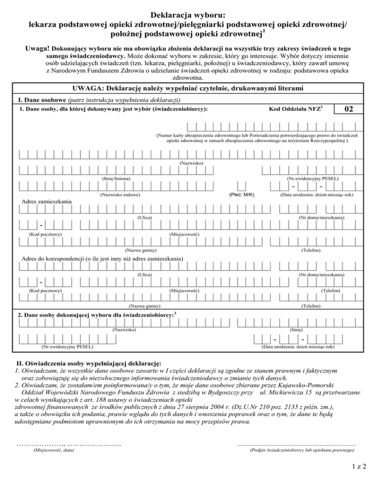 Deklaracja wyboru: lekarza podstawowej opieki zdrowotnej/pielęgniarki podstawowej opieki zdrowotnej/ położnej podstawowej opieki zdrowotnej1 Uwaga! Dokonujący wyboru nie ma obowiązku złożenia deklaracji na wszystkie trzy zakresy świadczeń u tego samego świadczeniodawcy. Może dokonać wyboru w zakresie, który go interesuje. Wybór dotyczy imiennie osób udzielających świadczeń (tzn. lekarza, pielęgniarki, położnej) u świadczeniodawcy, który zawarł umowę z Narodowym Funduszem Zdrowia o udzielanie świadczeń opieki zdrowotnej w rodzaju: podstawowa opieka zdrowotna. UWAGA: Deklarację należy wypełniać czytelnie, drukowanymi literami I. Dane osobowe (patrz instrukcja wypełnienia deklaracji) Kod Oddziału NFZ2 1. Dane osoby, dla której dokonywany jest wybór (świadczeniobiorcy): 02 (Numer karty ubezpieczenia zdrowotnego lub Poświadczenia potwierdzającego prawo do świadczeń opieki zdrowotnej w ramach ubezpieczenia zdrowotnego na terytorium Rzeczypospolitej ) (Nazwisko) (Imię/Imiona) (Nr ewidencyjny PESEL) - - (Data urodzenia: dzień-miesiąc-rok) (Płeć: M/K) (Nazwisko rodowe) Adres zamieszkania (Ulica) (Nr domu/mieszkania) (Miejscowość) (Kod pocztowy) (Nazwa gminy) (Telefon) Adres do korespondencji (o ile jest inny niż adres zamieszkania) (Ulica) (Nr domu/mieszkania) (Miejscowość) (Kod pocztowy) (Telefon) (Nazwa gminy) 2. Dane osoby dokonującej wyboru dla świadczeniobiorcy: (Telefon) 3 (Imię) (Nazwisko) (Nr ewidencyjny PESEL) - (Data urodzenia: dzień-miesiąc-rok) II. Oświadczenia osoby wypełniającej deklarację: 1. Oświadczam, że wszystkie dane osobowe zawarte w I części deklaracji są zgodne ze stanem prawnym i faktycznym oraz zobowiązuję się do niezwłocznego informowania świadczeniodawcy o zmianie tych danych. 2. Oświadczam, że zostałam/em poinformowana/y o tym, że moje dane osobowe zbierane przez Kujawsko-Pomorski Oddział Wojewódzki Narodowego Funduszu Zdrowia z siedzibą w Bydgoszczy przy ul. Mickiewicza 15 są przetwarzane w celach wynikających z art. 188 ustawy o świadczeniach opieki zdrowotnej finansowanych ze środków publicznych z dnia 27 sierpnia 2004 r. (Dz.U.Nr 210 poz. 2135 z późn. zm.), a także o obowiązku ich podania, prawie wglądu do tych danych i wnoszenia poprawek oraz o tym, że dane te będą udostępniane podmiotom uprawnionym do ich otrzymania na mocy przepisów prawa. ………………., ……………………… (Miejscowość, data) ..................................................................... (Podpis świadczeniobiorcy lub opiekuna prawnego) 1z2 III. Deklaracja wyboru LEKARZA PODSTAWOWEJ OPIEKI ZDROWOTNEJ 4 1. Na podstawie art. 28 ust.1 ustawy o świadczeniach opieki zdrowotnej finansowanych ze środków publicznych z dnia 27 sierpnia 2004 r. (Dz. U. Nr 210, poz. 2135 z późn. zm.), deklaruję wybór: (imię i nazwisko lekarza podstawowej opieki zdrowotnej) 2. W bieżącym roku dokonuję wyboru: 5 3. Deklarację składam w: - 5 po raz pierwszy po raz drugi po raz kolejny Żołnierz Służby Zasadniczej - poborowy (POO ) miejscu pełnienia służby 6 - (Data: dzień-miesiąc-rok) (Podpis świadczeniobiorcy lub opiekuna prawnego) (Pieczątka świadczeniodawcy z sygnaturą umowy z NFZ) (Podpis osoby przyjmującej deklarację) (Pieczątka firmowa świadczeniodawcy - miejsca udzielania świadczeń) 4 IV. Deklaracja wyboru PIELĘGNIARKI PODSTAWOWEJ OPIEKI ZDROWOTNEJ 1. Na podstawie art. 28 ust.1 ustawy o świadczeniach opieki zdrowotnej finansowanych ze środków publicznych z dnia 27 sierpnia 2004 r. (Dz. U. Nr 210, poz. 2135 z późn. zm.), deklaruję wybór: (imię i nazwisko pielęgniarki podstawowej opieki zdrowotnej) 2. W bieżącym roku dokonuję wyboru: 3. Deklarację składam w: - 5 5 po raz pierwszy po raz drugi po raz kolejny Żołnierz Służby Zasadniczej - poborowy (POO ) miejscu pełnienia służby 6 (Podpis świadczeniobiorcy lub opiekuna prawnego) (Data: dzień-miesiąc-rok) (Pieczątka świadczeniodawcy z sygnaturą umowy z NFZ) (Podpis osoby przyjmującej deklarację) (Pieczątka firmowa świadczeniodawcy - miejsca udzielania świadczeń) 4 V. Deklaracja wyboru POŁOŻNEJ PODSTAWOWEJ OPIEKI ZDROWOTNEJ 1. Na podstawie art. 28 ust.1 ustawy o świadczeniach opieki zdrowotnej finansowanych ze środków publicznych z dnia 27 sierpnia 2004 r. (Dz. U. Nr 210, poz. 2135 z późn. zm.), deklaruję wybór: (proszę wpisać nazwisko i imię położnej podstawowej opieki zdrowotnej) 2. W bieżącym roku dokonuję wyboru: - 5 po raz pierwszy po raz drugi po raz kolejny - (Data: dzień-miesiąc-rok) (Podpis świadczeniobiorcy lub opiekuna prawnego) (Pieczątka świadczeniodawcy z sygnaturą umowy z NFZ) (Podpis osoby przyjmującej deklarację) (Pieczątka firmowa świadczeniodawcy - miejsca udzielania świadczeń) Objaśnienia: 1 niepotrzebne skreślić 2 określając kod OW NFZ - należy podać kod Oddziału właściwego ze względu na siedzibę świadczeniodawcy 3 wypełnić w przypadku gdy dane osobowe wyszczególnione w CZĘŚCI I.1 są inne niż dane wymagane w CZĘŚCI I.2 4 wypełnić w przypadku dokonania wyboru. 5 właściwe zakreślić znakiem ,,X" 6 Powszechny Obowiązek Obrony 2z2