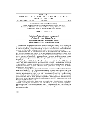 ANNALES UNIVERSITATIS MARIAE CURIE-SKŁODOWSKA LUBLIN - POLONIA VOL.LIX, SUPPL. XIV, 116 SECTIO D 2004 Katedra Dietetyki i Żywności Funkcjonalnej, Wydział Nauk o Żywieniu Człowieka i Konsumpcji, SGGW Warszawa Department of Dietetics and Functional Foods, Faculty of Human Nutrition and Consumer Sciences, Agricultural University Warsaw DANUTA GAJEWSKA Nutritional education as a component of chronic renal failure therapy Edukacja żywieniowa jako element terapii w leczeniu przewlekłej niewydolności nerek Rozpoznanie przewlekłego schorzenia wymaga stosowania nowych leków, zmiany dotychczasowego sposobu żywienia, wprowadzenia pewnych ograniczeń i większej dbałości w doborze produktów i potraw. Dieta, obok leczenia farmakologicznego przewlekłej niewydolności nerek (pnn), jest jedną z głównych składowych procesu terapeutycznego. Dietoterapia w pnn, w odróżnieniu od diety w innych przewlekłych schorzeniach, nie jest „jednokierunkowa”, ale zmienia się w zależności od stopnia wydolności nerek. Zapotrzebowanie energetyczne pacjenta przez cały okres trwania choroby pozostaje takie samo (30-35 kcal/kg n.m.c.) ale wraz z pogorszeniem się wydolności nerek i obniżeniem wielkości współczynnika przesączania kłębuszkowego (GFR) zmienia się zapotrzebowanie na białko (1,5). Przy łagodnym (60-80 ml/min/1,73 m2) i umiarkowanym (30-59 ml/min/1,73 m2) obniżeniu GFR, charakteryzującym się przede wszystkim azotemią i gromadzeniem się końcowych produktów przemian azotu we krwi, obserwuje się podwyższenie stężenia kreatyniny i azotu mocznikowego we krwi. Zaleca się zatem ograniczenie podaży białka do 0,7-0,8 g/kg należnej masy ciała (5,7). W miarę progresji choroby, przy krańcowo niskiej wydolności nerek i ciężkim obniżeniu GFR (15-29 ml/min/1,73 m2), obserwuje się narastanie azotemii, niedokrwistość oraz zaburzenia czynności niektórych układów w organizmie. Dietoterapia pacjentów w tym stadium choroby polega na podaży takiej samej ilości energii i ograniczonej do 0,6 g/kg należnej masy ciała ilości białka (1,5). Badania prowadzone w latach 80-tych i 90-tych na modelach doświadczalnych, jak też próby kliniczne potwierdzają skuteczność diety niskobiałkowej w hamowaniu progresji pnn, prowadząc do wydłużenia nawet o 40 % czasu do rozwoju schyłkowej niewydolności nerek (3,8). Istnieje wiele doniesień o skuteczności stosowania diety ubogobiałkowej zawierającej dodatek ketoanalogów aminokwasów tzw. ketodiety (3,8). Zalety ketodiety wynikają z łącznego działania zmniejszonego ładunku białek i ich katabolitów oraz modyfikacji szlaków metabolicznych aminokwasów, co objawia się przede wszystkim zahamowaniem tworzenia mocznika (3). 118 Przestrzeganie reżimu dietetycznego, nawet wtedy, gdy występują nudności, wymioty, pacjent nie ma apetytu lub cierpi na depresję, jest nieodzownym elementem terapii pnn, opóźniającym wejście w dializy. Dieta o ograniczonej podaży białka wymaga wprowadzenia do jadłospisów produktów niskobiałkowych, które z jednej strony mają odmienny smak i konsystencję od produktów standardowych, trudne do zaakceptowania przez osoby chore, a z drugiej strony są droższe i trudno dostępne. Odpowiednia motywacja pacjenta, podkreślenie wszystkich pozytywnych stron przestrzegania diety, mimo, że często jest ona trudna do zaakceptowania, może niejednokrotnie znacznie przyczynić się do poprawy jakości życia osób przewlekle chorych (1). Największym wyzwaniem dla dietetyka jest przekonanie pacjentów o konieczności ograniczenia spożycia pieczywa o standardowej zawartości białka i zastąpienie go pieczywem niskobiałkowym, które ze względu na swe walory sensoryczne jest trudne do zaakceptowania. Jeśli progresji schorzenia nie można spowolnić i GFR obniża się poniżej 15 ml/min/1,73 m2, aby zapobiec groźnym dla życia powikłaniom, konieczne jest z reguły rozpoczęcie terapii nerkozastępczej (dializy otrzewnowej, hemodializy lub przeszczepu nerek). Na całym świecie, także i w Polsce, obserwuje się wzrost liczby pacjentów wymagających leczenia nerkozastępczego. Szczególnie szybko wzrasta liczba chorych z nefropatią cukrzycową oraz pacjentów w podeszłym wieku (6). W roku 2001 liczba chorych dializowanych przekroczyła 10 000, a koszt hemodializoterapii wynosił 600 milionów złotych (4). Ze względu na straty białka (i aminokwasów) w trakcie często powtarzanych zabiegów dializ, zmiany w profilu aminokwasów w osoczu oraz ujawniające się niedobory białkowe, w dietoterapii pacjentów z pnn zaleca się dietę bogato białkową, zawierającą 1,2 –1,3 g białka/kg należnej masy ciała (2,5). Znów zmienia się asortyment dozwolonych produktów i potraw oraz skład racji pokarmowej, podczas gdy zapotrzebowanie energetyczne pacjenta przez cały okres rozwoju pnn pozostaje na poziomie 30-35 kcal/kg m.c. Dodatkowo ścisłej kontroli podlega spożycie fosforu, potasu i sodu. Wzrost podaży białka i ograniczenie fosforu w diecie, przy jednoczesnym pokryciu zapotrzebowania na energię i pozostałe składniki odżywcze, wymaga od pacjenta pewnej znajomości zasad żywienia, komponowania posiłków oraz składu wartości odżywczej produktów spożywczych. Wiedza taka powinna być przekazana przez wykwalifikowany personel, najlepiej dietetyka o specjalności nefrologicznej. Poprzez edukację żywieniową pacjentów i odpowiednio zbilansowaną, dostosowaną do indywidualnych potrzeb dietę można zapobiec lub też minimalizować groźne powikłania w pnn. Konsultacje dietetyczne prowadzone przez wykwalifikowany personel, dotyczące doboru produktów i stosowania technik kulinarnych, są niezbędne, zwłaszcza dla pacjentów, u których występują zaburzenia łaknienia i percepcji smaku. Szczególnej troski wymagają pacjenci po transplantacji nerek, którym zaleca się dietę wysokobiałkową i większą niż zazwyczaj podaż płynów, aby zrównoważyć katabol