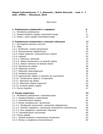Napęd hydrostatyczny. T. 1, Elementy / Stefan Stryczek. – wyd. 4 - 1 dodr. (PWN). – Warszawa, 2016 Spis treści 1. Podstawowe wiadomości o napędach 1.1. Określenia podstawowe 1.2. Zasada działania napędu hydrostatycznego 1.3. Zalety i wady napędu hydrostatycznego 9 9 11 13 2. Podstawowe wiadomości o cieczach roboczych 2.1. Wymagania stawiane cieczom 2.2. Oleje 2.2.1. Ściśliwość i moduł sprężystości 2.2.2. Rozszerzalność objętościowa 2.2.3. Ciepło właściwe i przewodnictwo cieplne 2.2.4. Lepkość 2.2.4.1. Definicja i jednostki 2.2.4.2. Wpływ temperatury na lepkość olejów 2.2.4.3. Wpływ ciśnienia na lepkość olejów 2.2.5. Pienienie się olejów 2.2.6. Własności smarne 2.2.7. Własności deemulgacyjne 2.2.8. Działanie korozyjne 2.2.9. Agresywność olejów w stosunku do uszczelnień 2.2.10. Temperatura zapłonu i krzepnięcia 2.2.11. Starzenie się olejów 2.2.12. Własności olejów krajowych 2.2.13. Kryteria doboru olejów 2.3. Ciecze niepalne 17 17 18 18 22 23 24 24 25 27 28 30 30 30 31 31 32 33 38 41 3. Pompy wyporowe 3.1. Określenia podstawowe i charakterystyki 3.1.1. Zasada działania, systematyka 3.1.2. Charakterystyki idealne 3.1.3. Straty energetyczne i sprawności 3.1.3.1. Wydajność rzeczywista i sprawność objętościowa 3.1.3.2. Moment napędowy i sprawność hydrauliczno-mechaniczna 3.1.3.3. Moc napędowa i sprawność całkowita 3.1.4. Charakterystyki rzeczywiste 3.2. Pompy zębate 3.2.1. Zasada działania i systematyka konstrukcji 3.2.2. Pompy o zazębieniu ewolwentowym 47 47 47 50 52 52 56 59 60 63 63 64 3.2.2.1. Wydajność 3.2.2.2. Współczynnik nierównomierności wydajności 3.2.2.3. Odciążenie przestrzeni zasklepionej 3.2.2.4. Obciążenie łożysk 3.2.2.5. Kompensacja luzów 3.2.3. Pompy o zazębieniu cykloidalnym 3.2.3.1. Zarys i konstrukcja zazębienia 3.2.3.2. Wydajność 3.2.3.3. Współczynnik nierównomierności wydajności 3.2.4. Przykłady konstrukcji pomp zębatych 3.3. Pompy śrubowe 3.3.1. Zasada działania i systematyka 3.3.2. Geometria śrub 3.3.3. Wydajność 3.3.4. Obciążenia śrub 3.3.4.1. Momenty 3.3.4.2. Obciążenia osiowe 3.3.4.3. Obciążenia promieniowe 3.3.5. Przykłady konstrukcji 3.4. Pompy łopatkowe 3.4.1. Zasada działania i systematyka konstrukcji 3.4.2. Wydajność pompy pojedynczego działania 3.4.3. Wydajność pompy podwójnego działania 3.4.4. Współczynnik nierównomierności wydajności 3.4.5. Moment na wałku i obciążenie łożysk pompy 3.4.6. Profilowanie bieżni łopatek 3.4.7. Odciążenie łopatek 3.4.8. Przykłady konstrukcji pomp 3.5. Pompy wielotłoczkowe promieniowe 3.5.1. Zasada działania i systematyka konstrukcji 3.5.2. Kinematyka pompy 3.5.3. Wydajność 3.5.4. Współczynnik nierównomierności wydajności 3.5.5. Obciążenie elementów pompy 3.5.6. Rozrząd czopowy 3.5.7. Przykłady konstrukcji pomp 3.6. Pompy wielotłoczkowe osiowe 3.6.1. Zasada działania i systematyka konstrukcji 3.6.2. Pompy z wychylnym wirnikiem 3.6.2.1. Kinematyka pompy 3.6.2.2. Wydajność 3.6.2.3. Współczynnik nierównomierności wydajności 3.6.2.4. Obciążenia zespołu wirnikowego 3.6.3. Pompy z wychylną tarczą 3.6.3.1. Kinematyka tłoczka i stopki 64 70 73 75 78 93 93 100 104 105 111 111 113 120 126 126 129 131 133 137 137 138 141 142 143 144 146 148 152 152 155 162 167 169 174 179 184 184 187 187 191 192 193 195 195 3.6.3.2. Wydajność i współczynnik jej nierównomierności 3.6.3.3. Obciążenia tłoczka 3.6.3.4. Wymiarowanie stopki 3.6.3.5. Siła sprężyny centralnej 3.6.3.6. Obciążenie wirnika i tarczy oporowej 3.6.4. Rozrząd tarczowy 3.6.5. Przykłady konstrukcji pomp 3.7. Sterowniki pomp nastawnych 199 200 203 206 208 211 220 228 4. Silniki wyporowe 4.1. Zasada działania i systematyka 4.2. Charakterystyki idealne 4.3. Straty i sprawności 4.4. Silniki szybkoobrotowe 4.5. Silniki wolnoobrotowe 4.5.1. Silniki zębate 4.5.2. Silniki tłokowe 232 232 234 235 239 244 244 249 5. Siłowniki 5.1. Zasada działania i systematyka konstrukcji 5.2. Straty i sprawności 5.3. Zasady doboru siłowników 5.4. Odkształcenia cylindra 5.5. Hamowanie dobiegu tłoka 5.6. Uszczelnienia 5.7. Przykłady konstrukcji siłowników 260 260 262 265 268 269 271 277 6. Zawory 6.1. Ogólna systematyka zaworów 6.2. Rozdzielacze 6.2.1. Zasada działania i systematyka konstrukcji 6.2.2. Rozdzielacze suwakowe 6.2.2.1. Konstrukcja pary suwakowej 6.2.2.2. Obciążenia suwaka 6.2.2.3. Przykłady konstrukcji 6.2.2.4. Suwakowe wzmacniacze nadążne 6.2.2.5. Wzmacniacze elektrohydrauliczne 6.3. Zawory odcinające 6.3.1. Zawory zwrotne 6.3.2. Elementy logiczne 6.3.3. Rozdzielacze zaworowe 6.4. Zawory sterujące ciśnieniem 6.4.1. Zasada działania i systematyka konstrukcji 6.4.2. Zawory maksymalne 6.4.2.1. Zawory bezpośredniego działania 282 282 284 284 286 286 292 299 309 319 324 325 330 334 339 339 342 342 6.4.2.2. Zawory pośredniego działania 6.4.3. Zawory przełączające 6.4.4. Zawory redukcyjne 6.5. Zawory sterujące natężeniem przepływu 6.5.1. Zawory dławiące 6.5.2. Dwudrogowe regulatory przepływu 6.5.3. Trójdrogowe regulatory przepływu 6.5.4. Synchronizatory 346 351 355 358 359 365 371 374 7. Akumulatory hydrauliczne 7.1. Zasada działania i systematyka konstrukcji 7.2. Podstawy teoretyczne akumulatora gazowego 7.3. Praca akumulatora w układzie 7.4. Przykłady konstrukcji 7.4.1. Akumulatory tłokowe 7.4.2. Akumulatory z elastyczną przegrodą 7.4.3. Napełnianie akumulatora gazem 381 381 383 388 395 395 398 400 8. Filtry 8.1. Zanieczyszczenia cieczy roboczej 8.2. Materiały filtracyjne — zasady doboru filtrów 8.3. Umiejscowienie filtru w układzie 8.4. Przykłady konstrukcji 402 402 406 410 412 9. Elementy przewodzące i magazynujące czynnik roboczy 9.1. Przewody 9.1.1. Przewody sztywne i ich łączenie 9.1.2. Przewody giętkie 9.2. Zbiorniki 9.3. Wymienniki ciepła 418 418 419 421 427 434 Literatura 437 Skorowidz rzeczowy 440 oprac. BPK