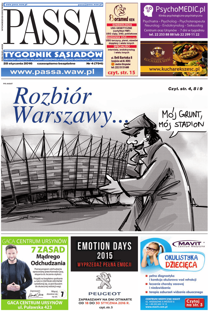 WYCHODZI OD 2000 ROKU ISSN 1640–405X 28 stycznia 2016 czasopismo bezpłatne Nr 4 (794) RYS. AUGUST Czyt. str. 4, 8 i 9 2 Sesja Rady Ursynowa Jurczyńska pozostaje przewodniczącą Radnym Naszego Ursynowa i PiS nie udało się odwołać Teresy Jurczyńskiej-Owczarek z funkcji przewodniczącej dzielnicowej Rady. Adwersarze zarzucali jej karygodne zachowanie wobec mieszkańców i niezrozumienie ich potrzeb. Na sali obrad znaleźli się jednak przede wszystkim obrońcy przewodniczącej, która startowała wprawdzie w wyborach samorządowych jako reprezentantka ugrupowania Nasz Ursynów, ale po zdobyciu mandatu zdecydowała się na przejście do koalicji PO – IMU, która dzięki temu objęła władzę. Stając w obronie Teresy Jurczyńskiej-Owczarek, radny z ramienia PO Tomasz Sieradz, stwierdził, że opozycyjne obecnie ugrupowania NU i PiS nie mogą pogodzić się z utratą władzy. NU był nawet za tym, żeby na stanowisko przewodniczącego Rady powołać kogokolwiek z rządzącej koalicji, odwołując Teresę Jurczyńską-Owczarek. Ostatecznie do odwołania nie doszło, bowiem koalicja stosunkiem głosów 14:11 odrzuciła wniosek opozycji. Potrącił dziewczynkę i uciekł z miejsca zdarzenia! Kolejny pirat drogowy na KEN Policjanci zatrzymali kierującego bmw, który w piątek na Ursynowie potrącił stojącą przed przejściem dla pieszych 13-letnią dziewczynkę. Mężczyzna dopuścił się haniebnego czynu – zamiast udzielić pomocy poszkodowanej, najzwyczajniej uciekł z miejsca wypadku. Na szczęście został już zatrzymany. Za spowodowanie wypadku drogowego, którego następstwem są ciężkie obrażenia ciała oraz ucieczkę z miejsca zdarzenia grozi mu nawet do 12 lat więzienia. Jak ustalili policjanci, kierowca bordowego BMW jechał aleją KEN, chciał skręcić w ul. Telekiego. Wpadł w poślizg i potrącił stojącą na chodniku 13-latkę. Uciekł z miejsca zdarzenia. Poszkodowana – uczennica jednego z ursynowskich gimnazjów – z pękniętą czaszką trafiła do szpitala. Policjanci natychmiast rozpoczęli poszukiwania kierującego bmw. Szybko ustalili numer rejestracyjny pojazdu. Samochód był zarejestrowany poza województwem mazowieckim. Kolejnym krokiem było ustalenie, kto prowadził pojazd, gdy doszło do wypadku. Funkcjonariusze potrzebowali tylko 4 godzin, by to ustalić. Wytypowali 4 obywateli Ukrainy, którzy wcześniej poruszali się tym samochodem. W drodze eliminacji wskazali dwóch mężczyzn, których doprowadzono do jednostki policji. W trakcie czynności jeden z nich przyznał, że to on kierował bmw. Był trzeźwy. Zostanie jednak dodatkowo poddany badaniu krwi, by sprawdzić, czy nie był pod wpływem środków odurzających. Pojazd, którym poruszał się zatrzymany, został zabezpieczony. Zostanie teraz poddany oględzinom. Prawdopodobnie jutro zatrzymany zostanie przesłuchany i usłyszy zarzuty. Za spowodowanie wypadku drogowego, którego skutkiem są ciężkie obrażenia ciała oraz ucieczkę z miejsca zdarzenia grozi LuK nawet do 12 lat pozbawienia wolności. 3 4 Uderz w Szeroczyńską, Szpringer się odezwie... D rżącymi rękami otwierałem kilka dni temu kopertę z korespondencją Prokuratury Rejonowej Warszawa-Mokotów, opatrzoną sygnaturą akt: 6 Ds/902/2015. Bardziej oczekiwałem bowiem tej korespondencji niż listu miłosnego od ukochanej. O kontakt osobisty upraszałem od listopada samą panią prokurator rejonową Małgorzatę Szeroczyńską, licząc, że w reakcji na moje gorące apele odezwie się do mnie możliwie szybko – choć słowem. No i – jak już mi się wydawało – ten wielki dzień nareszcie nastąpił. A tu masz babo placek! Ku memu głębokiemu rozczarowaniu, pod adresowanym do mnie listem nie podpisała się bynajmniej pani Małgorzata, tylko machnął jakiegoś kulfona jej zastępca Paweł Szpringer, pozostawiając mnie w przedłużającej się tęsknocie za M. Ja bowiem jestem jak ten bohater wiersza Tadeusza Żeleńskiego-Boya: „Kto poznał panią Stefanią, Ten wolał od innych pań ją /.../. Takiej doznał dziwnej manii, Że chciał tylko od Stefanii.” I ja podobnie – chciałem odpowiedzi na dręczące mnie tygodniami pytania tylko od rejonowej pani Małgorzaty, której szanowny pan Paweł Szpringer w żadnym razie nie jest w stanie w moim skołatanym życiu zastąpić. A to z nader prostego powodu. Otóż wszelkie próby skrytykowania działalności jakichkolwiek instytucji i urzędów mają sens, jeśli oprócz wskazania niedociągnięć lub błędów wymieni się konkretną osobę za to odpowiedzialną – po nazwisku. Inaczej – czekaj tatka latka, nawet poczuwający się do winy urzędnik lub funkcjonariusz nie zechcą zareagować, udając, że ich to nie dotyczy. Nic dziwnego więc, że uparłem się na panią Sz., która jednak – wbrew moim zapałom – próbuje mnie zwyczajnie olewać. Tymczasem nam się w redakcji wydaje, że źle się dzieje – już nie tyle w państwie duńskim, ile w państwie pod prezydencją pani Małgorzaty przy ulicy Wiktorskiej 91a. A powody owego zła zostały wielokrotnie w „Passie” wyłuszczone piórem red. Tadeusza Porębskiego, który jako człek zasiedziały na Mokotowie odkrył był, iż z własnością nieruchomości przy ul. Narbutta 60 (o rzut beretem lub togą od Wiktorskiej) ktoś usiłuje uczynić przekręt. Tadeusz zdobył na to niezbite dowody i natychmiast przedstawił je państwu prokuratorstwu, biorącemu państwowe pieniądze za pilnowanie ładu prawnego. onsekwencją zawiadomienia o możliwości popełnienia przestępstwa, grożącego utratą majątku komunalnego wartego ciężkie miliony złotych, były policyjne przesłuchania, jakim poddano i Tadeusza jako autora demaskatorskiego reportażu, i mnie – jako redaktora naczelnego „Passy”. Tadeusz – niczym agent 007 – wyczaił, że legalność ustanawiającego własność nieruchomości przy Narbutta 60 aktu notarialnego, pochodzącego z 1947 roku, budzi poważne wąt- K RYS. 