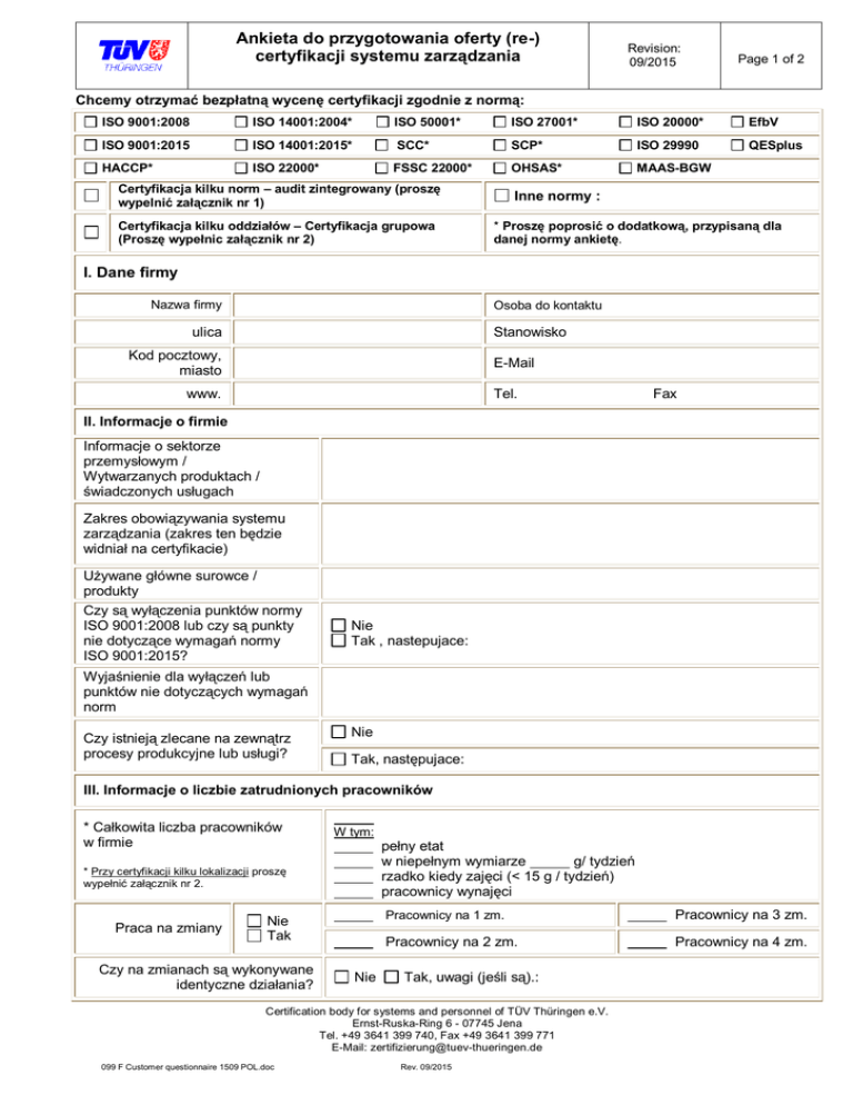 Ankieta do przygotowania oferty (re-) certyfikacji systemu zarządzania Revision: 09/2015 Page 1 of 2 Chcemy otrzymać bezpłatną wycenę certyfikacji zgodnie z normą: ISO 9001:2008 ISO 14001:2004* ISO 50001* ISO 27001* ISO 20000* EfbV ISO 9001:2015 ISO 14001:2015* SCC* SCP* ISO 29990 QESplus HACCP* ISO 22000* FSSC 22000* OHSAS* MAAS-BGW Certyfikacja kilku norm – audit zintegrowany (proszę wypelnić załącznik nr 1) Certyfikacja kilku oddziałów – Certyfikacja grupowa (Proszę wypełnic załącznik nr 2) Inne normy : * Proszę poprosić o dodatkową, przypisaną dla danej normy ankietę. I. Dane firmy Nazwa firmy Osoba do kontaktu ulica Stanowisko Kod pocztowy, miasto E-Mail www. Tel. Fax II. Informacje o firmie Informacje o sektorze przemysłowym / Wytwarzanych produktach / świadczonych usługach Zakres obowiązywania systemu zarządzania (zakres ten będzie widniał na certyfikacie) Używane główne surowce / produkty Czy są wyłączenia punktów normy ISO 9001:2008 lub czy są punkty nie dotyczące wymagań normy ISO 9001:2015? Nie Tak , nastepujace: Wyjaśnienie dla wyłączeń lub punktów nie dotyczących wymagań norm Czy istnieją zlecane na zewnątrz procesy produkcyjne lub usługi? Nie Tak, następujace: III. Informacje o liczbie zatrudnionych pracowników * Całkowita liczba pracowników w firmie W tym: pełny etat w niepełnym wymiarze g/ tydzień rzadko kiedy zajęci (< 15 g / tydzień) pracownicy wynajęci * Przy certyfikacji kilku lokalizacji proszę wypełnić załącznik nr 2. Praca na zmiany Nie Tak Czy na zmianach są wykonywane identyczne działania? Nie Pracownicy na 1 zm. Pracownicy na 3 zm. Pracownicy na 2 zm. Pracownicy na 4 zm. Tak, uwagi (jeśli są).: Certification body for systems and personnel of TÜV Thüringen e.V. Ernst-Ruska-Ring 6 - 07745 Jena Tel. +49 3641 399 740, Fax +49 3641 399 771 E-Mail: [email protected] 099 F Customer questionnaire 1509 POL.doc Rev. 09/2015 Questionnaire for preparation of an offer Revision 09/2015 IV. Warunki specyficzne lokalizacji (proszę zaznaczyć Odsetek prostych czynności jest stosunkowo wysoki. Istnieje kilka linii produkcyjnych podobnego typu. Page 2 of 2 odpowiednio) Działania realizowane w kilku budynkach na miejscu. Procesy są bardzo skomplikowane lub występuje duża liczba unikalnych działalności . Istnieje tylko kilka grup produktów. Działania realizowane są w miejscach tymczasowych. (np budowy). Jest niski poziom przetwarzania. Istnieje wysoki stopień regulacji dotyczących wymogów zewnętrznych. V. Dane dotyczące systemu zarządzania Czy posiadają już Państwo wdrożony system zarządzania? Nie , wdrożony w: Tak, System: Przy wdrożeniu systemu zarządzania korzystaliśmy z usługi konsultingowej. Nazwisko konsultant a/ firma: Czy posiadają już Państwo system zarządzania certyfikowany przez inną jednostkę certyfikującą? Nie Tak, certyfikowany od , Dla następujących norm: Nazwa jednostki certyfikujacej: Chcemy otrzymać ofertę dotyczącą przejęcia* przez TÜV Thüringen e.V. istniejącej certyfikacji Nie Tak, kopia certyfikatu została dołączona do formularza * Uwaga: Przy przejęciu certyfikacji Jednostka Certyfikującą musi przejrzeć raporty z auditu ( certyfikującego/recertyfikującego i nad zorów), istniejące raporty niezgodności oraz ważny certyfikat (kopię). Proszę przesłać swój certyfikat wraz z ankietą oraz przesłać poprzednie raporty wraz z formularzem zlecenia Dalsze uwagi: , Miejscowość, Data Pieczątka, podpis kierownictwa W przypadku pytań do ankiety lub jeśli chcecie Państwo uzyskać więcej informacji, prosimy skorzystać z poniższych danych kontaktowych: TÜVPOL Sp. z o.o. ul. Powstańców Śl. 5, PL 53-332 Wrocław Tel. +48 71 332 76 51, Fax +48 71 361 12 38 e-mail: [email protected] 099 F Customer questionnaire 1509 POL.doc Zertifizierungsstelle für Systeme und Personal des TÜV Thüringen e.V. Ernst-Ruska-Ring 6 - 07745 Jena Tel. +49 3641 399 740, Fax +49 3641 399 771 E-Mail: [email protected] Rev. 09/2015 Questionnaire for preparation of an offer, annex 1 ANNEX 1 Revision 09/2015 Page 1 of 1 Należy wypełnić tylko przy certyfikacji zintegrowanego systemu zarządzania Ankieta dotycząca certyfikacji kilku norm jako audyt zintegrowany Przy certyfikacji kilku systemów zarządzania równocześnie tzw. audyt zintegrowany (np. ISO 9001 + ISO 14001; ISO 9001 + ISO 22000) mamy do czynienia z efektem synergii, który prowadzi do skrócenia czasu auditu w Państwa firmie. W celu oszacowania Państwa firmy pod kątem stopnia synergii prosimy wskazać stopień integracji Państwa systemu zarządzania w odniesieniu do norm, które będą certyfikowane. Proszę zaznaczyć aspekty odnoszące się do Państwa zintegrowanego systemu zarządzania: Ocena zarządzania obejmuje całościową strategię organizacji i planowania dla wszystkich norm, które będą certyfikowane. Audyty wewnętrzne prowadzone są w trybie zintegrowanym dla wszystkich norm. Istnieje zintegrowane podejście do polityki i celów. Istnieje zintegrowane podejście do procesów systemowych. Dokumentacja, w tym instrukcje i procedury, została zintegrowana (na tyle, na ile jest to profesjonalnie uzasadnione). Istnieje zintegrowane podejście do procesów doskonalenia (działań korygujących, zapobiegawczych, metod pomiarowych i ciągłego doskonalenia ). Istnieje ujednolicone wsparcie zarządzania odpowiedzialności. Dalsze uwagi: , Miejscowość, Data TÜVPOL Sp. z o.o ul. Powstańców Śl. 5, PL 53-332 Wrocław Tel. +48 71 332 76 51, Fax +48 71 361 12 38 e-mail: [email protected] 099 F Customer questionnaire 1509 POL.doc Pieczątka / podpis kierownictwa Zertifizierungsstelle für Systeme und Personal des TÜV Thüringen e.V. Ernst-Ruska-Ring 6 - 07745 Jena Tel. +49 3641 399 740, Fax +49 3641 399 771 E-Mail: [email protected] Rev. 09/2015 Questionnaire for preparation of an offer, annex 2 Revision 09/2015 Page 1 of 1 ANNEX 2 Należy wypełnić tylko przy certyfikacji kilku 