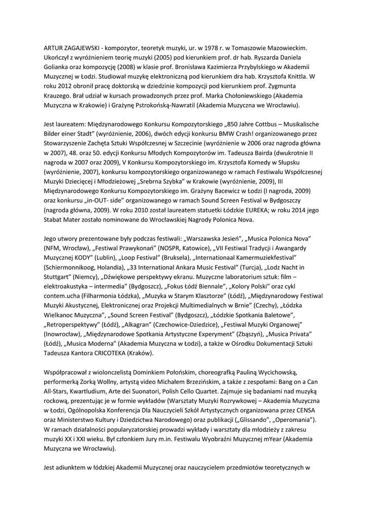 ARTUR ZAGAJEWSKI - kompozytor, teoretyk muzyki, ur. w 1978 r. w Tomaszowie Mazowieckim. Ukooczył z wyróżnieniem teorię muzyki (2005) pod kierunkiem prof. dr hab. Ryszarda Daniela Golianka oraz kompozycję (2008) w klasie prof. Bronisława Kazimierza Przybylskiego w Akademii Muzycznej w Łodzi. Studiował muzykę elektroniczną pod kierunkiem dra hab. Krzysztofa Knittla. W roku 2012 obronił pracę doktorską w dziedzinie kompozycji pod kierunkiem prof. Zygmunta Krauzego. Brał udział w kursach prowadzonych przez prof. Marka Chołoniewskiego (Akademia Muzyczna w Krakowie) i Grażynę Pstrokooską-Nawratil (Akademia Muzyczna we Wrocławiu). Jest laureatem: Międzynarodowego Konkursu Kompozytorskiego „850 Jahre Cottbus – Musikalische Bilder einer Stadt” (wyróżnienie, 2006), dwóch edycji konkursu BMW Crash! organizowanego przez Stowarzyszenie Zachęta Sztuki Współczesnej w Szczecinie (wyróżnienie w 2006 oraz nagroda główna w 2007), 48. oraz 50. edycji Konkursu Młodych Kompozytorów im. Tadeusza Bairda (dwukrotnie II nagroda w 2007 oraz 2009), V Konkursu Kompozytorskiego im. Krzysztofa Komedy w Słupsku (wyróżnienie, 2007), konkursu kompozytorskiego organizowanego w ramach Festiwalu Współczesnej Muzyki Dziecięcej i Młodzieżowej „Srebrna Szybka” w Krakowie (wyróżnienie, 2009), III Międzynarodowego Konkursu Kompozytorskiego im. Grażyny Bacewicz w Łodzi (I nagroda, 2009) oraz konkursu „in-OUT- side” organizowanego w ramach Sound Screen Festival w Bydgoszczy (nagroda główna, 2009). W roku 2010 został laureatem statuetki Łódzkie EUREKA; w roku 2014 jego Stabat Mater zostało nominowane do Wrocławskiej Nagrody Polonica Nova. Jego utwory prezentowane były podczas festiwali: „Warszawska Jesieo”, „Musica Polonica Nova” (NFM, Wrocław), „Festiwal Prawykonao” (NOSPR, Katowice), „VII Festiwal Tradycji i Awangardy Muzycznej KODY” (Lublin), „Loop Festival” (Bruksela), „Internationaal Kamermuziekfestival” (Schiermonnikoog, Holandia), „33 International Ankara Music Festival” (Turcja), „Lodz Nacht in Stuttgart” (Niemcy), „Dźwiękowe perspektywy ekranu. Muzyczne laboratorium sztuk: film – elektroakustyka – intermedia” (Bydgoszcz), „Fokus Łódź Biennale”, „Kolory Polski” oraz cykl contem.ucha (Filharmonia Łódzka), „Muzyka w Starym Klasztorze” (Łódź), „Międzynarodowy Festiwal Muzyki Akustycznej, Elektronicznej oraz Projekcji Multimedialnych w Brnie” (Czechy), „Łódzka Wielkanoc Muzyczna”, „Sound Screen Festival” (Bydgoszcz), „Łódzkie Spotkania Baletowe”, „Retroperspektywy” (Łódź), „Alkagran” (Czechowice-Dziedzice), „Festiwal Muzyki Organowej” (Inowrocław), „Międzynarodowe Spotkania Artystyczne Experyment” (Zbąszyo), „Musica Privata” (Łódź), „Musica Moderna” (Akademia Muzyczna w Łodzi), a także w Ośrodku Dokumentacji Sztuki Tadeusza Kantora CRICOTEKA (Kraków). Współpracował z wiolonczelistą Dominkiem Połooskim, choreografką Pauliną Wycichowską, performerką Zorką Wollny, artystą video Michałem Brzezioskim, a także z zespołami: Bang on a Can All-Stars, Kwartludium, Arte dei Suonatori, Polish Cello Quartet. Zajmuje się badaniami nad muzyką rockową, prezentując je w formie wykładów (Warsztaty Muzyki Rozrywkowej – Akademia Muzyczna w Łodzi, Ogólnopolska Konferencja Dla Nauczycieli Szkół Artystycznych organizowana przez CENSA oraz Ministerstwo Kultury i Dziedzictwa Narodowego) oraz publikacji („Glissando”, „Operomania”). W ramach działalności popularyzatorskiej prowadzi wykłady i warsztaty dla młodzieży z zakresu muzyki XX i XXI wieku. Był członkiem Jury m.in. Festiwalu Wyobraźni Muzycznej mYear (Akademia Muzyczna we Wrocławiu). Jest adiunktem w łódzkiej Akademii Muzycznej oraz nauczycielem przedmiotów teoretycznych w Zespole Szkół Muzycznych im. S. Moniuszki w Łodzi, a także członkiem Związku Kompozytorów Polskich oraz Komisji Programowej Międzynarodowego Festiwalu Muzyki Współczesnej „Warszawska Jesieo”.