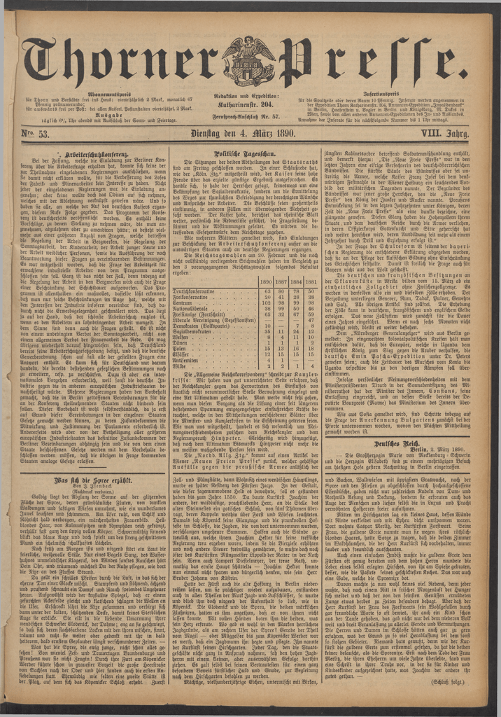 Thorner Abonnementspreis für T h o r n und Borstädte frei ins H a u s : vierteljährlich 2 M a rk , monatlich 67 Pfennig pränum erando; für a u s w ä r t s frei per Post: bei allen Kaiser!. Postanstalten vierteljährl. 2 M ark. Ausgabe t ägl i ch 6Vs U hr abends m it Ausschluß der So nn - und Feiertage. Znsertionspreis Redaktion und Expedition: für die Spaltzeile oder deren Raum 10 Pfennig. Inserate werden angenommen in der Expedition Thorn Katharinenftr. 204, Annoncen-Expedition „Jnvalidendank" in B erlin , Haasenstein u. Vogler in B erlin und Königsberg, M . Dukes in W ien, sowie von allen anderen Annoncen-Expedirionen des I n - und Allslandes. Katharinenftr. 204. Fernsprech-Anschluß N r . 57. Annahme der Inserate fü r die nächstfolgende Nummer bis 1 U hr mittags. Dienstag den 4. März 1890. 53. Aröeiterschuhkonferenz. B e i der Fassung, welche die E inladung zur B e rlin e r Kon ferenz über die Arbeiterfrage erhalten hat, konnte sich keine der zur Theilnahm e eingeladenen Regierungen ausschließen, wenn sie dam it nicht erklären wollte, fü r die Verbesserung des Loses der Fabrik- und M inenarbeiter kein Interesse zu haben. Nicht jeder der eingeladenen Regierungen w ar die E inladung an genehm; aber keine wollte doch das O dium auf sich nehmen, welches m it der Ablehnung verknüpft gewesen wäre. Und so haben sie alle, an welche der R u f des deutschen Kaisers ergan gen, diesem R ufe Folge gegeben. D as P rogram m der Konfe renz ist deutscherseits veröffentlicht worden. Es enthält keine Vorschläge, zu denen S te llu n g zu nehmen wäre, die man anznnehmen, abzulehnen oder zu amendiren hätte; es besteht v ie l mehr aus einer größeren Anzahl von Fragen, welche betreffen die Regelung der A rb e it in Bergwerken, die Regelung der S onntagsarbeit, der Kinderarbeit, der A rb e it junger Leute und der A rbeit weiblicher Personen, sowie die A usführung der nach B eantw ortung dieser Fragen zu vereinbarenden Bestimmungen. Es w ar m itgetheilt worden, daß die Frage der Arbeitszeit fü r erwachsene industrielle Arbeiter von dem P rogram m ausge schlossen sein soll. Ganz ist das nicht der F a ll, denn inbezug aus die Regelung der A rb e it in den Bergwerken w ird auch die Frage einer Beschränkung der Schichtdauer aufgeworfen. D as P ro gramm ist allenthalben ein maßvolles, dasselbe läßt erkennen, daß man n u r solche Beschränkungen im Auge hat, welche m it den Interessen der In d u s trie insofern vereinbar sind, daß da durch nicht die Erwerbsgelegenheit geschmälert w ird . D as liegt ja auf der H and, daß der schönste Arbeiterschutz nutzlos ist, wenn es den Arbeitern an lohnbringender A rb e it mangelt. I n dem S in n e sind denn auch die Fragen gestellt. Es ist nicht von einem unbedingten Verbot der S onntagsarbeit, nicht von einem allgemeinen Verbot der Frauenarbeit die Rede. Es mag übrigens wiederholt darauf hingewiesen sein, daß Deutschland bereits seine Arbeiterschutzgesetzgebung besitzt, und daß die deutsche Gewerbeordnung schon auf fast alle der gestellten Fragen eine A n tw o rt enthält. Es kann sich fü r Deutschland n u r darum handeln, die bereits bestehenden gesetzlichen Bestimmungen noch zu erweitern, resp. zu verschärfen. Dazu ist aber ein in te r nationales Vorgehen erforderlich, w eil sonst die deutsche I n dustrie gegen die in anderen europäischen Industriestaaten be n a c h te ilig t würde. Mehrere Regierungen haben den V orbehalt gemacht, daß die in B e rlin getroffenen Vereinbarungen fü r die an der Konferenz theilnehmenden S taaten nicht bindend sein sollen. Dieser V orbehalt ist w ohl selbstverständlich, da ja erst auf G rund dieser Vereinbarungen in den einzelnen S taaten Gesetze gemacht werden können, zu deren Zustandekommen die M itw irk u n g und Zustim m ung der Parlam ente erforderlich ist. Andererseits w ird aber von der B etheiligung aller größeren europäischen Industriestaaten das definitive Zustandekommen der B e rlin e r Vereinbarungen abhängig sein und die von dem einen S taate beschlossenen Gesetze werden m it dem Vorbehalte be schlossen werden müssen, daß die übrigen in Frage kommenden S taaten analoge Gesetze erlassen. Mas sich die Spree erzählt. V o n I . Jsenbeck. (Nachdruck verboten.) 4 Press G oldig liegt der Abglanz der Sonne auf der glitzernden Fläche der Spree, deren grünbläuliche F lu te n , von dunklen W aldungen und saftigen Wiesen um rahm t, wie ein wundersames J u w e l leuchten und schimmern. A m U fer ru h t, von S c h ilf und Röhricht halb verborgen, ein märchenhaftes Frauenbild. H ell blondes H aar, von Kalmusspitzen und Nymphäen reich gekränzt, verhüllt fast ganz den üppig vollen Körper. Schwermüthig sinnend blickt das blaue Auge und doch spielt um den streng geschnittenen M u n d ein schelmisch schalkhaftes Lächeln. Noch früh am M orgen ists und nirgend stört ein L a u t die feierliche, weihevolle S tille . N u r eines Vogels S a n g , des Wasser huhnes »«melodischer K lageruf, des W indes sanftes Rauschen hört D e in O hr, und träumend möchtest D u der Ruhe pflegen, wie dort die Nixe an des Flusses S tra n d . D a gellt ein schrilles Pfeifen durch die L u ft, in das sich der eherne T o n einer Glocke mischt. Stam pfend und stöhnend, ächzend und prustend schnaubt «in D a m p f und Rauch speiendes Ungeheuer heran. A ufgew ühlt w ird der krystallne Spiegel, daß er einem gefurchten Ackerfelde gleicht und klatschend schlagen die W ellen an die Ufer. Erschreckt fä h rt die Nixe zusammen und ve rb irg t sich dann unter der kalten, schützenden Decke, dam it keines Sterblichen Auge sie erblicke. S ie e ilt in die liebende Um arm ung ihrer wendischen Schwester Clodenick, der D ahm e; eng an sie geschmiegt, so daß sich deren flachsfarbene Locken m it den ihren mischen, sinnt, träum t und ru h t sie weiter oder gedenkt m it ih r in bald heiterem, bald ernstem Geplauder längst verschwundener Zeiten. — W as hat die S pree, die ewig junge, nicht schon alles ge sehen! V o 