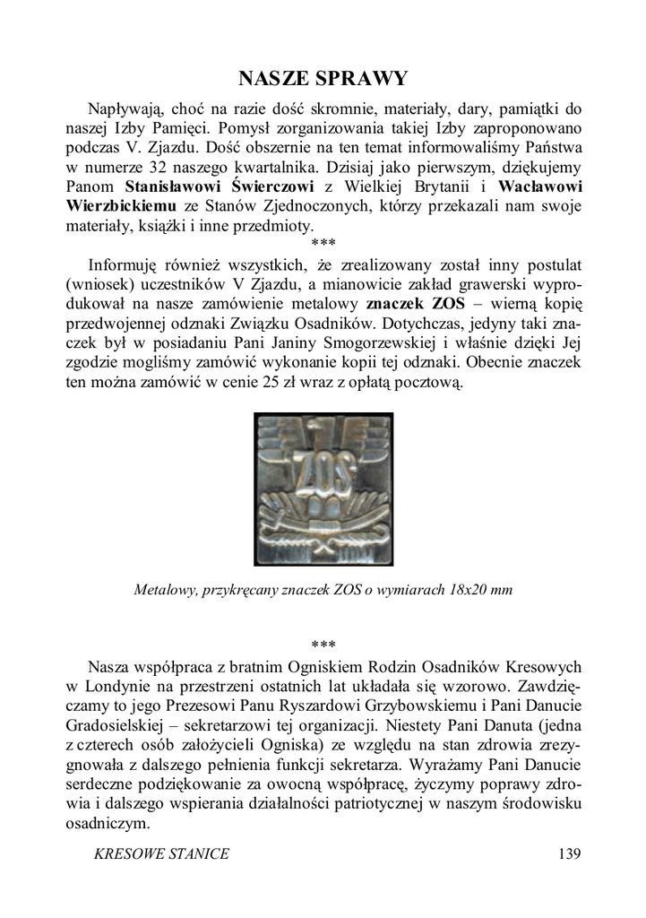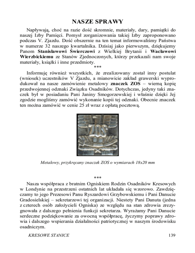NASZE SPRAWY Napływają, choć na razie dość skromnie, materiały, dary, pamiątki do naszej Izby Pamięci. Pomysł zorganizowania takiej Izby zaproponowano podczas V. Zjazdu. Dość obszernie na ten temat informowaliśmy Państwa w numerze 32 naszego kwartalnika. Dzisiaj jako pierwszym, dziękujemy Panom Stanisławowi Świerczowi z Wielkiej Brytanii i Wacławowi Wierzbickiemu ze Stanów Zjednoczonych, którzy przekazali nam swoje materiały, książki i inne przedmioty. *** Informuję również wszystkich, że zrealizowany został inny postulat (wniosek) uczestników V Zjazdu, a mianowicie zakład grawerski wyprodukował na nasze zamówienie metalowy znaczek ZOS – wierną kopię przedwojennej odznaki Związku Osadników. Dotychczas, jedyny taki znaczek był w posiadaniu Pani Janiny Smogorzewskiej i właśnie dzięki Jej zgodzie mogliśmy zamówić wykonanie kopii tej odznaki. Obecnie znaczek ten można zamówić w cenie 25 zł wraz z opłatą pocztową. Metalowy, przykręcany znaczek ZOS o wymiarach 18x20 mm *** Nasza współpraca z bratnim Ogniskiem Rodzin Osadników Kresowych w Londynie na przestrzeni ostatnich lat układała się wzorowo. Zawdzięczamy to jego Prezesowi Panu Ryszardowi Grzybowskiemu i Pani Danucie Gradosielskiej – sekretarzowi tej organizacji. Niestety Pani Danuta (jedna z czterech osób założycieli Ogniska) ze względu na stan zdrowia zrezygnowała z dalszego pełnienia funkcji sekretarza. Wyrażamy Pani Danucie serdeczne podziękowanie za owocną współpracę, życzymy poprawy zdrowia i dalszego wspierania działalności patriotycznej w naszym środowisku osadniczym. KRESOWE STANICE 139 *** Do niniejszego numeru dołączony jest APEL do wszystkich Państwa, z prośbą o przesłanie ankiety (po wypełnieniu) do Pani Janiny Smogorzewskiej lub na adres Stowarzyszenia. Sprawa dotyczy losów naszych rodzin – ich wojennych strat osobowych wśród osadnictwa wojskowego w latach 1939-1940. Jest to naprawdę ostatni moment by uzupełnić informację o swojej rodzinie, o zmarłych w wyniku wojny zarówno o członkach rodzin jak i innych znanych osobach z osadniczego środowiska. Praca Pani Janiny Smogorzewskiej nad opracowaniem książkowym z tego tematu są bardzo zaawansowanie i jest to naprawdę ostatni dzwonek by dosłać informacje o swojej rodzinie. W imieniu Autorki będziemy bardzo wdzięczni. Mile widziane zdjęcia z okresu 1939-1946 r. *** Dziękuję Pani Barbarze Powroźnik za przesłanie 20 swoich książek do rozprowadzenia wśród naszych członków, a uzyskane dochody przeznaczyć na działalność Stowarzyszenia. *** Serdecznie dziękujemy wszystkim tym, którzy (dodatkowo oprócz składek i prenumeraty) dokonali wpłat na naszą działalność lub na fundusz wydawniczy. Oczekuje nas kolejny wydatek związany z wymianą okien w naszej siedzibie przy ul. Poznańskiej i każda złotówka się przyda. *** Uwaga: Od dnia 1 października 2006 r. zmieniają się numery konta w naszym Banku. Oto nasz nowy numer: 46 2360 0005 0000 0045 5003 0791 Nowe blankiety opłat z nowym numerem konta dołączamy do niniejszego numeru KRESOWYCH STANIC. *** Witamy w naszym gronie nowych członków: 479 Joanna Kędzia, os. Laskowicze Wielkie, pow. Prużany, córka osadnika *** Oto lista nr 7 wpłat na pomnik za okres od 2 maja do 1 sierpnia 2006 r.: Solecki Lech 50 USD Kowalewski Junosza Wszystkim ofiarodawcom dziękujemy. *** 140 24 zł KRESOWE STANICE Wpłaty na działalność Stowarzyszenia od 2 maja do 15 sierpnia 2006 r.: Ćwirko Derwich Helena 210 zł Jancz Janina 24 zł Siemiginowska Wanda 24 zł Ursyn Niemcewicz Barbara 100 zł Nowak Halina 60 zł Skrzypecki Piotr 24 zł Kornecka Józefa 44 zł Ordyńska Irena 430 zł Niedzielski Henryk 70 zł Kędzia Joanna 59zł Ożarowski Wacław 74 zł Wspólnota Mieszkaniowa Poznańska 11 100 zł *** Wpłaty na fundusz wydawniczy od 2 maja do 15 sierpnia 2006 r.: Szymański Jakub Pawełkiewicz Bronisława Konieczko Kazimiera Szczepanik Anna Czernik Maciej Hajduk Jerzy Łoźna Regina Bodzińska Julita Konarski Wawrzyniec Dobrzycka Franciszka Strzałka Krystyna Sieczkowski Piotr 100 zł 24 zł 24 zł 24 zł 60 zł 50 zł 24 zł 24 zł 530 zł 14 zł 24 zł 60 zł Szymański Aleksander 1000 zł Solecki Lech 50 USD Szymański Jakub 300 zł *** Wpłaty na budowę kościoła w Klecku od 2 maja do 15 sierpnia 2006 r.: Szymański Aleksander 500 zł Szymański Jakub 800 zł Szymański Kazimierz1800 zł – ze zbiórki kościelnej w Nowej Hutcie (Kraków) Solecki Lech 50 USD *** Zapraszamy na otwarte zebrania Zarządu Stowarzyszenia. Oto najbliższe terminy zebrań: 30 października, 27 listopada i 18 grudnia o godz. 1600. Pełnimy stałe dyżury: sekretariat i redakcja KRESOWYCH STANIC – w każdy czwartek od 14.00 do 16.00. *** KRESOWE STANICE 141 Do kupienia Książki: Antoni Tomczyk Felicja Konarska – „Uciekając przed łomotem kolb” 20 zł – „Liście na wietrze” wyd. III 20 zł – „Kolory w szarości” 20 zł Bolesław Dańko – „Bez układów” 18 zł Barbara Tokarska – „Otynijskie gawędy i wspomnienia” 20 zł Barbara Powroźnik – „Między nocą rozpaczy – a świtem nadziei” 10 zł Plakietki Związku Osadników i sztandaru stowarzyszenia 8 zł/szt. Pomnik Osadników Wojskowych Kresów Wschodnich – obrazek w ramce 10 zł Pamiątkowe teczki zjazdowe z IV i V Zjazdu 3 zł/szt. Zeszyt nr 1 Osadnicy wojskowi Kresów Wschodnich w osadach woj. wołyńskiego 40 zł Zeszyt nr 2 Osadnicy wojskowi Kresów Wschodnich w osadach woj. nowogródzkiego 32 zł Zeszyt nr 3 Osadnicy wojskowi Kresów Wschodnich w osadach woj. białostockiego 32 zł Zeszyt nr 4 Osadnicy wojskowi Kresów Wschodnich w osadach woj. wileńskiego 32 zł Zeszyt nr 5 Osadnicy wojskowi Kresów Wschodnich w osadach woj. poleskiego 32 zł Kasety video i płyty DVD – film z przebiegu V. Zjazdu wraz z uroczystością odsłonięcia i poświęcenia pomnika, 30 zł/szt. Kasety video i płyty DVD – film z występem zespołu „Prawnuki” w