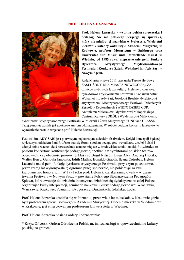 PROF. HELENA ŁAZARSKA Prof. Helena Łazarska - wybitna polska śpiewaczka i pedagog. Nie ma polskiego liczącego się śpiewaka, który nie miałby jej nazwiska w życiorysie. Wieloletni kierownik katedry wokalistyki Akademii Muzycznej w Krakowie, profesor Mozarteum w Salzburgu oraz Universität für Musik und Darstellende Kunst w Wiedniu, od 1985 roku, nieprzerwanie pełni funkcje Dyrektora Artystycznego Międzynarodowego Festiwalu i Konkursu Sztuki Wokalnej im. Ady Sari w Nowym Sączu. Rada Miasta w roku 2011 przyznała Tarcze Herbowe ZASŁUŻONY DLA MIASTA NOWEGO SĄCZA czwórce wybitnych ludzi kultury: Helenie Łazarskiej, dyrektorowi artystycznemu Festiwalu i Konkursu Sztuki Wokalnej im. Ady Sari, Józefowi Brodzie, dyrektorowi artystycznemu Międzynarodowego Festiwalu Dziecięcych Zespołów Regionalnych ŚWIĘTO DZIECI GÓR, Antoniemu Malczakowi, dyrektorowi Małopolskiego Centrum Kultury SOKÓŁ i Waldemarowi Malickiemu, dyrektorowi Międzynarodowego Festiwalu Wirtuozerii i Żartu Muzycznego FUND and CLASSIC. Trzej panowie zostali już udekorowani tym odznaczeniami. W sobotę podczas koncertu laureatów to wyróżnienie zostało wręczone prof. Helenie Łazarskiej. Festiwal im. ADY SARI jest pierwszym, najstarszym sądeckim festiwalem. Dzięki koncepcji będącej wyłącznym udziałem Pani Profesor stał się forum spotkań pedagogów-wokalistów z całej Polski i zdobył sobie ważne i dziś powszechnie uznane miejsce w środowisku sztuki i nauki. Potwierdza to poziom koncertów, konferencje pedagogiczne, spotkania z dyrektorami polskich teatrów operowych, czy obecność jurorów tej klasy co Birgit Nilsson, Luigi Alva, Andrzej Hiolski, Walter Berry, Gundula Janowitz, Edith Mathis, Bonaldo Giaotti, Ileana Cotrubas. Helena Łazarska nadal pełni funkcję dyrektora artystycznego Festiwalu, przy czym początkowo, przez szereg lat wykonywała tę ogromną pracę społecznie, nie pobierając za swe kierownictwo honorarium. W 1991 roku prof. Helena Łazarska zainicjowała – w czasie trwania Festiwalu w Nowym Sączu – powstanie Polskiego Stowarzyszenia Pedagogów Śpiewu, które owocuje do dziś dnia intensywną działalnością dydaktyczną w całej Polsce, organizując kursy interpretacji, seminaria naukowe i kursy pedagogiczne we: Wrocławiu, Warszawie, Krakowie, Poznaniu, Bydgoszczy, Dusznikach, Gdańsku, Łodzi. Prof. Helena Łazarska urodziła się w Poznaniu, przez wiele lat mieszkała w Krakowie gdzie była profesorem śpiewu solowego w Akademii Muzycznej. Obecnie mieszka w Wiedniu oraz w Krakowie, jest emerytowanym profesorem Uniwersytetu w Wiedniu. Prof. Helena Łazarska posiada ordery i odznaczenia: * Krzyż Oficerski Orderu Odrodzenia Polski, m. in. „za zasługi w upowszechnianiu kultury polskiej za granicą” * Złoty Krzyż Zasługi * Złoty Medal Zasłużony Kulturze GLORIA ARTIS Przebieg pracy twórczej i działalności kulturalnej: HELENA ŁAZARSKA ukończyła Wyższą Szkołę Muzyczną w Krakowie, gdzie otrzymała dyplom z wyróżnieniem w 1960 roku. Doskonaliła swe umiejętności w Paryżu (P.Bernac), Weimarze (L.Fischer) i Mediolanie (E. de Hidalgo). * W latach 1964 – 72 była solistką Opery Śląskiej w Bytomiu. * Koncertowała w liczących się salach na terenie całej Europy, republikach byłego ZSSR, Ameryki Południowej, obok występów w operze, dając wiele recitali pieśni. Brała udział w festiwalach w Pradze, Barcelonie, Paryżu, Avignon, byłym ZSRR, Ameryce Płd. oraz na „Warszawskiej Jesieni“ i „Holland-festival“. * Działalność pedagogiczną rozpoczęła na początku lat 70 w Państwowej Szkole Muzycznej II stopnia w Nowym Sączu, kolejno ucząc w Wyższych Szkołach Muzycznych w Katowicach, Gdańsku oraz w Krakowie, gdzie szereg lat była kierownikiem Katedry Wokalistyki i członkiem senatu. W 1995 roku otrzymała tytuł profesora. * W latach 80 – tych była przez dwie kadencje członkiem Rady Wyższego Szkolnictwa Artystycznego przy Ministrze Kultury oraz przez szereg lat członkiem Rady Programowej Polskiego Wydawnictwa Muzycznego. * Po wielkim sukcesie pokazów pedagogicznych na Światowym Kongresie Pedagogów Śpiewu w Strasburgu w 1987 roku, Helena Łazarska została zaangażowana do Mozarteum w Salzburgu, gdzie otrzymała tytuł profesora zwyczajnego, (prawie równocześnie wygrywając także konkurs na profesora zwyczajnego w Hamburgu w lutym 1988). * Od 1991 do 2006 prowadziła klasę śpiewu solowego w Universität für Musik und darstellende Kunst w Wiedniu. * Jest honorowym członkiem brytyjskiego Stowarzyszenia Pedagogów Śpiewu „Aotos“, będąc aktualnie uznaną jako jeden z najbardziej liczących się pedagogów śpiewu w Europie. * Uczniowie Heleny Łazarskiej (których uczyła śpiewu przeważnie od początku) są laureatami ponad 50 nagród na liczących się międzynarodowych konkursach wokalnych. Większość z nich prowadzi aktywną, solistyczną działalność zawodową, śpiewając na krajowych i międzynarodowych scenach – ponad 90% z nich ma stałe kontrakty. Niektórzy są także pedagogami, mającymi już dziś wyniki swej pracy dydaktycznej. * Profesor Helena Łazarska prowadziła ponad 150 mistrzowskich kursów wokalnych w Polsce, Austrii (Salzburg – Sommerakademie: nieprzerwanie od 1990), Belgii, dawnej Jugosławii i Czechosłowacji, Francji, Hiszpanii, Republice Federalnej Niemiec (m.in. na Europejskim Kongresie Profesorów Śpiewu w Detmold – 1994), Wenezueli, Korei Płd. * Była również wykładowcą seminariów dla pedagogów śpiewu w Polsce, Austrii i Hiszpanii przy czym za granicą były to najczęściej dwutygodniowe kursy praktyczne dla pedagogów. * Profesor Helena Łazarska zasiadała wielokrotnie w jury najważniejszych międzynarodowych konkursów wokalnych jak np. w Genewie, Pradze, Paryżu, Salzburgu, Wiedniu, Karlovych Varach, Belgradzie, Warszawie, Caracas, Seulu, s`Hertogenbosch. Fot. Elisabeth Novy