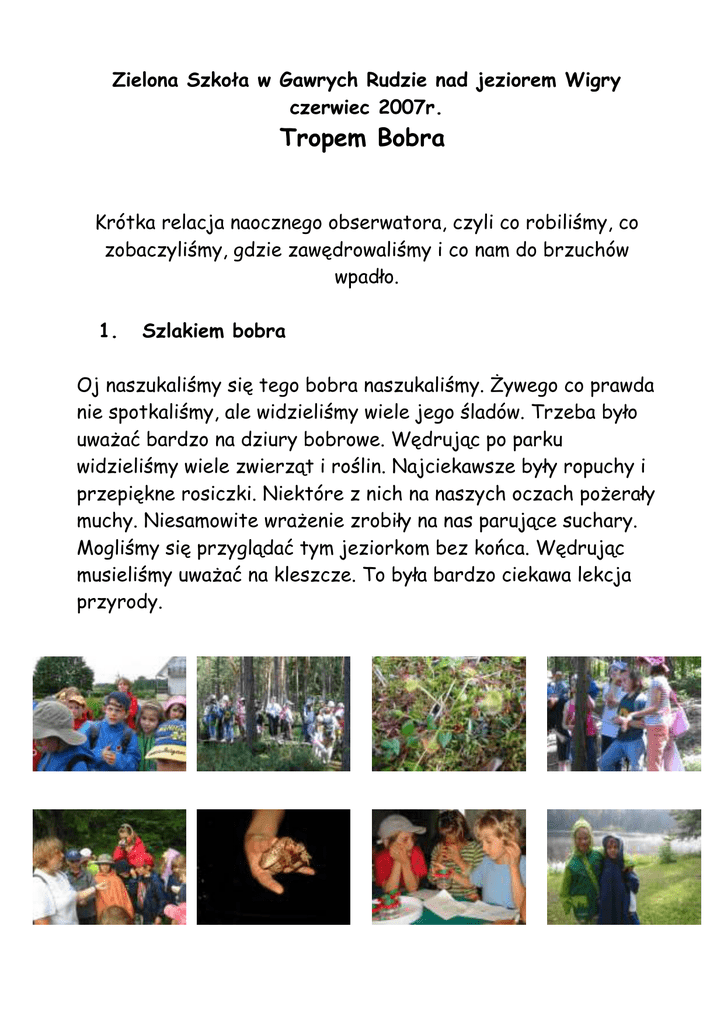 Zielona Szkoła w Gawrych Rudzie nad jeziorem Wigry czerwiec 2007r. Tropem Bobra Krótka relacja naocznego obserwatora, czyli co robiliśmy, co zobaczyliśmy, gdzie zawędrowaliśmy i co nam do brzuchów wpadło. 1. Szlakiem bobra Oj naszukaliśmy się tego bobra naszukaliśmy. śywego co prawda nie spotkaliśmy, ale widzieliśmy wiele jego śladów. Trzeba było uwaŜać bardzo na dziury bobrowe. Wędrując po parku widzieliśmy wiele zwierząt i roślin. Najciekawsze były ropuchy i przepiękne rosiczki. Niektóre z nich na naszych oczach poŜerały muchy. Niesamowite wraŜenie zrobiły na nas parujące suchary. Mogliśmy się przyglądać tym jeziorkom bez końca. Wędrując musieliśmy uwaŜać na kleszcze. To była bardzo ciekawa lekcja przyrody. 2. Krowa i mleko Krowa przez nas wydojona. Cała bańka napełniona. Gospodyni ser zrobiła. Była przy tym bardzo miła. Masło zrobiliśmy sami. Nakarmili nas serami. Kiedy mleko wypiliśmy, Na sam koniec śpiewaliśmy. To był dzionek bardzo miły. Dał nam sporo nowej siły. Obejrzyjcie zresztą sami. I nacieszcie się zdjęciami. 3. Wielka wyprawa Trzeciego dnia zielonej szkoły pierwszaki wybrały się na wielką wyprawę do klasztoru Kamedułów. Najpierw jechaliśmy kolejką wąskotorową. Po drodze zatrzymaliśmy się w lesie nad jeziorem, mogliśmy rozprostować kości. Dalej kolejka zawiozła nas do ślicznych koni. Czekały na nas dwie bryczki. Konie powiozły nas przez piękny las. Dojechaliśmy na cudowną poziomkową polanę. Rosły tam tysiące pysznych czerwonych owoców. A jaki się unosił zapach. Z napoziomkowanymi do pełna brzuszkami powędrowaliśmy na przystań, do której przypłynął po nas statek. Tu zaczęliśmy ostatni etap naszej podróŜy. Płynąc po jeziorze Wigry zbliŜaliśmy się powoli do klasztoru Kamedułów. Z samego środka jeziora wyglądał niesamowicie. Kapitan pozwolił nam przymierzyć swoją czapkę. Na statku spotkaliśmy naszego pana listonosza z Warszawy. Po obejrzeniu klasztoru, bardzo zmęczeni wróciliśmy autokarem na pyszniutki obiad. 4. Klasztor Kamedułów Przepiękny klasztor najpierw oglądaliśmy z zewnątrz. W środku zwiedziliśmy apartamenty papieskie i przyklasztorny kościół, który zrobił na nas duŜe wraŜenie. Na koniec weszliśmy na wieŜę widokową, skąd mogliśmy podziwiać rozciągające się daleko jezioro Wigry. Oczywiście było to świetne miejsce do zrobienia wielu zdjęć, no i nie zapomnieliśmy o kupieniu pamiątek dla naszych kochanych rodziców. 5. Pieczenie chleba Mąka, woda, sól, zakwas i do tego duŜo duŜo siły i serca pani gospodyni. Plus oczywiście dębowa dzieŜa i juŜ ciasto na chleb gotowe. Trzeba było poczekać, aŜ chlebuś urośnie a potem się upiecze w specjalnym piecu. Wyszedł pyszny, ale jeszcze lepsze były droŜdŜowe bułeczki, które sami formowaliśmy. Ale było przy tym zabawy. Podczas pieczenia pozmieniały trochę kształty i trudno je było rozpoznać. , ale jakoś nam się udało. Czekając, aŜ bułeczki wyskoczą z pieca, jeździliśmy na konikach. A gdy juŜ nakarmiliśmy brzuszki, poszliśmy nad pobliska rzeczkę pomoczyć stopy. Były teŜ huśtawki i mnóstwo kolorowych kwiatów. 6. Pluskanki- kąpanki W przeddzień wyjazdu poszliśmy zanurzyć się w jeziorze. Oj trzeba było przejść niezły kawał drogi. Ale za to wplusknięcie do wody było wyjątkowo przyjemne. Będąc na kąpielisku zdobywaliśmy sprawność bobra. Trzeba było popłynąć od pomostu na którym stał pan Wojtek do pomostu, na którym czekała pani Paulina. To był spory kawałek do przepłynięcia. Ale my doświadczone bobry poradziliśmy sobie rewelacyjnie. Po kąpieli graliśmy w plaŜową siatkówkę i jedliśmy droŜdŜówki. 7. Bobrowy pamiętnik Na wyprawę „tropem bobra” zabraliśmy specjalne zeszyciki – pamiętniki. JuŜ pierwszego dnia po przyjeździe zabraliśmy się do intensywnej pracy. Jak bobry pracowicie budują swoje Ŝeremia, tak my wzięliśmy się za wyklejanie okładek naszych pamiętników. I od tego momentu mieliśmy juŜ w czym opisywać zieloną szkołę. KaŜdego wieczoru był na to specjalnie przeznaczony czas. Pisanki, wyklejanki, rysowanki, stemplowanki, zdjęciowanki. Znalazło się tam wszystko. A na koniec wkleiliśmy zdobyte podczas zielonej szkoły sprawności: porządnicki, wędrowiec, przyrodnik i sprawność bobra. Oj było tego, było. Teraz czytajmy te pamiętniki i wspominajmy wesołe bobrowe dni.