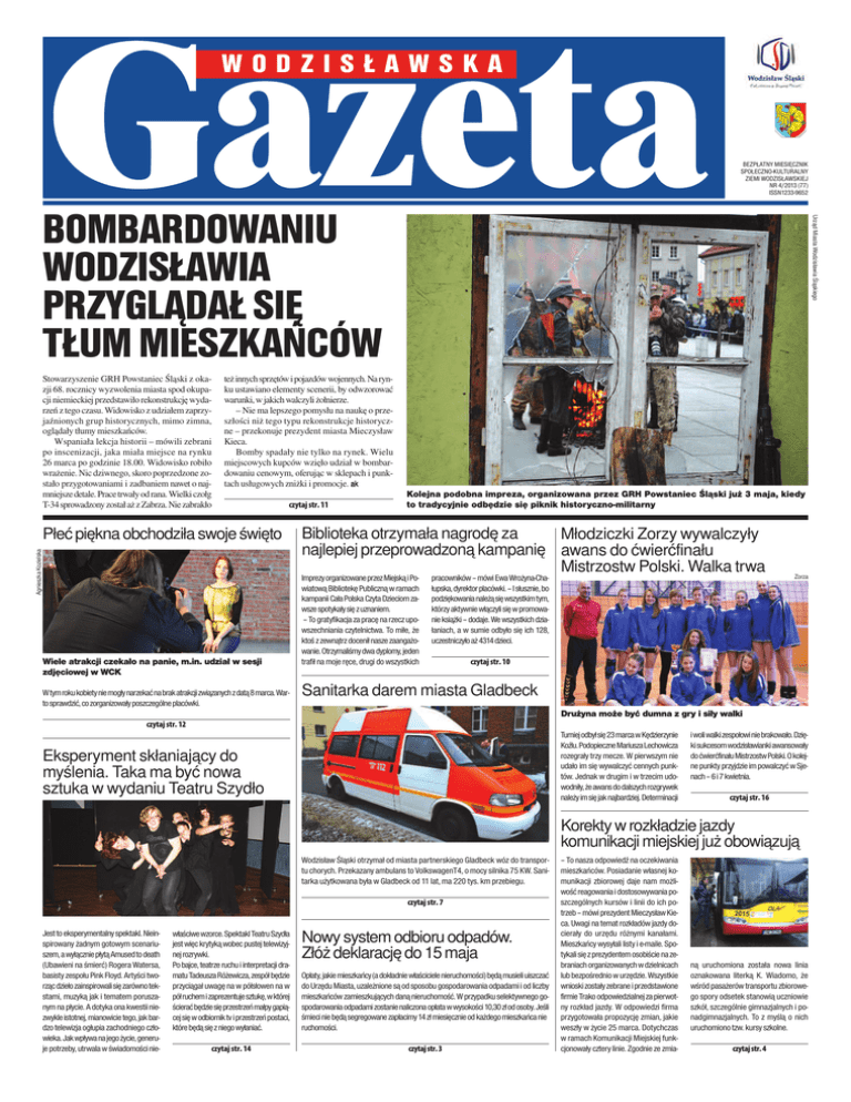 WODZISŁAWSKA BEZPłATNy MIESIęCZNIK SPOłECZNO-KULTURALNy ZIEMI WODZISłAWSKIEJ NR 4/2013 (77) ISSN1233-9652 Stowarzyszenie GRH Powstaniec Śląski z okazji 68. rocznicy wyzwolenia miasta spod okupacji niemieckiej przedstawiło rekonstrukcję wydarzeń z tego czasu. Widowisko z udziałem zaprzyjaźnionych grup historycznych, mimo zimna, oglądały tłumy mieszkańców. Wspaniała lekcja historii – mówili zebrani po inscenizacji, jaka miała miejsce na rynku 26 marca po godzinie 18.00. Widowisko robiło wrażenie. Nic dziwnego, skoro poprzedzone zostało przygotowaniami i zadbaniem nawet o najmniejsze detale. Prace trwały od rana. Wielki czołg T-34 sprowadzony został aż z Zabrza. Nie zabrakło Urząd Miasta Wodzisławia Śląskiego BOMBARDOWANIU WODZISŁAWIA PRZYGLĄDAŁ SIĘ TŁUM MIESZKAŃCÓW też innych sprzętów i pojazdów wojennych. Na rynku ustawiano elementy scenerii, by odwzorować warunki, w jakich walczyli żołnierze. – Nie ma lepszego pomysłu na naukę o przeszłości niż tego typu rekonstrukcje historyczne – przekonuje prezydent miasta Mieczysław Kieca. Bomby spadały nie tylko na rynek. Wielu miejscowych kupców wzięło udział w bombardowaniu cenowym, oferując w sklepach i punktach usługowych zniżki i promocje. ak czytaj str. 11 Agnieszka Kozielska Płeć piękna obchodziła swoje święto Wiele atrakcji czekało na panie, m.in. udział w sesji zdjęciowej w WCK Wtym roku kobiety nie mogły narzekać nabrak atrakcji związanych zdatą8 marca. Warto sprawdzić, co zorganizowały poszczególne placówki. Kolejna podobna impreza, organizowana przez GRH Powstaniec Śląski już 3 maja, kiedy to tradycyjnie odbędzie się piknik historyczno-militarny Biblioteka otrzymała nagrodę za Młodziczki Zorzy wywalczyły najlepiej przeprowadzoną kampanię awans do ćwierćfinału Mistrzostw Polski. Walka trwa Imprezy organizowane przez Miejską iPowiatową Bibliotekę Publiczną w ramach kampanii Cała Polska Czyta Dzieciom zawsze spotykały się z uznaniem. – To gratyfikacja za pracę na rzecz upowszechniania czytelnictwa. To miłe, że ktoś z zewnątrz docenił nasze zaangażowanie. Otrzymaliśmy dwa dyplomy, jeden trafił na moje ręce, drugi do wszystkich Zorza pracowników – mówi Ewa Wrożyna-Chałupska, dyrektor placówki. – I słusznie, bo podziękowania należą się wszystkim tym, którzy aktywnie włączyli się w promowanie książki – dodaje. We wszystkich działaniach, a w sumie odbyło się ich 128, uczestniczyło aż 4314 dzieci. czytaj str. 10 Sanitarka darem miasta Gladbeck Drużyna może być dumna z gry i siły walki czytaj str. 12 Turniej odbył się23 marca wKędzierzynie Koźlu. Podopieczne Mariusza Lechowicza rozegrały trzy mecze. W pierwszym nie udało im się wywalczyć cennych punktów. Jednak w drugim i w trzecim udowodniły, że awans dodalszych rozgrywek należy im się jak najbardziej. Determinacji Eksperyment skłaniający do myślenia. Taka ma być nowa sztuka w wydaniu Teatru Szydło iwoli walki zespołowi nie brakowało. Dzięki sukcesom wodzisławianki awansowały doćwierćfinału Mistrzostw Polski. Okolejne punkty przyjdzie im powalczyć w Sjenach – 6 i 7 kwietnia. czytaj str. 16 Korekty w rozkładzie jazdy komunikacji miejskiej już obowiązują Wodzisław Śląski otrzymał od miasta partnerskiego Gladbeck wóz do transpor tu chorych. Przekazany ambulans to VolkswagenT4, o mocy silnika 75 KW. Sanitarka użytkowana była w Gladbeck od 11 lat, ma 220 tys. km przebiegu. czytaj str. 7 Jest to eksperymentalny spektakl. Nieinspirowany żadnym gotowym scenariuszem, a wyłącznie płytą Amused to death (Ubawieni na śmierć) Rogera Watersa, basisty zespołu Pink Floyd. Artyści tworząc dzieło zainspirowali się zarówno tekstami, muzyką jak i tematem poruszanym na płycie. A dotyka ona kwestii niezwykle istotnej, mianowicie tego, jak bardzo telewizja ogłupia zachodniego człowieka. Jak wpływa na jego życie, generuje potrzeby, utrwala w świadomości nie- Nowy system odbioru odpadów. Złóż deklarację do 15 maja właściwe wzorce. Spektakl Teatru Szydła jest więc krytyką wobec pustej telewizyjnej rozrywki. Po bajce, teatrze ruchu i interpretacji dramatu Tadeusza Różewicza, zespół będzie przyciągał uwagę na w półsłowen na w pół ruchem izaprezentuje sztukę, wktórej ścierać będzie się przestrzeń małpy gapiącej się w odbiornik tv i przestrzeń postaci, które będą się z niego wyłaniać. Opłaty, jakie mieszkańcy (a dokładnie właściciele nieruchomości) będą musieli uiszczać do Urzędu Miasta, uzależnione są od sposobu gospodarowania odpadami i od liczby mieszkańców zamieszkujących daną nieruchomość. W przypadku selektywnego gospodarowania odpadami zostanie naliczona opłata w wysokości 10,30 zł od osoby. Jeśli śmieci nie będą segregowane zapłacimy 14 zł miesięcznie od każdego mieszkańca nie ruchomości. czytaj str. 14 czytaj str. 3 – To nasza odpowiedź na oczekiwania mieszkańców. Posiadanie własnej komunikacji zbiorowej daje nam możliwość reagowania i dostosowywania poszczególnych kursów i linii do ich potrzeb – mówi prezydent Mieczysław Kieca. Uwagi na temat rozkładów jazdy docierały do urzędu różnymi kanałami. Mieszkańcy wysyłali listy i e-maile. Spotykali się z prezydentem osobiście na zebraniach organizowanych w dzielnicach lub bezpośrednio w urzędzie. Wszystkie wnioski zostały zebrane i przedstawione firmie Trako odpowiedzialnej za pierwotny rozkład jazdy. W odpowiedzi firma przygotowała propozycję zmian, jakie weszły w życie 25 marca. Dotychczas w ramach Komunikacji Miejskiej funkcjonowały cztery linie. Zgodnie ze zmia- ną uruchomiona została nowa linia oznakowana literką K. Wiadomo, że wśród pasażerów transportu zbiorowego spory odsetek stanowią uczniowie szkół, szczególnie gimnazjalnych i ponadgimnazjalnych. To z myślą o nich uruchomiono tzw. kursy szkolne. czytaj str. 4 2 ratusz kwiecień 2013 nr 4 Pozn