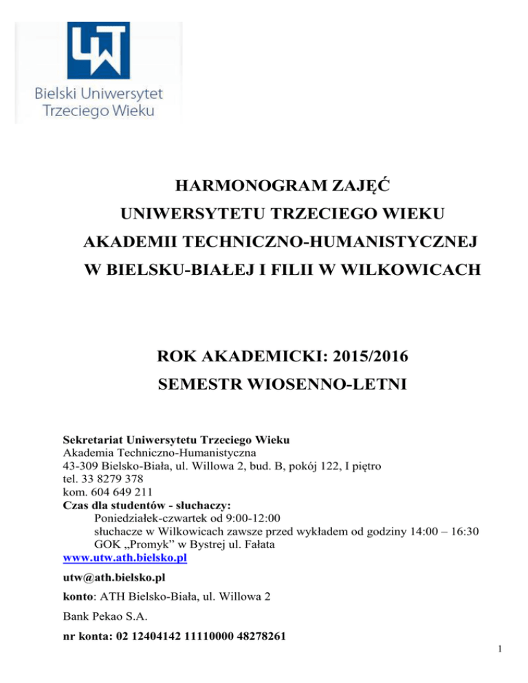 HARMONOGRAM ZAJĘĆ UNIWERSYTETU TRZECIEGO WIEKU AKADEMII TECHNICZNO-HUMANISTYCZNEJ W BIELSKU-BIAŁEJ I FILII W WILKOWICACH ROK AKADEMICKI: 2015/2016 SEMESTR WIOSENNO-LETNI Sekretariat Uniwersytetu Trzeciego Wieku Akademia Techniczno-Humanistyczna 43-309 Bielsko-Biała, ul. Willowa 2, bud. B, pokój 122, I piętro tel. 33 8279 378 kom. 604 649 211 Czas dla studentów - słuchaczy: Poniedziałek-czwartek od 9:00-12:00 słuchacze w Wilkowicach zawsze przed wykładem od godziny 14:00 – 16:30 GOK „Promyk” w Bystrej ul. Fałata www.utw.ath.bielsko.pl [email protected] konto: ATH Bielsko-Biała, ul. Willowa 2 Bank Pekao S.A. nr konta: 02 12404142 11110000 48278261 1 Semestr wiosenno-letni 2015/16 wykłady na UTW w Bielsku-Białej, aula LO nr 1 im. M. Kopernika ul. Listopadowa 70 (zawsze w środę od godz. 15.00-16.00) DATA TYTUŁ NAUKOWY IMIĘ I NAZWISKO WYKŁADOWCY TEMAT 2.03.2016 Prof. ATH dr hab. Ireneusz Gielata „Sienkiewiczowskie latawce” – o twórczości i biografii Sienkiewicza w stulecie pisarza 9.03.2016 Prof. dr hab. Tomasz Stępień Góry i literatura 16.03.2016 mgr Alicja Drobot Techniki masażu w walce z bólami kręgosłupa 23.03.2016 Dr Jacek Proszyk Liberalizm żydowski w Bielsku-Białej 30.03.2016 Dr Katarzyna Szoblik Po Ameryce Łacińskiej podróże małe i duże 6.04.2016 Nadkomisarz Policji Aleksandra Gęga Bezpieczeństwo seniora w miejscu zamieszkania i środowisku 13.04.2016 Mgr Mateusz Małysiewicz Senior w sieci 20.04.2016 Mgr Renata Morawska Teatr jako źródło wiedzy o człowieku 27.04.2016 Mec. Maria Sikora Elementy prawa spadkowego 4.05.2016 11.05.2016 Przedstawiciel Urzędu Miasta BB Dr med. Wojciech Pawłowski; dr med. Michał Białożyt 1.06.2016 8.06.2016 Nietrzymanie moczu u kobiet i mężczyzn; kamica moczowa-przyczyny, profilaktyka Piknik na „Wilczysku” organizowany przez samorząd 18.05.2016 25.05.2016 Nasze miasto Prof. dr hab. Henryk Klama Prof. dr hab. n. med. Monika Mikulska Prof. ATH dr hab. inż. Bożena Mrowiec 15.06.2016 Dr Katarzyna Piątek 22.06.2016 Mgr Józef Cegielski Dlaczego warto chronić Puszcze Białowieską Budowa anatomiczna serca w aspekcie schorzeń kardiologicznych Dlaczego leki staja się niebezpieczne dla środowiska Mechanizmy wywierania wpływu społecznego – teoria i praktyka Uroczystość XX- lecia UTW ATH 2 Semestr wiosenno-letni 2015/2016 WYKŁADY w Filii UTW ATH w Wilkowicach, Gminny Ośrodek Kultury „Promyk” w Bystrej ul. Fałata (zawsze we wtorek od godz. 15.00-16.00) DATA TYTUŁ NAUKOWY IMIĘ I NAZWISKO WYKŁADOWCY TEMAT 1.03.2016 Dr Katarzyna Szoblik Religia i religie współczesnej Ameryki Łacińskiej 8.03.2016 Prof. dr hab. Wojciech Gorczyca Kłamstwo historiozoficzne Lwa Tołstoja w „Wojnie i pokoju” 15.03.2016 Mgr Mateusz Małysiewicz Jestem obywatelem Unii Europejskiej 22.03.2016 Dr n. med. Iwona Petrulewicz-Salamon Cukrzyca- choroba człowieka i społeczeństwa 29.03.2016 Mgr Karolina Klimczak Teatr życia społecznego 5.04.2016 Nadkomisarz policji Aleksandra Gęga Bezpieczeństwo seniora w miejscu zamieszkania i środowisku 12.04.2016 Prof. ATH dr hab. inż. Jerzy Madej Katastrofy budowlane przyczyny i skutki 19.04.2016 Dr Andrzej Jaguś Jakość gleby-jakość życia 26.04.2016 Prof. Karol Węglarzy Różnice w jakości mięsa ryb słodkowodnych na przykładzie Karpia i Suma afrykańskiego 10.05.2016 Dr Ludwik Hejny Raj podatkowy 17.05.2016 Prof. ATH dr hab. inż. Bożena Mrowiec Dlaczego leki staja się niebezpieczne dla środowiska Piknik na „Wilczysku” organizowany przez samorząd 24.05.2016 31.05.2016 Dr inż. Grażyna Kuszmider Zanieczyszczenia w wodzie 7.06.2016 Prof. Ernest Zawada Dźwięk, światło w kolorowych formach Dr Maciej Kalarus Afryka w literaturze podróżniczej Mgr Józef Cegielski Zakończenie roku akademickiego 2015/16 14.06.2016 21.06.2016 3 HARMONOGRAM SEMINARIÓW UTW BIELSKO-BIAŁA semestr II - 2015/2016 Bielskie Centrum Kształcenia Ustawicznego i Praktycznego, Bielsko-Biała, ul. Piastowska, godz. 12.00-13.30 Seminarium mgr Anna Siuda-Gaczyńska Godzina 12:30-13:30 3.03.2016 Techniki pamięciowe 7.04.2016 Popraw swój wzrok 5.05.2016 Dlaczego oddech jest tak ważny 2.06.2016 Kinezjologia edukacyjna Seminarium mgr Marzena Rojek 10.03.2016 Dieta dobra dla stawów-wpływ żywienia na stan układu kostno-stawowego 14.04.2016 Mity kontra fakty- weryfikacja popularnych wskazówek żywieniowych rozpowszechnionych przez środki masowego przekazu 12.05.2016 Żywienie w chorobach tarczycy 9.06.2016 Niedożywienie- realne zagrożenie dla zdrowia w wieku podeszłym Seminarium mgr Aleksandra Kos 24.03.2016 Oczyszczanie i odkwaszanie organizmu według zasad Makrobiotyki 21.04.2016 Równowaga kwasowo – zasadowa i jej znaczenie dla zdrowia człowieka 19.05.2016 16.06.2016 Wspomaganie pracy narządów wewnętrznych człowieka poprzez aktywność, oddychanie i zrównoważone odżywianie Talerz makrobiotyczny – podstawowe zasady zrównoważonego przygotowywania posiłków dla osób po 60 roku życia 4 HARMONOGRAM SEMINARIÓW UTW FILIA WILKOWICE semestr II – 2015/16 Biblioteka w Mesznej, Meszniański Ośrodek Kultury „Nad Borami”, ul. Handlowa 16, poniedziałek, godz. 11.00 -12.00 Seminarium mgr Teresa Gaczyńska 7.03.2016 Odcienie emocji i uczuć; nazywanie ich 4.04.2016 9.05.2016 6.06.2016 Wpływ emocji pozytywnych i negatywnych na zachowanie człowieka Problemy z osobowością w starszym wieku Biblioterapia-książki, które pomagają; jak z nich korzystać Seminarium mgr Anna Konderla-Zając 14.03.2016 Diagnoza Refleksologiczna 11.04.2016 Masaż stóp 16.05.2016 13.06.2016 Tybetański masaż głowy i karku Automasaż w wybranych dolegliwościach Seminarium mgr inż. Anna Pietraszko Przygotowanie gleby do siewu i sadzenia roślin ogrodniczych. Dobór gatunków i odmian do warunków klimatycznych i glebowych. Przetwórstwo domowe. Wymiana doświadczeń Wycieczka do warsztatów Szkolnych przy zespole Szkół Ogrodniczych w 18.04.2016 Bielsku-Białej. Warsztaty ogr