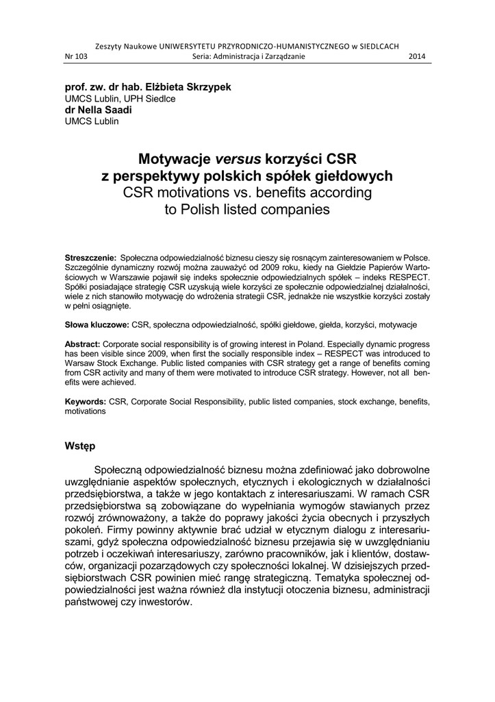 Nr 103 Zeszyty Naukowe UNIWERSYTETU PRZYRODNICZO-HUMANISTYCZNEGO w SIEDLCACH Seria: Administracja i Zarządzanie 2014 prof. zw. dr hab. Elżbieta Skrzypek UMCS Lublin, UPH Siedlce dr Nella Saadi UMCS Lublin Motywacje versus korzyści CSR z perspektywy polskich spółek giełdowych CSR motivations vs. benefits according to Polish listed companies Streszczenie: Społeczna odpowiedzialność biznesu cieszy się rosnącym zainteresowaniem w Polsce. Szczególnie dynamiczny rozwój można zauważyć od 2009 roku, kiedy na Giełdzie Papierów Wartościowych w Warszawie pojawił się indeks społecznie odpowiedzialnych spółek – indeks RESPECT. Spółki posiadające strategię CSR uzyskują wiele korzyści ze społecznie odpowiedzialnej działalności, wiele z nich stanowiło motywację do wdrożenia strategii CSR, jednakże nie wszystkie korzyści zostały w pełni osiągnięte. Słowa kluczowe: CSR, społeczna odpowiedzialność, spółki giełdowe, giełda, korzyści, motywacje Abstract: Corporate social responsibility is of growing interest in Poland. Especially dynamic progress has been visible since 2009, when first the socially responsible index – RESPECT was introduced to Warsaw Stock Exchange. Public listed companies with CSR strategy get a range of benefits coming from CSR activity and many of them were motivated to introduce CSR strategy. However, not all benefits were achieved. Keywords: CSR, Corporate Social Responsibility, public listed companies, stock exchange, benefits, motivations Wstęp Społeczną odpowiedzialność biznesu można zdefiniować jako dobrowolne uwzględnianie aspektów społecznych, etycznych i ekologicznych w działalności przedsiębiorstwa, a także w jego kontaktach z interesariuszami. W ramach CSR przedsiębiorstwa są zobowiązane do wypełniania wymogów stawianych przez rozwój zrównoważony, a także do poprawy jakości życia obecnych i przyszłych pokoleń. Firmy powinny aktywnie brać udział w etycznym dialogu z interesariuszami, gdyż społeczna odpowiedzialność biznesu przejawia się w uwzględnianiu potrzeb i oczekiwań interesariuszy, zarówno pracowników, jak i klientów, dostawców, organizacji pozarządowych czy społeczności lokalnej. W dzisiejszych przedsiębiorstwach CSR powinien mieć rangę strategiczną. Tematyka społecznej odpowiedzialności jest ważna również dla instytucji otoczenia biznesu, administracji państwowej czy inwestorów. 12 E. Skrzypek, N. Saadi Zainteresowanie społeczną odpowiedzialnością biznesu wpisuje się w światowy trend widoczny szczególnie w Stanach Zjednoczonych czy zachodnich państwach europejskich, w których doświadczenie w zakresie CSR jest znacznie dłuższe niż w Polsce. Niemniej jednak waga CSR zaczęła rosnąć w polskich przedsiębiorstwach, a szczególną dynamikę zmian można zauważyć od 2009 roku, kiedy na Giełdzie Papierów Wartościowych w Warszawie odbyła się inauguracja pierwszego w Europie Środkowo-Wschodniej indeksu społecznie odpowiedzialnych spółek giełdowych – indeksu RESPECT. Spółki posiadające strategię CSR uzyskują wiele korzyści ze społecznie odpowiedzialnej działalności, wiele z nich stanowiło motywację do wdrożenia strategii CSR, jednakże nie wszystkie zostały w pełni osiągnięte. Celem artykułu jest skonfrontowanie motywacji i korzyści związanych ze strategią CSR w polskich spółkach giełdowych. Motywacje CSR Motywacje do prowadzenia społecznie odpowiedzialnej działalności mogą być oceniane pod kątem korzyści, które dana firma chce osiągnąć. Trudno uwierzyć, że większością przedsiębiorstw kierują jedynie przesłanki altruistyczne. Catherine Liston-Heyes i Gwen Certon twierdzą, że nieliczne firmy angażują się w działania CSR z pobudek czysto altruistycznych1. Rzeczywiście firmy dążą do tego, żeby osiągnąć zarówno korzyści własne, jak też pozytywnie wpływać na otoczenie firmy2. Strategia społecznej odpowiedzialności powinna stanowić płaszczyznę łączącą interesy ekonomiczne i społeczne zaangażowanych firm3. Przy czym CSR, motywowany wyłącznie interesem akcjonariuszy, jest określany strategiczną odpowiedzialnością społeczną. Przedsiębiorstwo zainteresowane tylko zwiększeniem zysku może wdrożyć praktykę komunikowaną jako działanie CSR i liczyć na zwiększenie zainteresowania jej produktami. Jednakże należy zauważyć, że takie podejście jest strategią maksymalizacji zysku motywowaną przez wymierne korzyści własne niż przez ideę społecznej odpowiedzialności4. Prezes firmy Philip Morris powiedział już w latach osiemdziesiątych XX wieku, że działania biznesowe muszą mieć sens społeczny, a działania społeczne muszą mieć sens biznesowy5. Ponadto przetrwanie przedsiębiorstwa zależy również od tego, czy dostarcza społeczeństwu wartościowych produktów bądź usług. Przedsiębiorstwa, jak też inne organizacje społeczne, stanowią nieodłączną część społeczeństwa. Żeby przetrwać i się rozwijać, muszą na nim polegać6. Można powiedzieć, że społe- C. Liston-Heyes, G. Ceton, Corporate Social Performance and Politics, Do Liberals Do More?, “The Journal of Corporate Citizenship”, 2007, 25, Spring, s. 96. 2 T. Szot-Gabryś, Koncepcja rachunku kosztów i korzyści w rachunkowości odpowiedzialności społecznej przedsiębiorstwa, Difin, Warszawa 2013, s. 37. 3 E. Skrzypek, Społeczna odpowiedzialność biznesu oraz zrównoważony rozwój jako wyznaczniki nowoczesnego zarządzania, [w:] M. Cisek, B. Domańska-Szaruga [red.], Zrównoważony rozwój przedsiębiorstw, Studio Emka, Warszawa 2010, s. 146. 4 D. Baron, Private Politics, Corporate Social Responsibility and Integrated Strategy, “Journal of Economics and Management Strategy”, 2001, 10, s. 9. 5 T. Mescon, D. Tilson, Corporate Philanthropy: A Strategic Approach to the Bottom-Line, “California Management Review”, 1987, 24(2), s. 50. 6 P. Sethi, A Conceptual Framework 
