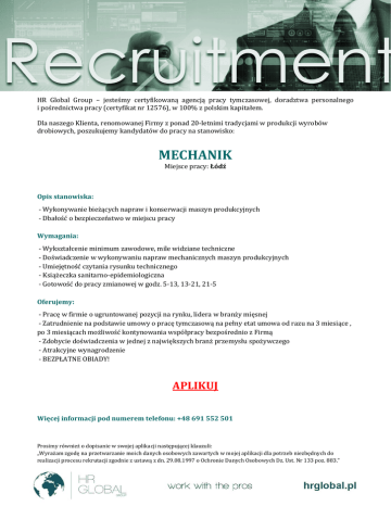 HR Global Group – jesteśmy certyfikowaną agencją pracy tymczasowej, doradztwa personalnego i pośrednictwa pracy (certyfikat nr 12576), w 100% z polskim kapitałem. Dla naszego Klienta, renomowanej Firmy z ponad 20-letnimi tradycjami w produkcji wyrobów drobiowych, poszukujemy kandydatów do pracy na stanowisko: MECHANIK Miejsce pracy: Łódź Opis stanowiska: - Wykonywanie bieżących napraw i konserwacji maszyn produkcyjnych - Dbałość o bezpieczeństwo w miejscu pracy Wymagania: - Wykształcenie minimum zawodowe, mile widziane techniczne - Doświadczenie w wykonywaniu napraw mechanicznych maszyn produkcyjnych - Umiejętność czytania rysunku technicznego - Książeczka sanitarno-epidemiologiczna - Gotowość do pracy zmianowej w godz. 5-13, 13-21, 21-5 Oferujemy: - Pracę w firmie o ugruntowanej pozycji na rynku, lidera w branży mięsnej - Zatrudnienie na podstawie umowy o pracę tymczasową na pełny etat umowa od razu na 3 miesiące , po 3 miesiącach możliwość kontynowania współpracy bezpośrednio z Firmą - Zdobycie doświadczenia w jednej z największych branż przemysłu spożywczego - Atrakcyjne wynagrodzenie - BEZPŁATNE OBIADY! APLIKUJ Więcej informacji pod numerem telefonu: +48 691 552 501 Prosimy również o dopisanie w swojej aplikacji następującej klauzuli: „Wyrażam zgodę na przetwarzanie moich danych osobowych zawartych w mojej aplikacji dla potrzeb niezbędnych do realizacji procesu rekrutacji zgodnie z ustawą z dn. 29.08.1997 o Ochronie Danych Osobowych Dz. Ust. Nr 133 poz. 883.”