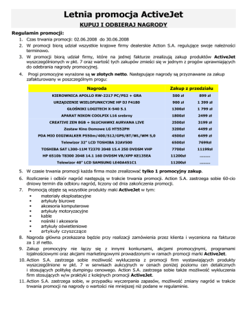 Letnia promocja ActiveJet KUPUJ I ODBIERAJ NAGRODY Regulamin promocji: 1. Czas trwania promocji: 02.06.2008 do 30.06.2008 2. W promocji biorą udział wszystkie krajowe firmy dealerskie Action S.A. regulujące swoje naleŜności terminowo. 3. W promocji biorą udział firmy, które na jednej fakturze zrealizują zakup produktów ActiveJet wyszczególnionych w pkt. 7 oraz wartość tych zakupów zmieści się w jednym z progów uprawniających do odebrania nagrody promocyjnej. 4. Progi promocyjne wyraŜone są w złotych netto. Następujące nagrody są przyznawane za zakup zafakturowany w poszczególnym progu: Nagroda Zakup z przedziału KIEROWNICA APOLLO RW-2217 PC/PS2 + GRA 500 zł 899 zł URZĄDZENIE WIELOFUNKCYJNE HP DJ F4180 900 zł 1 399 zł GŁOŚNIKI LOGITECH X-540 5.1 1300zł 1 799 zł APARAT NIKON COOLPIX L16 srebrny 1800zł 2499 zł CREATIVE ZEN 8GB + SŁUCHAWKI AURVANA LIVE 2500zł 3199 zł Zestaw Kino Domowe LG HT552PH 3200zł 4499 zł PDA MIO DIGIWALKER P550m/400/512/GPS/BT/WL/WM 5,0 4500zł 6499 zł Telewizor 32" LCD TOSHIBA 32AV500 6500zł 7699zł TOSHIBA SAT L300-11M T2370 2048 15.4 250 DVDSM VHP 7700zł 11199zł HP 6510b T8300 2048 14.1 160 DVDSM VB/XPP KE135EA 11200zł ......... Telewizor 40" LCD SAMSUNG LE40A451C1 11200zł ......... 5. W czasie trwania promocji kaŜda firma moŜe zrealizować tylko 1 promocyjny zakup. 6. Rozliczenie i odbiór nagród następują w trakcie trwania promocji. Action S.A. zastrzega sobie 60-cio dniowy termin dla odbioru nagród, liczony od dnia zakończenia promocji. 7. Promocją objęte są wszystkie produkty maki ActiveJet w tym: materiały eksploatacyjne artykuły biurowe akcesoria komputerowe artykuły motoryzacyjne kable nośniki i akcesoria artykuły oświetleniowe artykuły czyszczące 8. Nagroda główna przekazana będzie przy realizacji zamówienia przez klienta i wyceniona na fakturze za 1 zł netto. 9. Zakup promocyjny nie łączy się z innymi konkursami, akcjami promocyjnymi, programami lojalnościowymi oraz akcjami marketingowymi prowadzonymi w ramach promocji marki ActiveJet. 10. Action S.A. zastrzega sobie moŜliwość wykluczenia z promocji firm wystawiających produkty wyszczególnione w pkt. 7 w serwisach aukcyjnych w cenach poniŜej poziomu cen detalicznych i stosujących politykę dumpingu cenowego. Action S.A. zastrzega sobie takŜe moŜliwość wykluczenia firm stosujących w/w praktyki z kolejnych promocji ActiveJet. 11. Action S.A. zastrzega sobie, w przypadku wyczerpania zapasów, moŜliwość zmiany nagród w trakcie trwania promocji na nagrody o wartości nie mniejszej niŜ podane w regulaminie.