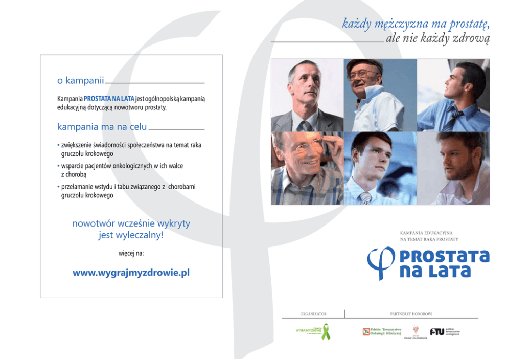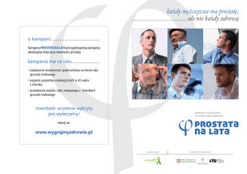 każdy mężczyzna ma prostatę, ale nie każdy zdrową o kampanii Kampania Prostata na lata jest ogólnopolską kampanią edukacyjną dotyczącą nowotworu prostaty. kampania ma na celu • zwiększenie świadomości społeczeństwa na temat raka gruczołu krokowego • wsparcie pacjentów onkologicznych w ich walce z chorobą • przełamanie wstydu i tabu związanego z chorobami gruczołu krokowego nowotwór wcześnie wykryty jest wyleczalny! Kampania Edukacyjna na temat raka prostaty prostata na lata więcej na: www.wygrajmyzdrowie.pl ORGANIZATOR PARTNERZY HONOROWI W społeczeństwie pokutuje mit, że prostata to choroba albo stan chorobowy. Tymczasem jest ona jednym z narządów ciała mężczyzny. prostata Stercz/gruczoł krokowy (popularnie zwany prostatą) to gruczoł wielkości kasztana, umiejscowiony poniżej pęcherza moczowego. Pełni funkcje moczowo-płciowe. Jego wydzielina wchodzi w skład spermy i umożliwia plemnikom poruszanie się. Stercz ma około 3-3,5 cm szerokości i może ważyć około 15-20 g, zależnie od budowy mężczyzny. Po urodzeniu stercz jest wielkości groszku i stopniowo wzrasta, najszybciej w okresie dojrzewania. Następnie tempo wzrostu maleje. Mniej więcej w wieku 30 lat narząd osiąga wielkość dojrzałą – typową dla dorosłego mężczyzny. Gruczoł krokowy mężczyzn w wieku od 30 do 50 lat nie zmienia zwykle swojej wielkości. Po 50. roku życia dochodzi zwykle do jego powiększenia, co może być wynikiem procesów starzenia lub zmian w równowadze hormonalnej. rak prostaty Rak prostaty jest to jeden z najczęstszych nowotworów u mężczyzn po 50. roku życia. W Polsce choroba ta zajmuje w populacji męskiej 3 miejsce wśród przyczyn zgonów na choroby nowotworowe. Mikroskopowe elementy tego nowotworu spotyka się już w wieku około 50 lat u prawie 30% mężczyzn i aż u 80% mężczyzn w wieku lat 80. Guz ten rozwija się stosunkowo powoli, niekiedy bezobjawowo. Początkowo objawy mogą sugerować łagodny rozrost stercza, dlatego tak ważne jest wykrycie go w fazie, w której można leczyć go radykalnie i skutecznie. U znacznego odsetka pacjentów, zwłaszcza chorych na nowotwór o niskim stopniu zaawansowania, choroba przebiega bezobjawowo. Wczesnemu wykrywaniu służyć może regularne badanie gruczołu krokowego u urologa. Co najmniej raz w roku zaleca się je osobom, które przekroczyły 50. rok życia lub wcześniej, w przypadku pojawienia się objawów zaburzeń w oddawaniu moczu, lub wówczas, gdy w najbliższej rodzinie (ojciec, brat) odnotowano zachorowanie na raka stercza w młodym wieku. objawy Prawdopodobieństwo zachorowania na raka gruczołu krokowego wzrasta po 50. roku życia. Rak prostaty we wczesnej fazie nie powoduje żadnych dolegliwości. Wykrycie go w tej początkowej, bezobjawowej fazie przez urologa, gwarantuje możliwość zastosowania radykalnej terapii zwiększającej prawdopodobieństwo pełnego wyleczenia. Dopiero zaawansowany rak powoduje dolegliwości podobne do tych, które obserwuje się również w łagodnym rozroście gruczołu krokowego. Wielu mężczyzn odwleka wizytę u urologa. Spowodowane jest to zarówno skrępowaniem, jak i brakiem podstawowej wiedzy na temat chorób stercza oraz możliwości ich leczenia. Należą do nich: • częstsze oddawanie moczu w nocy i w dzień, • parcie na mocz typu naglącego, • zaleganie moczu w pęcherzu, czy też całkowite zatrzymanie moczu. W postaci rozsianej mogą dołączyć się objawy bólowe, związane z przerzutami do układu kostnego. czynniki ryzyka badania • otyłość, • siedzący tryb życia, • wstrzemięźliwość płciowa, • stany zapalne dróg moczowych, • czynniki genetyczne. Bardzo ważne jest badanie stercza przez urologa (DRE czyli badanie per rectum, polegające na ocenie stanu gruczołu palcem przez odbytnicę). Umożliwia ono ocenę wielkości gruczołu krokowego oraz ewentualne wczesne wykrycie zmian w obrębie stercza. Jest to badanie podstawowe, któremu mężczyźni powinni być poddawani raz w roku. Badanie rektalne najszybciej i stosunkowo bezbłędnie wykrywa miejscowe zmiany stercza, o różnym charakterze. Objawy rozrostu stercza częściej rozpoznaje się u mężczyzn: • spożywających dużą ilość mięsa, tłuszczu i małą ilość warzyw, • spożywających nadmierne ilości mleka, • s tosujących używki powodujące obrzęk gruczołu krokowego, w tym alkohol (zwłaszcza wysokoprocentowy), • s pożywających nadmierną ilość ostrych przypraw, • prowadzących stresujący tryb życia. Kolejnym krokiem w przypadku podejrzenia raka stercza lub określenia grupy ryzyka jest badanie krwi, w celu oznaczenia czynności nerek i badanie stężenia markera nowotworowego charakterystycznego dla raka stercza – tzw. antygenu PSA. W surowicy krwi PSA ulega wzrostowi w stanach zapalnych, głównie w raku stercza. Podwyższone stężenie PSA jest ważnym objawem i może służyć, w przypadku potwierdzenia diagnozy nowotworowej, do monitorowania postępu choroby. Dzięki temu możliwe jest wykrycie choroby w jej bezobjawowej fazie. Umożliwia to wczesne, najlepiej rokujące leczenie raka, zanim pojawią się przerzuty do węzłów chłonnych i kości. Stopień opróżnienia pęcherza i obecność wcześniej opisanych powikłań można przeanalizować w oparciu o ultrasonografię (badanie ultrasonograficzne umożliwia ocenę nerek, pęcherza moczowego, wymiarów stercza i objętości moczu, jaka pozostaje w pęcherzu po zakończeniu jego oddawania). Dokładne pomiary stercza oraz jego budowę można jedynie ocenić w ultrasonografi cznym badaniu przezodbytniczym (TRUS). leczenie W leczeniu raka gruczołu krokowego, w zależności od stopnia zaawansowania oraz dodatkowych czynników określanych przez lekarza, możemy stosować: • leczenie chirurgiczne, • radioterapię, • hormonoterapię, • chemioterapię. W niektórych, uzasadnionych wypadkach można również wyłącznie obserwować pacjenta aby podjąć 