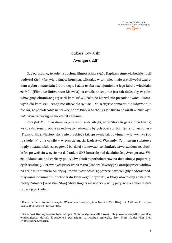 Creatio Fantastica PL ISSN: 2300-2514 R. XII, 2016, nr 2 (53) Łukasz Kowalski Avengers 2.5 Gdy ogłoszono, że kolejna odsłona filmowych przygód Kapitana Ameryki będzie nosić podtytuł Civil War, wielu fanów komiksu, wliczając w to mnie, miało wątpliwości względem wyboru materiału źródłowego. Każda osoba zaznajomiona z jego fabułą wiedziała, że MCU (Filmowe Uniwersum Marvela) na chwilę obecną nie jest tak duże, aby w pełni udźwignąć ekranizację tej serii komiksów1. Fakt, że Marvel nie posiadał dwóch kluczowych dla komiksu licencji nie ułatwiało sytuacji. Na szczęście samo studio udowodniło nie raz, że potrafi robić naprawdę dobre kino, a Anthony i Joe Russo pokazali w Zimowym żołnierzu, że zasługują na kredyt zaufania. Początek Kapitana Ameryki przenosi nas do Afryki, gdzie Steve Rogers (Chris Evans) wraz z drużyną próbuje przechwycić jednego z byłych operatorów Hydry: Crossbonesa (Frank Grillo). Niestety akcja nie przebiega tak sprawnie jak powinna i w jej wyniku (po raz kolejny) giną cywile – w tym delegacja królestwa Wakandy. Tym razem światowe rządy postanawiają zareagować bardziej stanowczo, co skutkuje stworzeniem rezolucji, która po wejściu w życie ma dać radzie ONZ kontrolę nad działalnością Avengersów. Wizja oddania się pod rozkazy polityków dzieli superbohaterów na dwa obozy: popierających rezolucję, kierowanych przez Irona Mana (Robert Downey Jr.), oraz jej przeciwników na czele z Kapitanem Ameryką. Podział wzmacnia się jeszcze bardziej, gdy podczas podpisywania dokumentu dochodzi do krwawego incydentu, o który obwiniony zostaje Zimowy Żołnierz (Sebastian Stan). Steve Rogers nie wierzy w winę przyjaciela z dzieciństwa i rusza jego śladem. Recenzja filmu: Kapitan Ameryka: Wojna bohaterów [Captain America: Civil War]. reż. Anthony Russo, Joe Russo, USA: Marvel Studios 2016 Seria Civil War wydawana była od lipca 2006 do stycznia 2007 roku i obejmowała wszystkie komiksy wydawnictwa Marvel. Kluczowymi postaciami są Kapitan Ameryka, Iron Man, Spider-Man oraz Fantastyczna Czwórka. 1 1 Pierwszą rzeczą, jaka rzuca się w oczy, jest skala wydarzeń przedstawianych w filmie. Większość z tego, co widzimy, nie jest tak spektakularna jak unoszące się w powietrzu miasto, a mimo to nie mniej brzemienne w skutkach. Pod tym względem jest to dosłownie wypadkowa Czasu Ultrona i Zimowego żołnierza. Bardzo trudno nazwać też Wojnę bohaterów samodzielnym tytułem o Kapitanie Ameryce, gdyż rozmach oraz zaangażowanie całej plejady bohaterów sugeruje coś zgoła innego: Avengers 2.5. Fabuła przenosi nas z jednego zakątka planety na drugi, odzwierciedlając zasięg konsekwencji oglądanych wydarzeń. Jednak pomijając polityczną parę, wprawiającą w ruch całą machinę, sama historia ma przede wszystkim wymiar osobisty i traktuje o przyjaźni oraz rodzinie – zarówno tej rodzonej, jak i z wyboru. Problemy z nią związane, w ten lub inny sposób, dotyczą prawie każdego pojawiającego się w filmie bohatera. Główny rozłam toczący się na linii Kapitan Ameryka – Iron Man jest bardzo dobrze przedstawiony i umotywowany. Scenarzystom udało się pokazać perspektywę obu stron, dzięki czemu w trakcie seansu wielu widzów może zmienić swoje nastawienie do poszczególnych frakcji, co nie do końca udało się w komiksowym pierwowzorze. Całość utrzymuje również poważniejszy ton, znany z poprzedniej części reżyserowanej przez braci Russo. Oczywistym jest, że konsekwencje sporu między liderami Avengers odbiły się również na współtworzonej przez nich drużynie. Kolejni członkowie muszą opowiedzieć się po jednej ze stron, niszcząc to, co przez tak długi czas tworzyli. Niestety z uwagi na ograniczony czas, jakim dysponowali twórcy, większość z nich stanowi ledwie tło dla głównych aktorów. Oczywiście każdy całkiem sprawnie odgrywa swoją rolę, ale większość widzów nie zapamięta ich szczególnie mocno. Wyjątek od tej reguły stanowią Spider-Man (Tom Holland) oraz Czarna Pantera (Chadwick Boseman). Dwaj debiutanci otrzymali całkiem sporo czasu ekranowego. Z owej pary mieszane uczucia budzi T'Challa. Do samych scen z jego zamaskowanym alter ego nie można mieć już żadnych zastrzeżeń, jednak w swoim codziennym wcieleniu działa trochę zbyt irracjonalnie i impulsywnie, przez co stoi w mocnym kontraście do pozostałych bohaterów. Zupełnie inaczej ma się sprawa z Peterem Parkerem. Jest to jego najlepsze filmowe wcielenie, jakie do tej pory oglądaliśmy. Oprócz tego w genialny sposób równoważy poważny ton Wojny bohaterów, dzięki czemu obraz jest dużo bardziej przystępny dla szerszego grona odbiorców. 2 Niemrawo wypada również jeden z głównych architektów wydarzeń, czyli Zemo. Nie można powiedzieć złego słowa o grze Daniela Brühla, gdyż jest na wysokim poziomie, jednak sama postać oraz jej działanie zdają się zbędne. Większość wydarzeń jakie oglądamy mogłaby mieć miejsce bez ingerencji komiksowego adwersarza Steva Rogersa2. Choć sama postać Zemo daje dużo możliwości w przyszłych filmowych projektach Marvela, tutaj ewidentnie został on wciśnięty na siłę. Mimo bardzo osobistego charakteru filmu ilość pościgów, większych i mniejszych potyczek jest ogromna, a ich poziom powinien usatysfakcjonować praktycznie każdego. Od pierwszych minut seansu akcja jest bardzo intensywna. Nie ma nawet chwili, w której można się nudzić. Każda z scena jest bardzo dobrze przemyślana i zrealizowana zarówno pod względem choreografii, jak i efektów specjalnych. Praca kamery oraz montaż pozwalają praktycznie poczuć się częścią owych batalii. Kolejne sceny akcji bardzo zgrabnie przeplatają się ze spokojniejszymi momentami – dzięki czemu nie męczą widza. Pod tym względem całość jest bardzo dobrze zbalansowana. Jedyną rzeczą, która może zmartwić widzów, szczególnie w odniesieniu do zbliżając