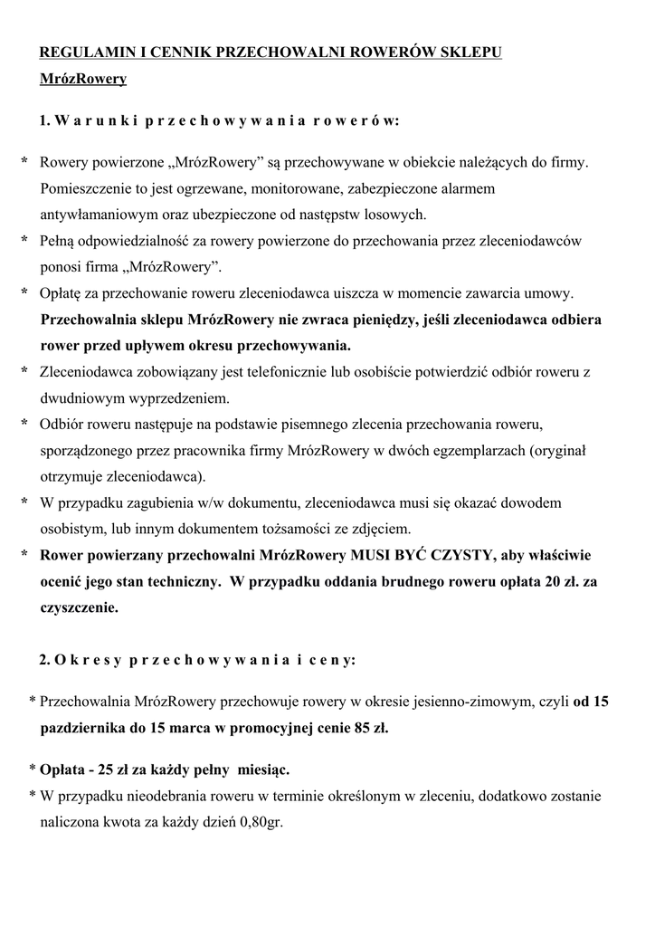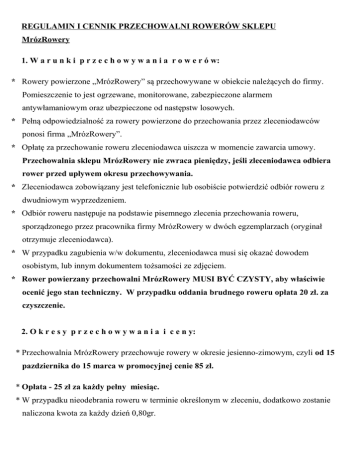 REGULAMIN I CENNIK PRZECHOWALNI ROWERÓW SKLEPU MrózRowery 1. W a r u n k i p r z e c h o w y w a n i a r o w e r ó w: * Rowery powierzone „MrózRowery” są przechowywane w obiekcie należących do firmy. Pomieszczenie to jest ogrzewane, monitorowane, zabezpieczone alarmem antywłamaniowym oraz ubezpieczone od następstw losowych. * Pełną odpowiedzialność za rowery powierzone do przechowania przez zleceniodawców ponosi firma „MrózRowery”. * Opłatę za przechowanie roweru zleceniodawca uiszcza w momencie zawarcia umowy. Przechowalnia sklepu MrózRowery nie zwraca pieniędzy, jeśli zleceniodawca odbiera rower przed upływem okresu przechowywania. * Zleceniodawca zobowiązany jest telefonicznie lub osobiście potwierdzić odbiór roweru z dwudniowym wyprzedzeniem. * Odbiór roweru następuje na podstawie pisemnego zlecenia przechowania roweru, sporządzonego przez pracownika firmy MrózRowery w dwóch egzemplarzach (oryginał otrzymuje zleceniodawca). * W przypadku zagubienia w/w dokumentu, zleceniodawca musi się okazać dowodem osobistym, lub innym dokumentem tożsamości ze zdjęciem. * Rower powierzany przechowalni MrózRowery MUSI BYĆ CZYSTY, aby właściwie ocenić jego stan techniczny. W przypadku oddania brudnego roweru opłata 20 zł. za czyszczenie. 2. O k r e s y p r z e c h o w y w a n i a i c e n y: * Przechowalnia MrózRowery przechowuje rowery w okresie jesienno-zimowym, czyli od 15 pazdziernika do 15 marca w promocyjnej cenie 85 zł. * Opłata - 25 zł za każdy pełny miesiąc. * W przypadku nieodebrania roweru w terminie określonym w zleceniu, dodatkowo zostanie naliczona kwota za każdy dzień 0,80gr. * Na życzenie klienta możemy odebrać lub dostarczyć odpłatnie rower pod wskazany przez zleceniodawcę adres. Koszt transportu do klienta w granicach administracyjnych miasta POZNAŃ wynosi 15 zł 3. Dodatkowy Serwis a. Przechowanie roweru + serwis podstawowy obejmujący: pompowanie kół, regulację przerzutek i hamulców, czyszczenie i smarowanie łańcucha, naoliwianie części regulujących przerzutki , eliminowanie luzów kierownicy , kół i korby , centrowanie kół – cena promocyjna 120 zł b. Przechowanie roweru + serwis kompleksowy obejmuje serwis podstawowy plus: czyszczenie pancerzy hamulców i przerzutek, wymiana smaru w piastach kół, sterach kierownicy, osi suportu - cena promocyjna 165 zł. 4. I n f o r m a c j e d o d a t k o w e * Każdy rower w przechowalni posiada swoją kartę informacyjną zawierającą: model, dane właściciela, szacunkową wartość, opis ważniejszych komponentów, stan techniczny. * Adres: Sklep i serwis rowerowy MrózRowery ul Półwiejska 28 , 61-888 Poznań, * telefon: 516-794-897 , e-mail [email protected] * Godziny otwarcia: od poniedziałku do piątku w godz. 10-18, sobota godz. 10-14.