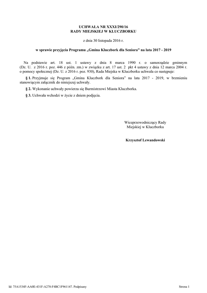 UCHWAŁA NR XXXI/290/16 RADY MIEJSKIEJ W KLUCZBORKU z dnia 30 listopada 2016 r. w sprawie przyjęcia Programu „Gmina Kluczbork dla Seniora” na lata 2017 - 2019 Na podstawie art. 18 ust. 1 ustawy z dnia 8 marca 1990 r. o samorządzie gminnym (Dz. U. z 2016 r. poz. 446 z późn. zm.) w związku z art. 17 ust. 2 pkt 4 ustawy z dnia 12 marca 2004 r. o pomocy społecznej (Dz. U. z 2016 r. poz. 930), Rada Miejska w Kluczborku uchwala co następuje: § 1. Przyjmuje się Program „Gmina Kluczbork dla Seniora” na lata 2017 - 2019, w brzmieniu stanowiącym załącznik do niniejszej uchwały. § 2. Wykonanie uchwały powierza się Burmistrzowi Miasta Kluczborka. § 3. Uchwała wchodzi w życie z dniem podjęcia. Wiceprzewodniczący Rady Miejskiej w Kluczborku Krzysztof Lewandowski Id: 75A1534F-AA0E-431F-A278-F4BC1F961147. Podpisany Strona 1 Załącznik do Uchwały Nr XXXI/290/16 Rady Miejskiej w Kluczborku z dnia 30 listopada 2016 r. PROGRAM GMINA KLUCZBORK DLA SENIORA NA LATA 2017 - 2019 WSTĘP CEL PROGRAMU: Godne starzenie się poprzez aktywność społeczną i poprawę jakości życia. REALIZATORZY PROGRAMU ZASADY FINANSOWANIA ORAZ KOSZTY PROGRAMU WSTĘP Zmiany demograficzne zachodzące w kraju, województwie Opolskim i gminie Kluczbork, stawiają przed samorządami różnych szczebli olbrzymie wyzwania. Kształtowanie wspólnej, pomyślnej przyszłości, wymaga partnerstwa i współdziałania osób w każdym wieku. Seniorzy wymagają działań wspierających proces aktywnego starzenia się, gdyż dynamika starzenia się społeczeństwa jest coraz większa. W 2011 roku, blisko 176 tysięcy mieszkańców Opolszczyzny, to jest 17,3 % ogółu ludności było w wieku poprodukcyjnym, w tym czasie średnia krajowa wynosiła 16,9 %. Natomiast w Gminie Kluczbork grupa osób w wieku poprodukcyjnym stanowiła ok. 18 % ogółu mieszkańców. Szacuje się że w roku 2035, osób w wieku poprodukcyjnym będzie 259 tysięcy, to jest 28,9 % mieszkańców województwa. Program „Gmina Kluczbork dla Seniora”, zakłada włączenie jednostek organizacyjnych, instytucji kultury, sektora organizacji pozarządowych oraz firm prywatnych do działań służących na rzecz poprawy jakości życia i aktywizacji seniorów. Instytucje i stowarzyszenia realizują bardzo wiele ważnych dla seniorów funkcji i potrzeb. Warto promować te, które są szczególnie istotne dla osób w wieku 65+, tj: samokształcenie, poznawania środowiska, poszerzania wiedzy i umiejętności, aktywność kulturalna, wypełnienie wolnego czasu, utrzymywanie więzi towarzyskich, stymulacja psychiczna i fizyczna, gdyż wpływają na ich aktywności społeczną. Program jest skierowany do osób powyżej 65 roku życia, mieszkających w Gminie Kluczbork. Dzięki uczestniczeniu w programie, seniorzy będą mogli korzystać z promocji i ofert przygotowanych przez firmy i instytucje specjalnie z myślą o nich. Każdy mieszkaniec gminy i miasta, który ukończył 65 lat, będzie mógł przystąpić do programu poprzez złożenie wniosku aby otrzymać imienną kartę seniora. Korzystać z przygotowanych ofert, będzie można po okazaniu imiennej karty seniora wraz z dokumentem tożsamości np.: dowodem osobistym. Program „Gmina Kluczbork dla Seniora” na lata 2017 - 2019, obejmuje zadania wykraczające poza obligatoryjną działalność samorządu, niezdefiniowane w innych programach na rzecz rodziny – tworząc pakiet działań skierowanych do seniorów zamieszkałych na terenie Gminy Kluczbork. Udział w programie nie jest warunkowany sytuacją dochodową. Kryterium jest ukończenie 65 roku życia. W niniejszym Programie ujęte są także cele wynikające z Rządowego Programu na rzecz Aktywności Społecznej Osób Starszych na lata 2014–2020, dotyczące między innymi poprawy jakości i poziomu życia osób starszych oraz zagospodarowanie ich potencjału poprzez umożliwienie im aktywności społecznej. CEL PROGRAMU : Godne starzenie się poprzez aktywność społeczną i poprawę jakości życia. Id: 75A1534F-AA0E-431F-A278-F4BC1F961147. Podpisany Strona 1 Kontakt z innymi osobami oraz budowanie relacji ma pozytywny wpływ na poczucie bycia potrzebnym, kondycję zdrowotną, itd. Dlatego ważne jest włączenie osób starszych do społeczeństwa. Zadaniem profilaktyki w tym zakresie, jest wspieranie człowieka w prawidłowym rozwoju, aktywności i zdrowym życiu. Szeroko rozumiana profilaktyka, powinna rozpocząć się od zrozumienia uwarunkowań, które mają wpływa na aktywność społeczną osób starszych, wynikających z : - pogarszaniem się stanu zdrowia z upływem lat, - poczuciem osamotnienia i marginalizacji, - duże zaangażowanie w życie rodzinne – opieka nad wnukami, - niechęć do aktywności, wynikającą z fazy życia, jak i wcześniejszych doświadczeń życiowych, - niskie kompetencje cyfrowe lub ich brak, - pogorszenia sytuacji ekonomicznej w stosunku do ludności aktywnej zawodowo. Aktywne starzenie się to koncepcja zakładająca zapewnienie jednostce bycia możliwie jak najdłużej społecznie produktywną. Podtrzymywaniem więzi społecznych, komunikacji i edukacją wśród seniorów zajmują się w Kluczborku między innymi: Związek Emerytów i Rencistów czy Uniwersytet Trzeciego Wieku. Jednak w rzeczywistości społeczeństwa mobilnego, rozwoju Internetu i cyfryzacji, aktywność społeczna osób starszych, wymaga poprawy sytuacji w zakresie rozwarstwienia na poziomie rozwoju cyfrowego, tj. podniesienia kompetencji cyfrowych i zmniejszenie poziomu ewykluczenia seniorów. Kolejnym ważnym z punktu widzenia aktywizacji społecznej osób starszych jest zagospodarowanie wolnego czasu. Najbardziej pożądane formy spędzania wolnego czasu z punktu widzenia celu Programu, powinny dążyć do kierowania właściwej oferty do osób starszych przy uwzględnieniu oczekiwań oraz motywowania seniorów do aktywności społecznej. Osoby w wieku starszym są z racji wieku konsumentami usług zdrowotnych. Istotnym zagad