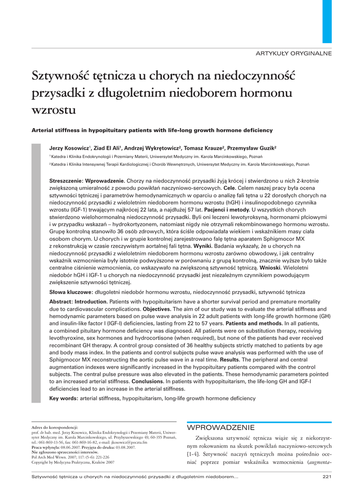 ARTYKUŁY ORYGINALNE Sztywność tętnicza u chorych na niedoczynność przysadki z długoletnim niedoborem hormonu wzrostu Arterial stiffness in hypopituitary patients with life-long growth hormone deficiency Jerzy Kosowicz1, Ziad El Ali1, Andrzej Wykrętowicz², Tomasz Krauze², Przemysław Guzik² 1 Katedra i Klinika Endokrynologii i Przemiany Materii, Uniwersytet Medyczny im. Karola Marcinkowskiego, Poznań 2 Katedra i Klinika Intensywnej Terapii Kardiologicznej i Chorób Wewnętrznych, Uniwersytet Medyczny im. Karola Marcinkowskiego, Poznań Streszczenie: Wprowadzenie. Chorzy na niedoczynność przysadki żyją krócej i stwierdzono u nich 2-krotnie zwiększoną umieralność z powodu powikłań naczyniowo-sercowych. Cele. Celem naszej pracy była ocena sztywności tętniczej i parametrów hemodynamicznych w oparciu o analizę fali tętna u 22 dorosłych chorych na niedoczynność przysadki z wieloletnim niedoborem hormonu wzrostu (hGH) i insulinopodobnego czynnika wzrostu (IGF-1) trwającym najkrócej 22 lata, a najdłużej 57 lat. Pacjenci i metody. U wszystkich chorych stwierdzono wielohormonalną niedoczynność przysadki. Byli oni leczeni lewotyroksyną, hormonami płciowymi i w przypadku wskazań – hydrokortyzonem, natomiast nigdy nie otrzymali rekombinowanego hormonu wzrostu. Grupę kontrolną stanowiło 36 osób zdrowych, która ściśle odpowiadała wiekiem i wskaźnikiem masy ciała osobom chorym. U chorych i w grupie kontrolnej zarejestrowano falę tętna aparatem Sphigmocor MX z rekonstrukcją w czasie rzeczywistym aortalnej fali tętna. Wyniki. Badania wykazały, że u chorych na niedoczynność przysadki z wieloletnim niedoborem hormonu wzrostu zarówno obwodowy, i jak centralny wskaźnik wzmocnienia były istotnie podwyższone w porównaniu z grupą kontrolną, znacznie wyższe było także centralne ciśnienie wzmocnienia, co wskazywało na zwiększoną sztywność tętniczą. Wnioski. Wieloletni niedobór hGH i IGF-1 u chorych na niedoczynność przysadki jest niezależnym czynnikiem powodującym zwiększenie sztywności tętniczej. Słowa kluczowe: długoletni niedobór hormonu wzrostu, niedoczynność przysadki, sztywność tętnicza Abstract: Introduction. Patients with hypopituitarism have a shorter survival period and premature mortality due to cardiovascular complications. Objectives. The aim of our study was to evaluate the arterial stiffness and hemodynamic parameters based on pulse wave analysis in 22 adult patients with long-life growth hormone (GH) and insulin-like factor I (IGF-I) deficiencies, lasting from 22 to 57 years. Patients and methods. In all patients, a combined pituitary hormone deficiency was diagnosed. All patients were on substitution therapy, receiving levothyroxine, sex hormones and hydrocortisone (when required), but none of the patients had ever received recombinant GH therapy. A control group consisted of 36 healthy subjects strictly matched to patients by age and body mass index. In the patients and control subjects pulse wave analysis was performed with the use of Sphigmocor MX reconstructing the aortic pulse wave in a real time. Results. The peripheral and central augmentation indexes were significantly increased in the hypopituitary patients compared with the control subjects. The central pulse pressure was also elevated in the patients. These hemodynamic parameters pointed to an increased arterial stiffness. Conclusions. In patients with hypopituitarism, the life-long GH and IGF-I deficiencies lead to an increase in the arterial stiffness. Key words: arterial stiffness, hypopituitarism, long-life growth hormone deficiency Adres do korespondencji: prof. dr hab. med. Jerzy Kosowicz, Klinika Endokrynologii i Przemiany Materii, Uniwersytet Medyczny im. Karola Marcinkowskiego, ul. Przybyszewskiego 49, 60-355 Poznań, tel.: 061-869-13-56, fax: 061-869-16-82, e-mail: [email protected] Praca wpłynęła: 08.06.2007. Przyjęta do druku: 03.08.2007. Nie zgłoszono sprzeczności interesów. Pol Arch Med Wewn. 2007; 117: (5-6): 221-226 Copyright by Medycyna Praktyczna, Kraków 2007 WPROWADZENIE Zwiększona sztywność tętnicza wiąże się z niekorzystnym rokowaniem na skutek powikłań naczyniowo-sercowych [1-4]. Sztywność naczyń tętniczych można pośrednio oceniać poprzez pomiar wskaźnika wzmocnienia (augmenta- Sztywność tętnicza u chorych na niedoczynność przysadki z długoletnim niedoborem... 221 ARTYKUŁY ORYGINALNE tion index) lub ciśnienia wzmocnienia (augmentation pressure). Przebudowa ścian naczyń tętniczych doprowadza do utraty sprężystości tętnic. Wiąże się to ze wzrostem różnicy między ciśnieniem skurczowym i rozkurczowym. Sztywność tętniczą można zmierzyć pośrednio za pomocą analizy fali tętna. Wskaźnik wzmocnienia oraz łatwo oceniane ciśnienie tętna są miarami sztywności tętniczej i mogą wskazywać na zwiększone ryzyko naczyniowo-sercowe [5-7]. U dorosłych z wieloletnim niedoborem hormonu wzrostu (hGH) wcześniej występują czynniki ryzyka chorób sercowonaczyniowych: często stwierdza się podwyższone ciśnienie tętnicze, insulinooporność, zaburzenia gospodarki lipidowej, podwyższenie stężenia cholesterolu całkowitego, głównie frakcji lipoprotein osocza o małej gęstości (LDL), obniżenie poziomu frakcji lipoprotein osocza o dużej gęstości i wzrost poziomu triglicerydów [8,9]. Nadwaga i otyłość, często ze wskaźnikiem masy ciała (BMI) powyżej 25 kg/m², występują u większości chorych z niedoczynnością przysadki [9]. W retrospektywnym badaniu dużych grup dorosłych z wielohormonalną niedoczynnością przysadki, trwającą od 4 do 15 lat, wykazano 2-krotnie zwiększoną śmiertelność z powodu powikłań naczyniowo-sercowych niż w populacji ogólnej [10]. W innej pracy Tomlinson i wsp. przeanalizowali dane dotyczące chorych z niedoczynnością przysadki i wykazali, że chorzy z wieloletnim niedoborem hGH mają mniejszy średni okres przeżycia niż