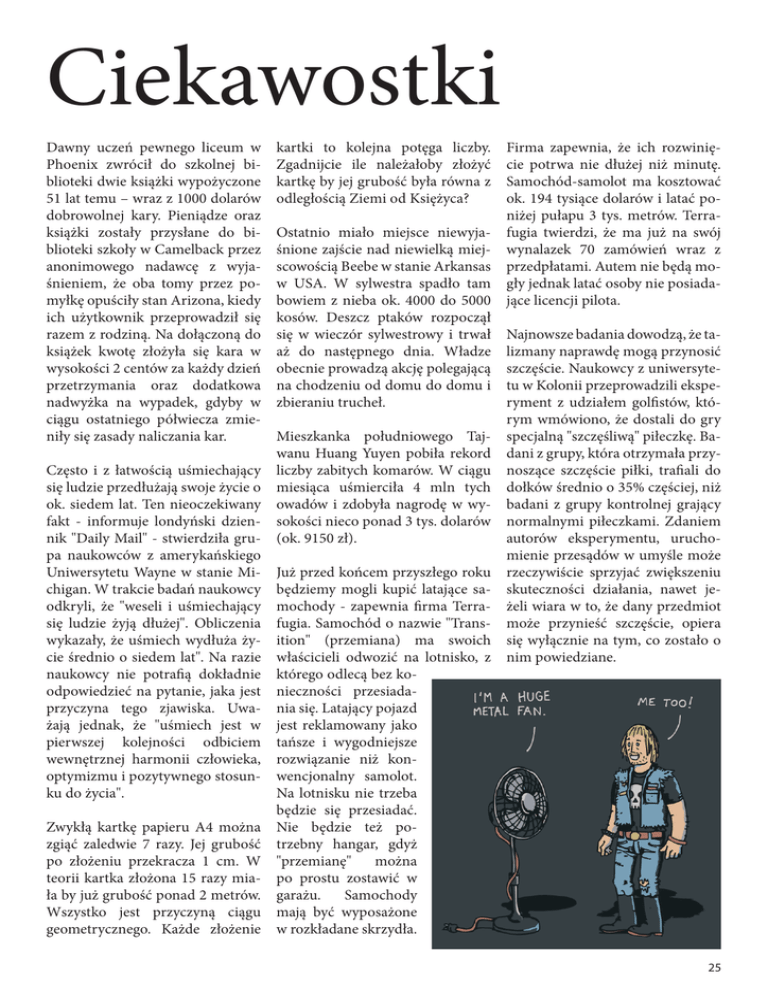 Ciekawostki Dawny uczeń pewnego liceum w Phoenix zwrócił do szkolnej biblioteki dwie książki wypożyczone 51 lat temu – wraz z 1000 dolarów dobrowolnej kary. Pieniądze oraz książki zostały przysłane do biblioteki szkoły w Camelback przez anonimowego nadawcę z wyjaśnieniem, że oba tomy przez pomyłkę opuściły stan Arizona, kiedy ich użytkownik przeprowadził się razem z rodziną. Na dołączoną do książek kwotę złożyła się kara w wysokości 2 centów za każdy dzień przetrzymania oraz dodatkowa nadwyżka na wypadek, gdyby w ciągu ostatniego półwiecza zmieniły się zasady naliczania kar. Często i z łatwością uśmiechający się ludzie przedłużają swoje życie o ok. siedem lat. Ten nieoczekiwany fakt - informuje londyński dziennik "Daily Mail" - stwierdziła grupa naukowców z amerykańskiego Uniwersytetu Wayne w stanie Michigan. W trakcie badań naukowcy odkryli, że "weseli i uśmiechający się ludzie żyją dłużej". Obliczenia wykazały, że uśmiech wydłuża życie średnio o siedem lat". Na razie naukowcy nie potrafią dokładnie odpowiedzieć na pytanie, jaka jest przyczyna tego zjawiska. Uważają jednak, że "uśmiech jest w pierwszej kolejności odbiciem wewnętrznej harmonii człowieka, optymizmu i pozytywnego stosunku do życia". Zwykłą kartkę papieru A4 można zgiąć zaledwie 7 razy. Jej grubość po złożeniu przekracza 1 cm. W teorii kartka złożona 15 razy miała by już grubość ponad 2 metrów. Wszystko jest przyczyną ciągu geometrycznego. Każde złożenie kartki to kolejna potęga liczby. Zgadnijcie ile należałoby złożyć kartkę by jej grubość była równa z odległością Ziemi od Księżyca? Firma zapewnia, że ich rozwinięcie potrwa nie dłużej niż minutę. Samochód-samolot ma kosztować ok. 194 tysiące dolarów i latać poniżej pułapu 3 tys. metrów. TerraOstatnio miało miejsce niewyja- fugia twierdzi, że ma już na swój śnione zajście nad niewielką miej- wynalazek 70 zamówień wraz z scowością Beebe w stanie Arkansas przedpłatami. Autem nie będą mow USA. W sylwestra spadło tam gły jednak latać osoby nie posiadabowiem z nieba ok. 4000 do 5000 jące licencji pilota. kosów. Deszcz ptaków rozpoczął się w wieczór sylwestrowy i trwał Najnowsze badania dowodzą, że taaż do następnego dnia. Władze lizmany naprawdę mogą przynosić obecnie prowadzą akcję polegającą szczęście. Naukowcy z uniwersytena chodzeniu od domu do domu i tu w Kolonii przeprowadzili ekspezbieraniu trucheł. ryment z udziałem golfistów, którym wmówiono, że dostali do gry Mieszkanka południowego Taj- specjalną "szczęśliwą" piłeczkę. Bawanu Huang Yuyen pobiła rekord dani z grupy, która otrzymała przyliczby zabitych komarów. W ciągu noszące szczęście piłki, trafiali do miesiąca uśmierciła 4 mln tych dołków średnio o 35% częściej, niż owadów i zdobyła nagrodę w wy- badani z grupy kontrolnej grający sokości nieco ponad 3 tys. dolarów normalnymi piłeczkami. Zdaniem (ok. 9150 zł). autorów eksperymentu, uruchomienie przesądów w umyśle może Już przed końcem przyszłego roku rzeczywiście sprzyjać zwiększeniu będziemy mogli kupić latające sa- skuteczności działania, nawet jemochody - zapewnia firma Terra- żeli wiara w to, że dany przedmiot fugia. Samochód o nazwie "Trans- może przynieść szczęście, opiera ition" (przemiana) ma swoich się wyłącznie na tym, co zostało o właścicieli odwozić na lotnisko, z nim powiedziane. którego odlecą bez konieczności przesiadania się. Latający pojazd jest reklamowany jako tańsze i wygodniejsze rozwiązanie niż konwencjonalny samolot. Na lotnisku nie trzeba będzie się przesiadać. Nie będzie też potrzebny hangar, gdyż "przemianę" można po prostu zostawić w garażu. Samochody mają być wyposażone w rozkładane skrzydła. 25